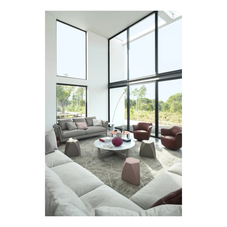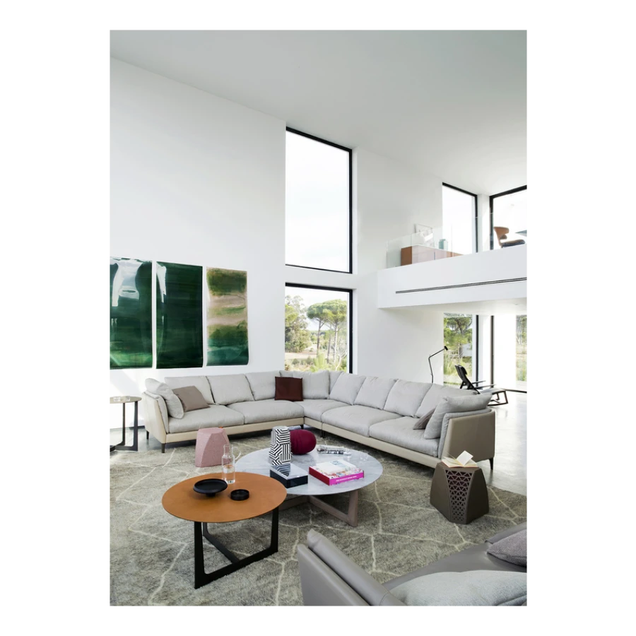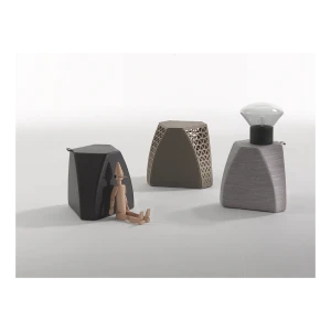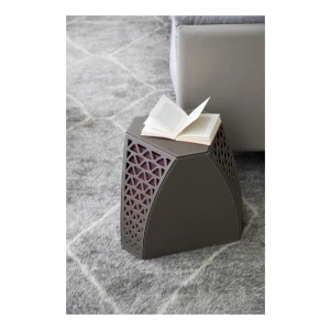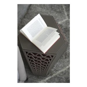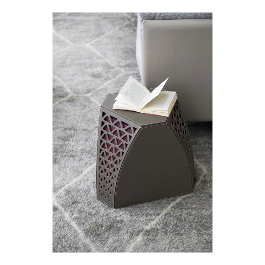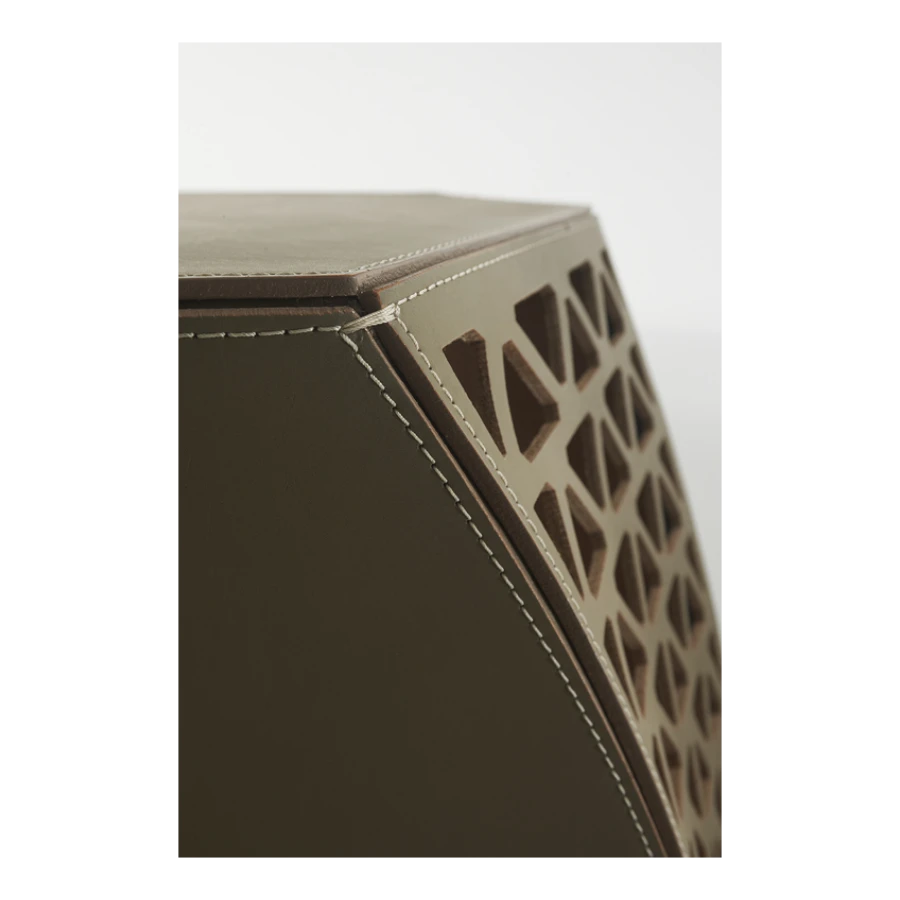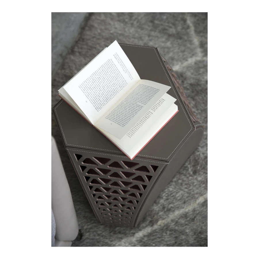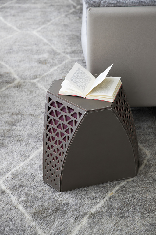 Virginia Harper designs Hudson: an elegant game of Chinese boxes, of solids and voids, of lightness and material. Hudson is a side table that contains another one. The first Hudson side table is a mini architectural design inspired by New York’s Freedom Tower. The hollow structure skilfully reproduces a hexagonal prism that extends towards the sky. The second pouf-side table fits perfectly in the cavity of the bigger table. A little leather or saddle-leather handle enables you to remove and move the pouf with ease and to use it alongside the other element or simply on its own.