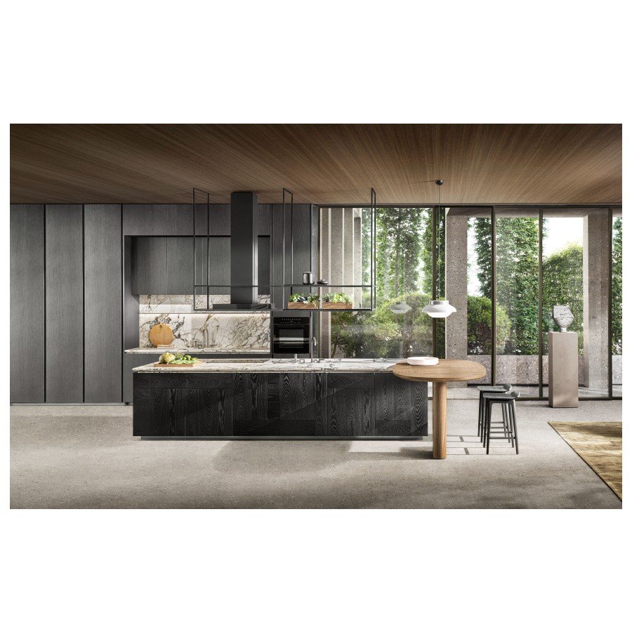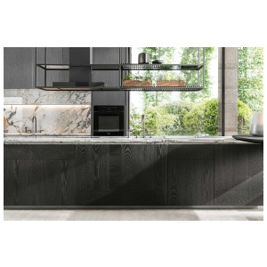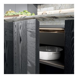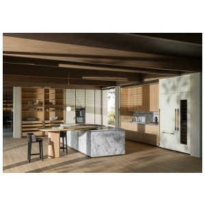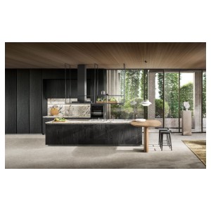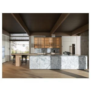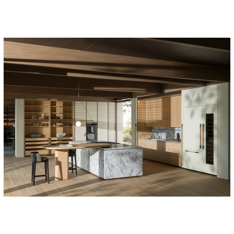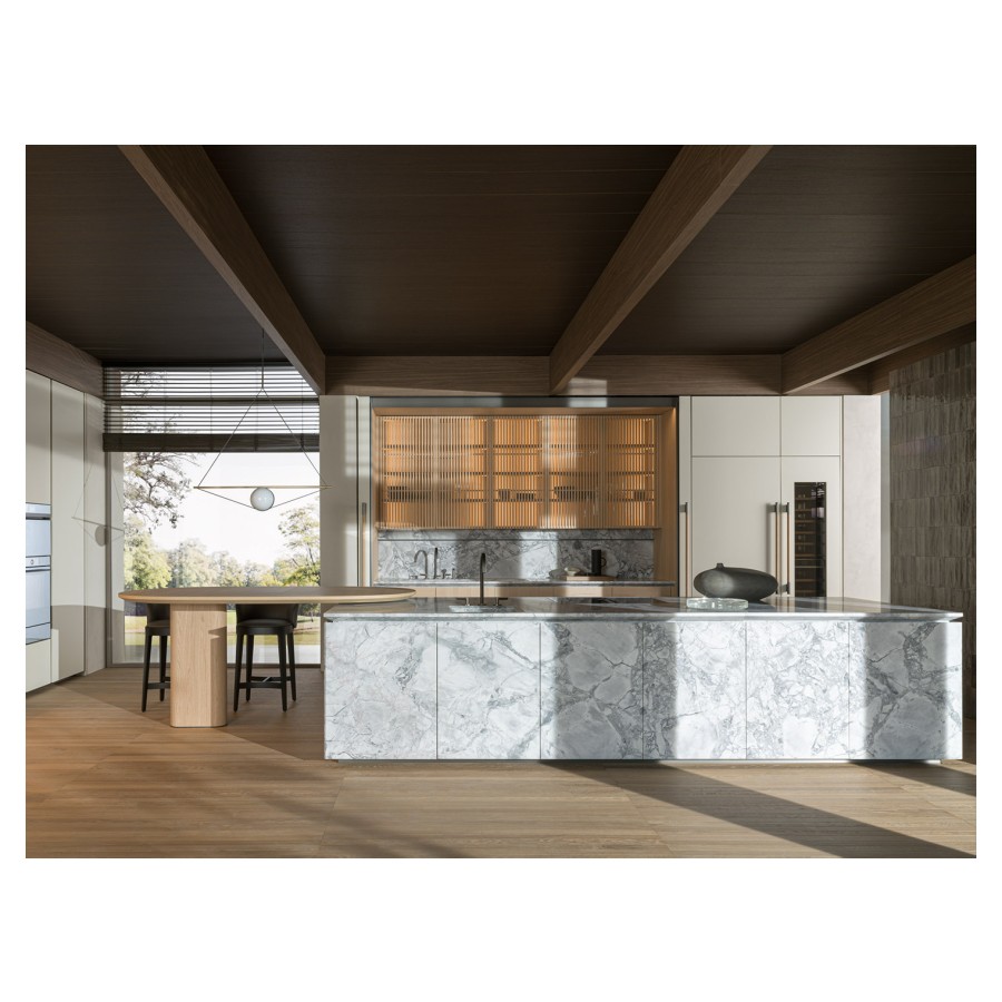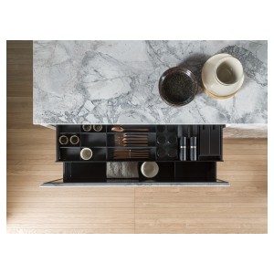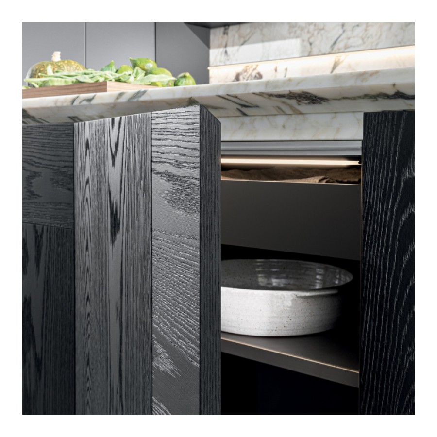These monomaterial “shells”, subsequently applied to alveolar aluminum panels, guarantee that they are light, stable and mechanically resistant, thereby allowing a door to be built all in one with the side panels of the island. And the material nature of natural stone, with its unique and unrepeatable look, enters our homes with a spectacular application.