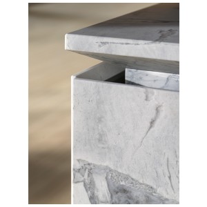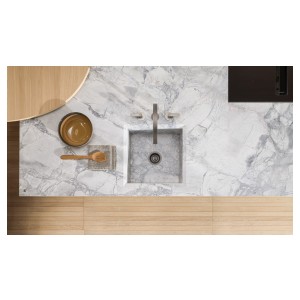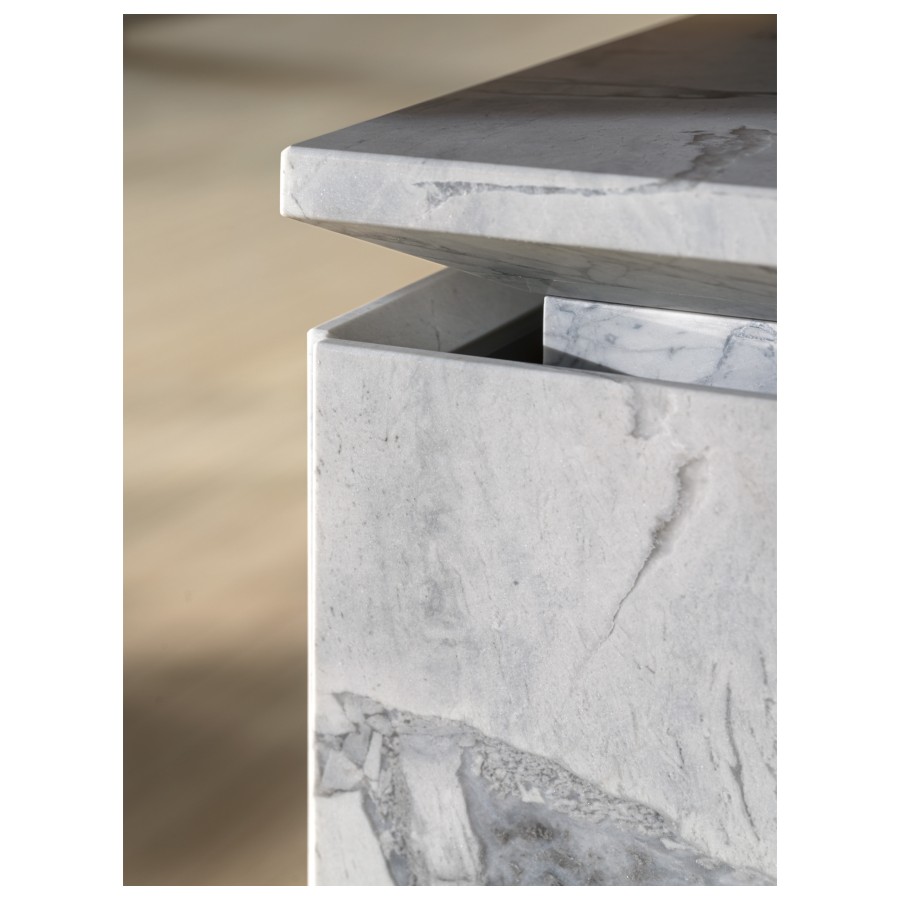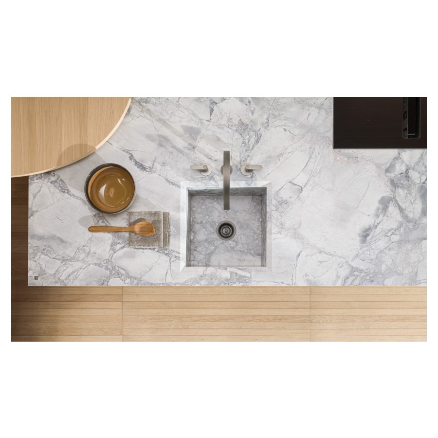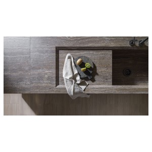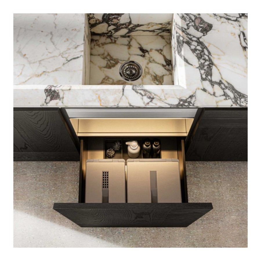 Firstly, this project implies choosing a material that fits the purpose, natural stone, with the unique characteristics that Nature bestows, and secondly, using innovative technologies to achieve it, as is deducible from the doors of the bases, which open effortlessly to guarantee the utmost functionality. The natural stone slabs are machined and excavated with high precision mechanical processes, so as to lighten the panels and guarantee them for domestic use.