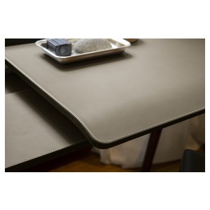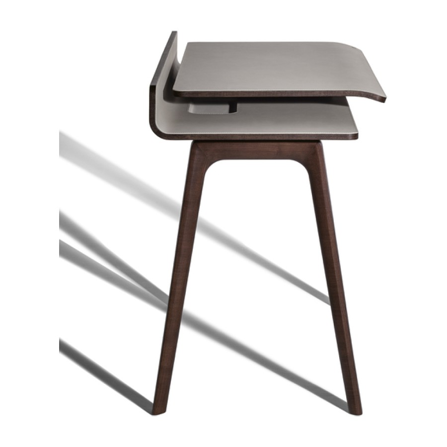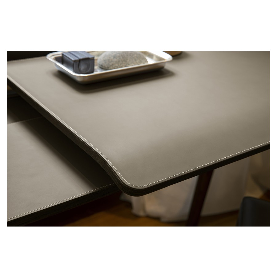 The work surface of the Iren desk increases from 119 cm to 149 cm when the sliding top is completely open. The visible wooden parts are in ash in either a Moka or Wenge stain. The desktops can be upholstered in leather or saddle-leather with tone-on-tone or contrast stitching around the edges. The Poltrona Frau logo is branded on the bottom right of the sliding surface.