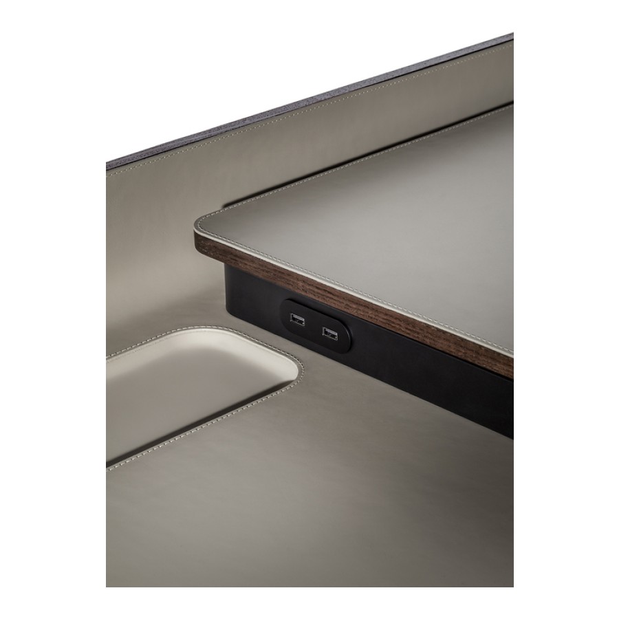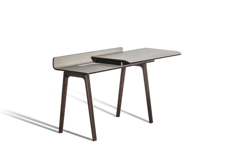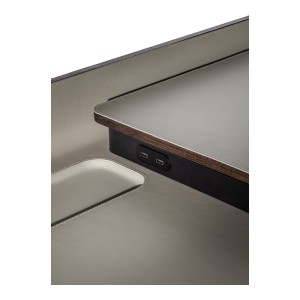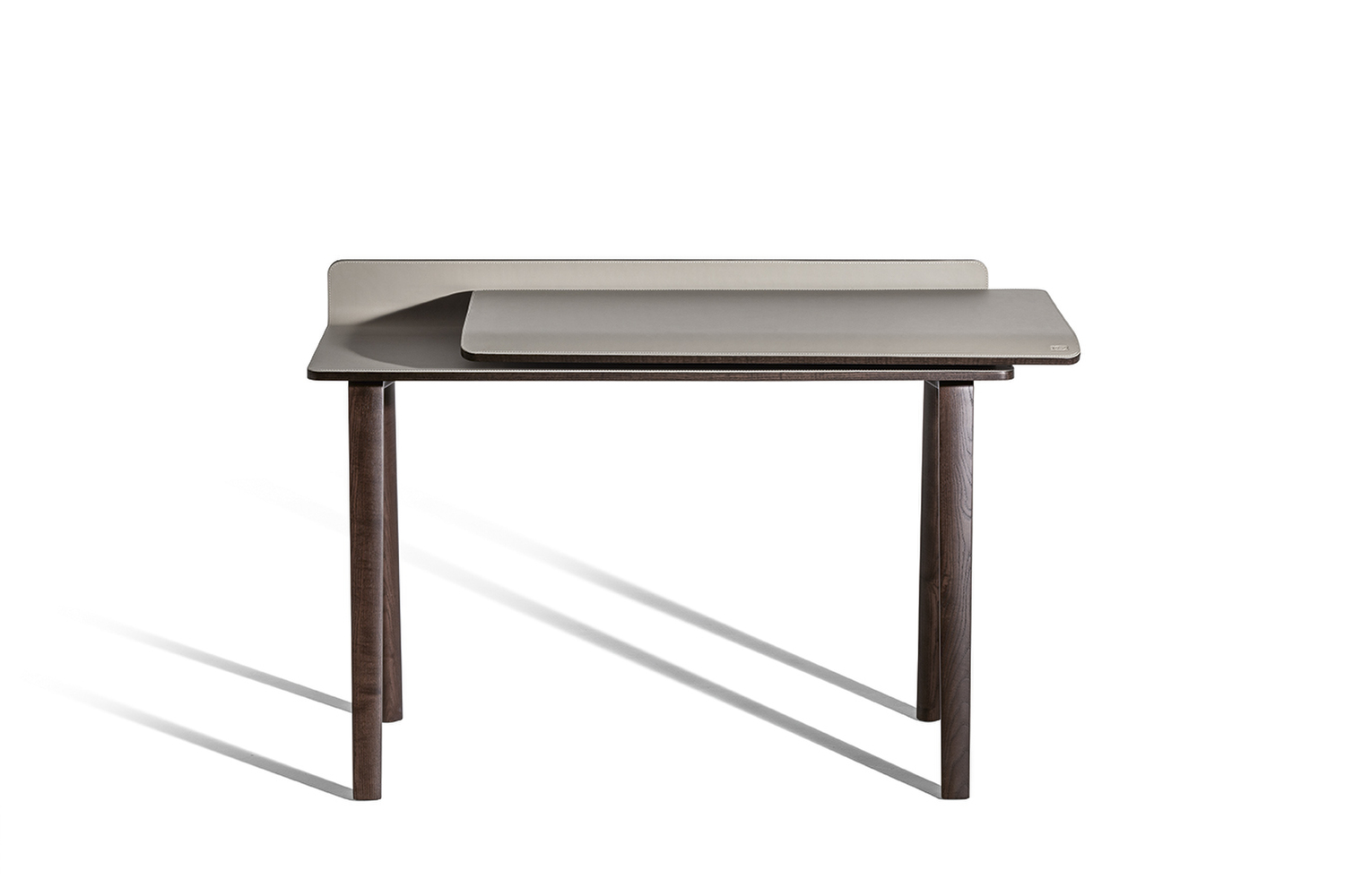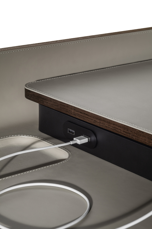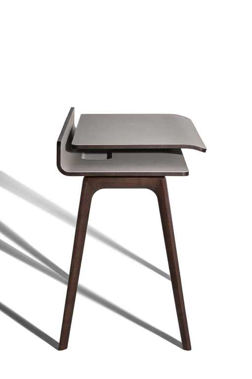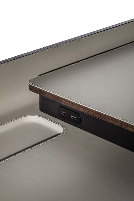 In the world of Japanese calligraphy there is an invisible but deliberate continuity between points, lines and characters called “iren” (意連). This continuous motion ensures that there is a perfect harmony between the symbols even though they appear divided. Even in an era like ours, so dominated by technology, the spirit of the Iren desk lies not only in its quest for beauty and simplicity but above all in its revival of a natural and harmonious action: a desk that gives rise to new work scenarios and rituals in a naturally fluid relationship between body and object. Designer Kensaku Oshiro envisaged the Iren desk as a small domestic workstation that easily adapts to modern lifestyles. Thanks to a simple motion, two overlapping surfaces slide over each other to create new work and storage spaces. The beauty of the desk is not diminished by its electronic connections: its recharging and USB points are located in a metallic black box that supports the upper surface, wrapped in an elegant leather or saddle-leather cover. The gently sloping upper surface ensures a softer feel while also providing better support for the forearms. The wall version can have an LED light fitted at the back so the desk can be used when the natural light starts to dim.