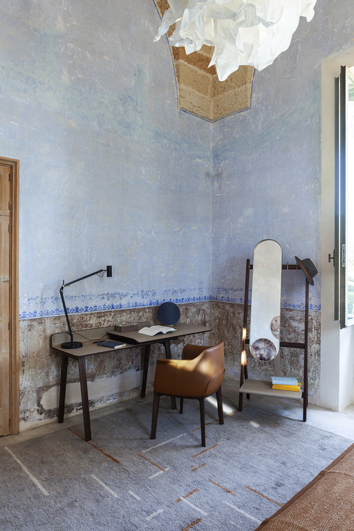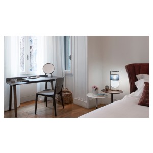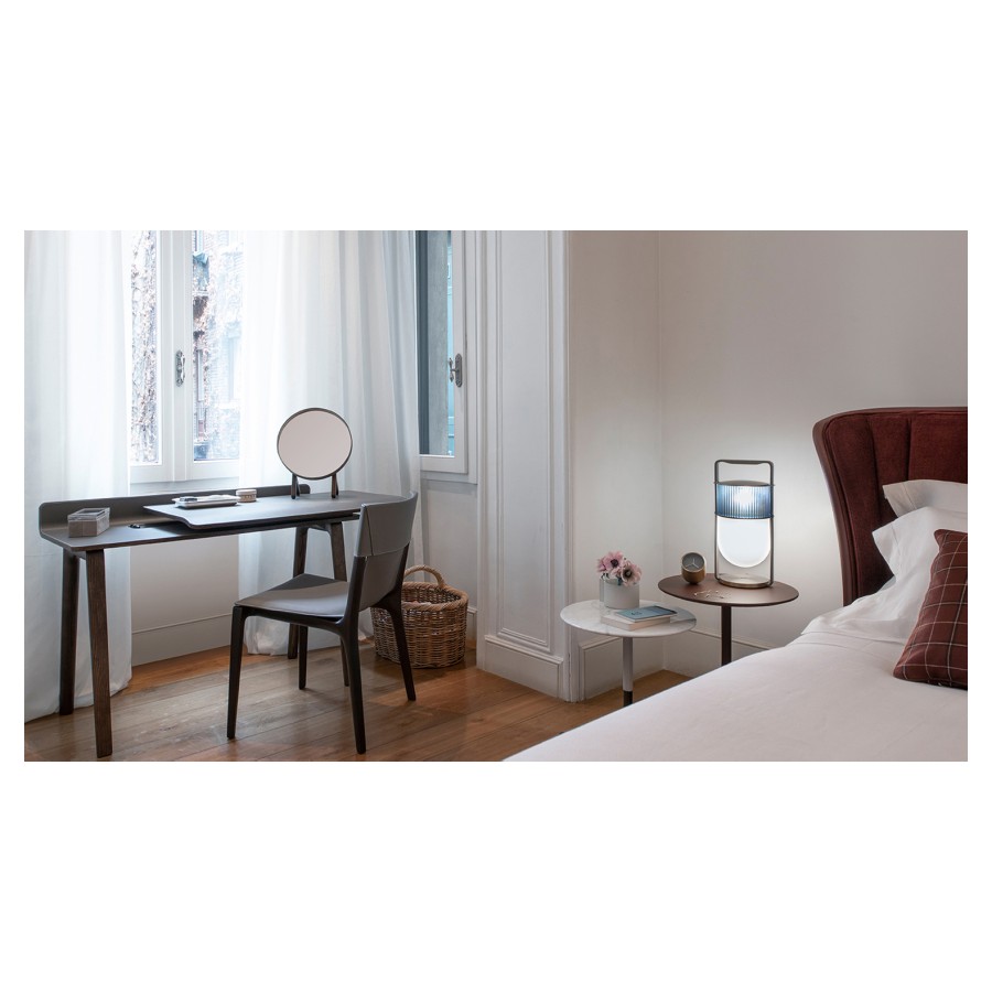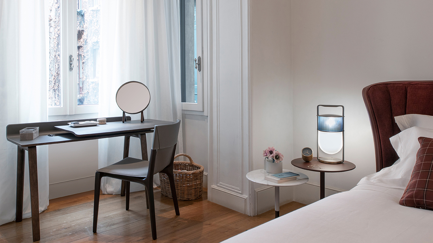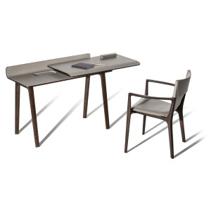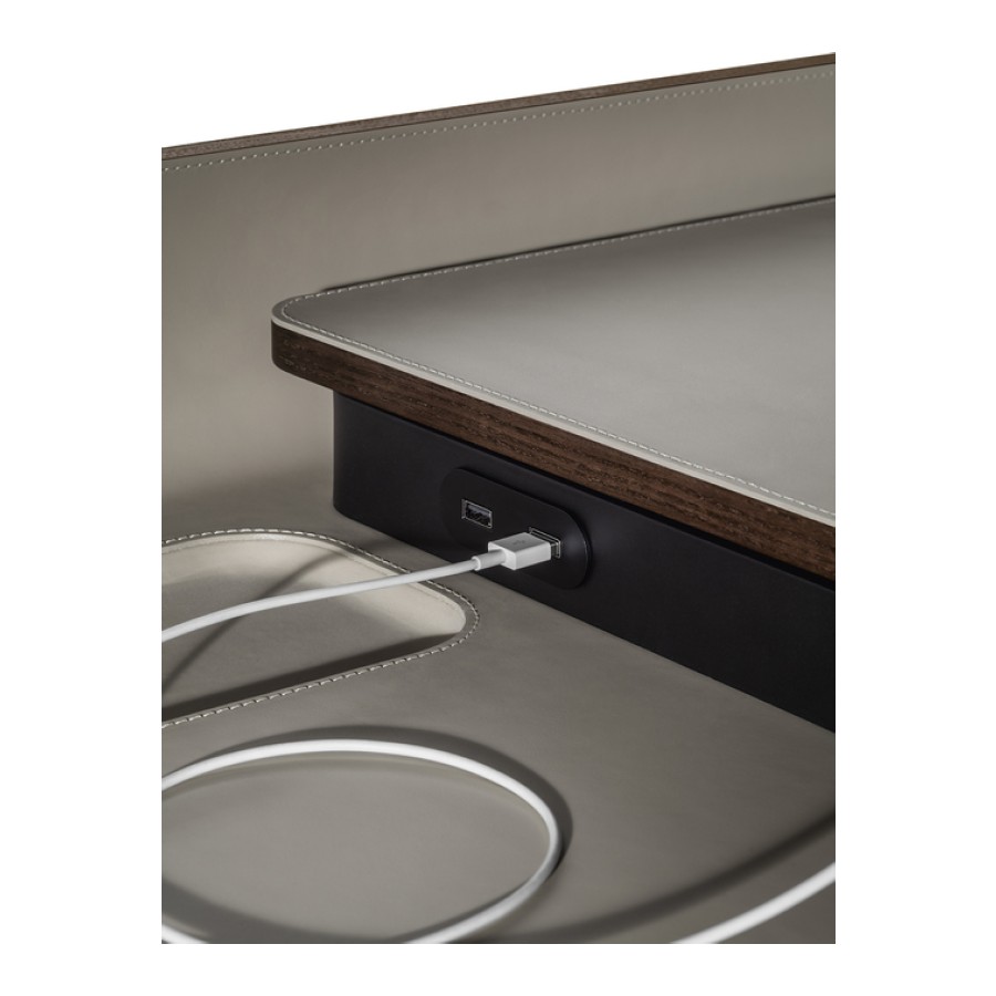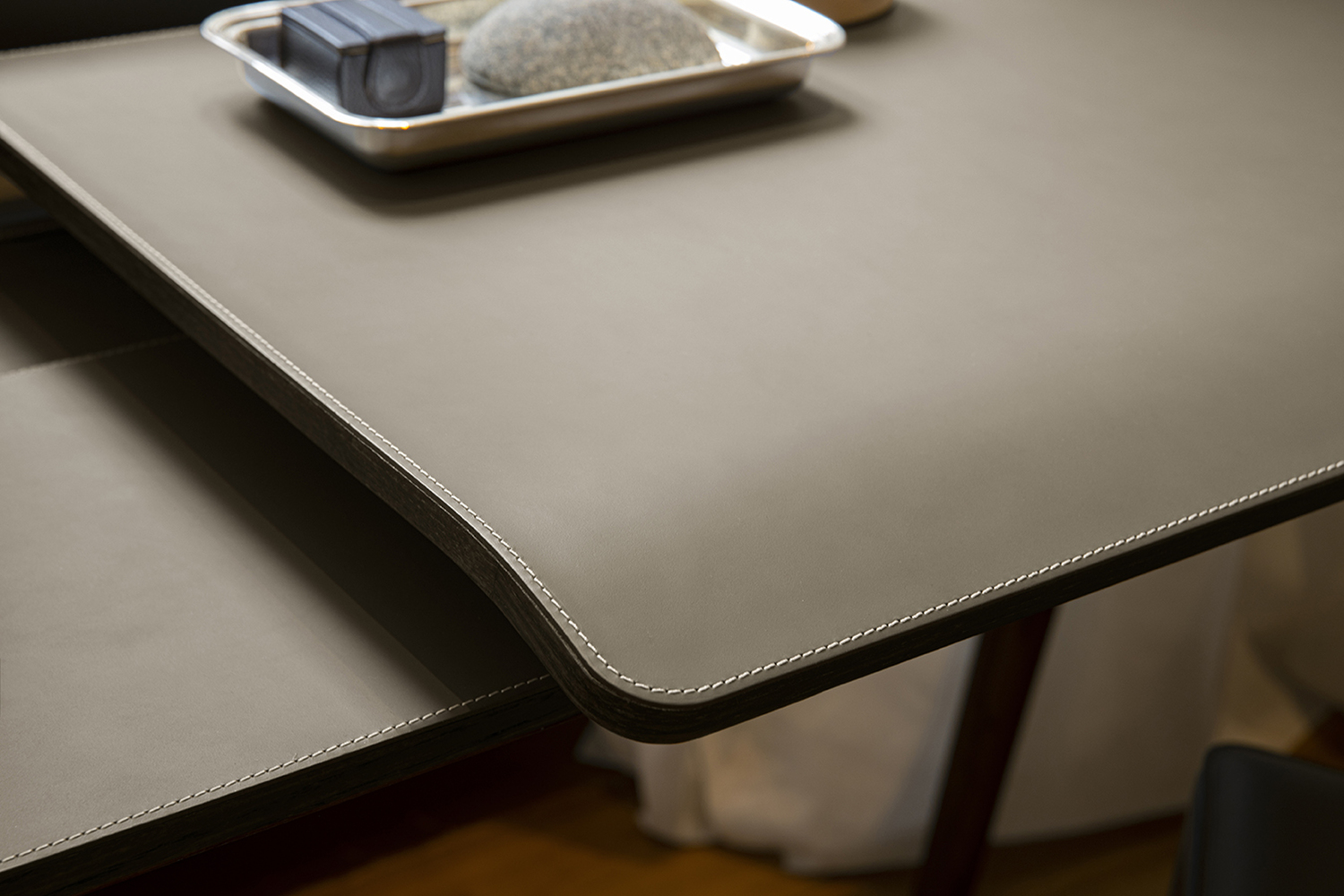 In the world of Japanese calligraphy there is an invisible but deliberate continuity between points, lines and characters called “iren” (意連). This continuous motion ensures that there is a perfect harmony between the symbols even though they appear divided. Even in an era like ours, so dominated by technology, the spirit of the Iren desk lies not only in its quest for beauty and simplicity but above all in its revival of a natural and harmonious action: a desk that gives rise to new work scenarios and rituals in a naturally fluid relationship between body and object. Designer Kensaku Oshiro envisaged the Iren desk as a small domestic workstation that easily adapts to modern lifestyles. Thanks to a simple motion, two overlapping surfaces slide over each other to create new work and storage spaces. The beauty of the desk is not diminished by its electronic connections: its recharging and USB points are located in a metallic black box that supports the upper surface, wrapped in an elegant leather or saddle-leather cover. The gently sloping upper surface ensures a softer feel while also providing better support for the forearms. The wall version can have an LED light fitted at the back so the desk can be used when the natural light starts to dim.