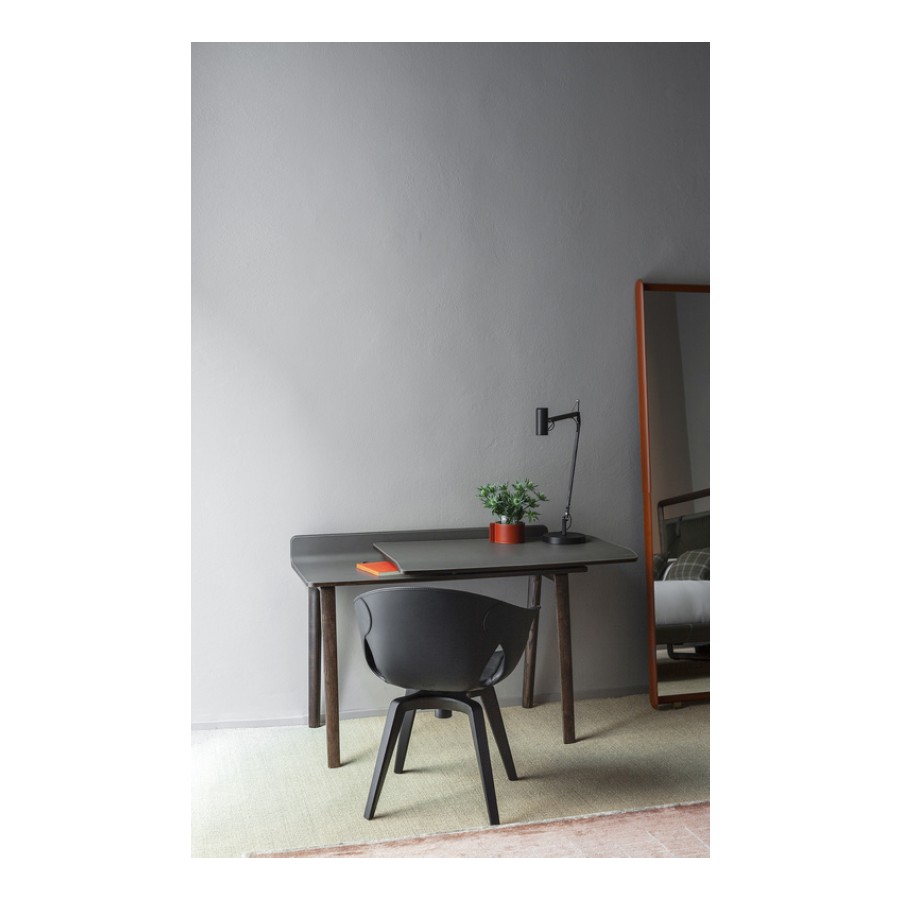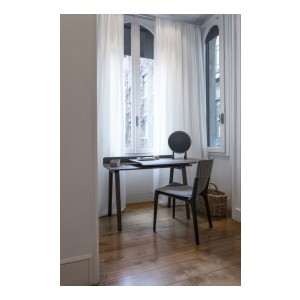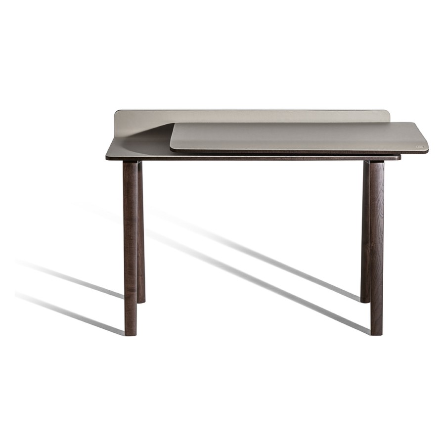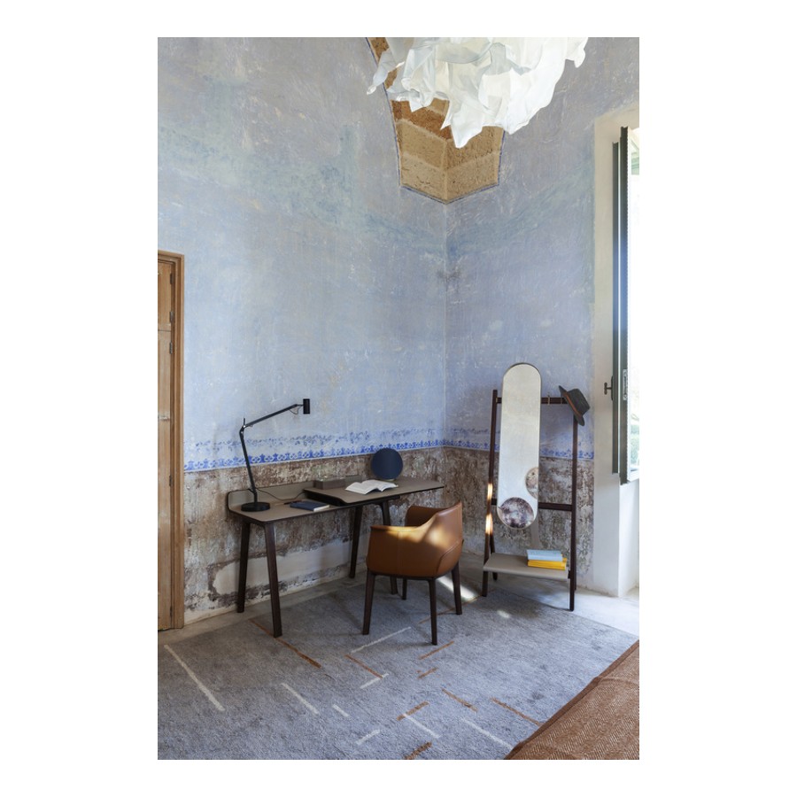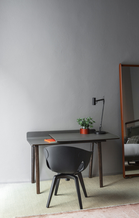 The Iren desk by Poltrona Frau comes in a free-standing version, with the desktop supported by a sawhorse base in solid ash, or a wall-mounted version, supported by brackets. The customer can choose whether the desktop slides left or right when making their order.