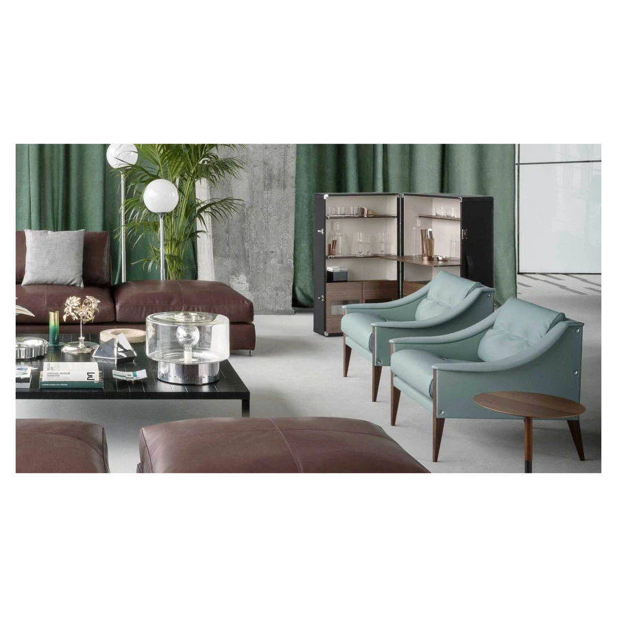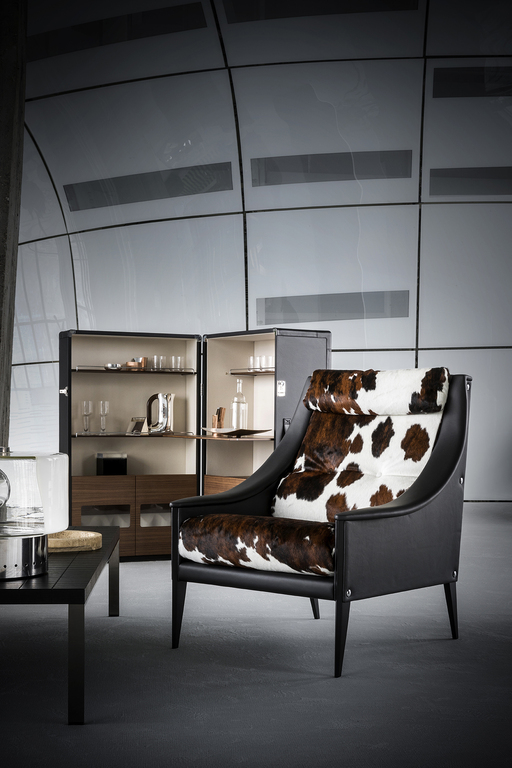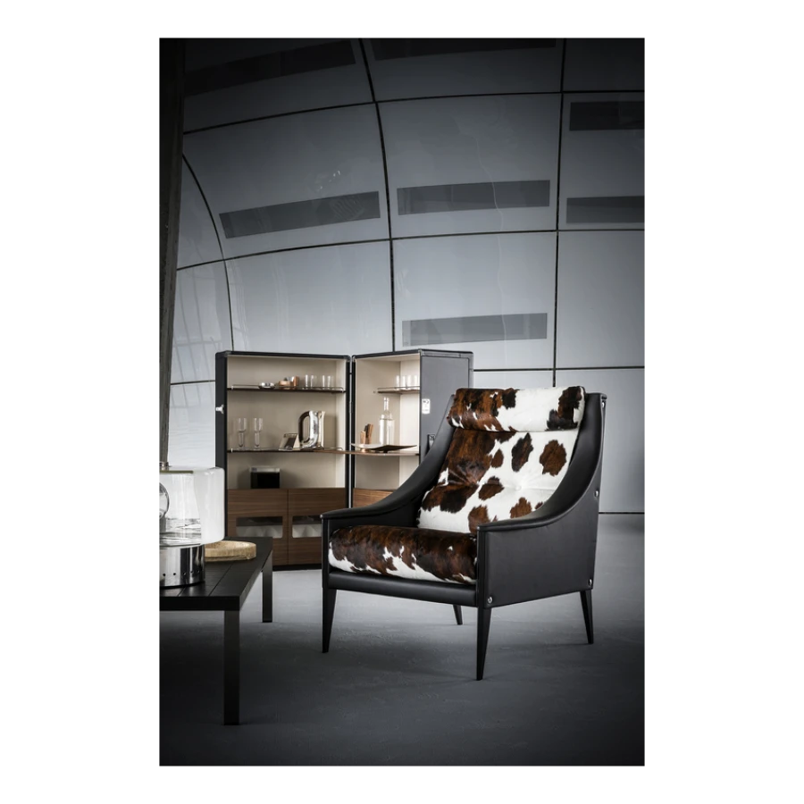The structure of the Isidoro mobile bar is made of poplar plywood panelling. The exterior upholstery is in saddle-leather while canvas elegantly decorates the inside walls. Shelves and drawers in poplar plywood with Canaletto walnut veneer. The glass and bottle holder compartments are enriched with mini chromium-plated metal railings. The feet are made of plastic: they have caps for the stationary part while the part that opens has swivel castors. A pair of click-to-close mechanisms with combination ensure the perfect closure of the cabinet.