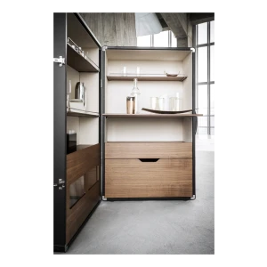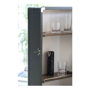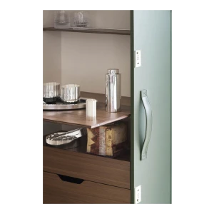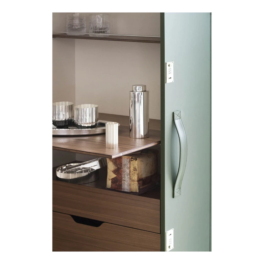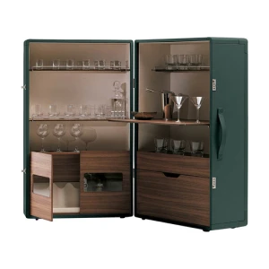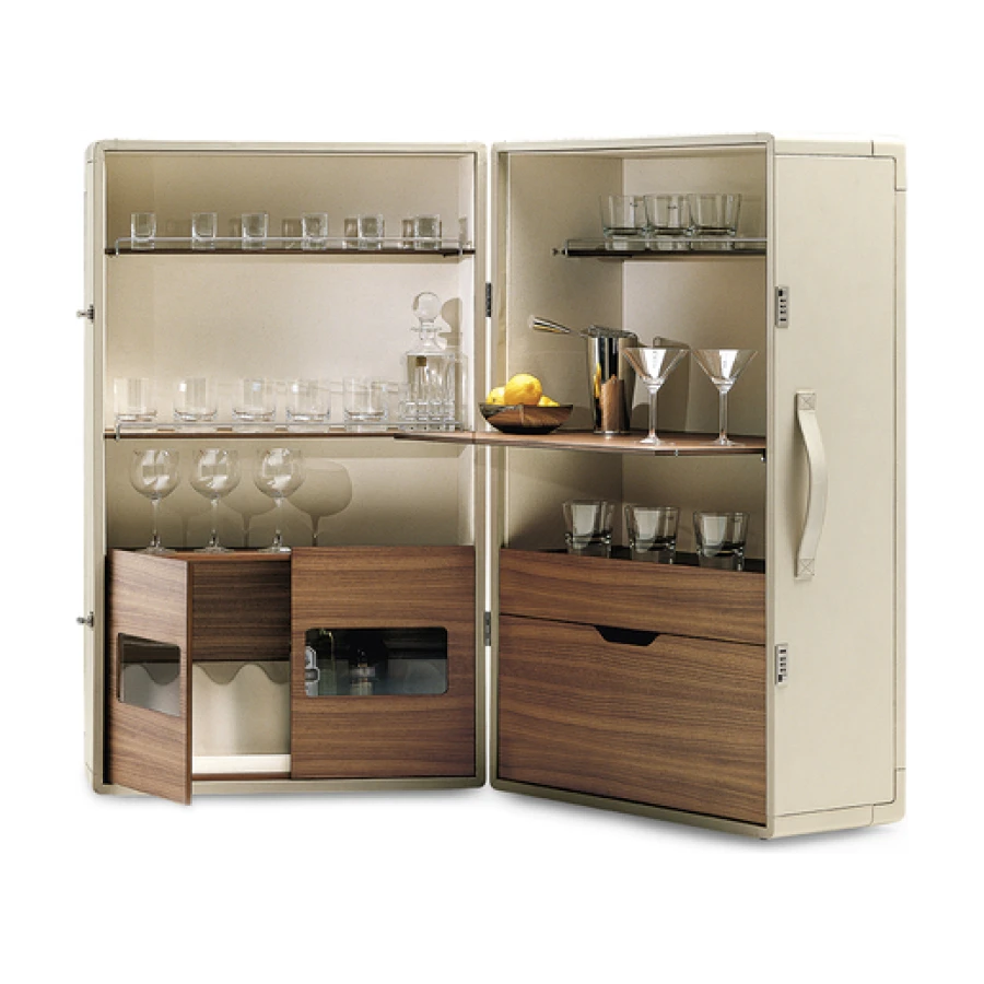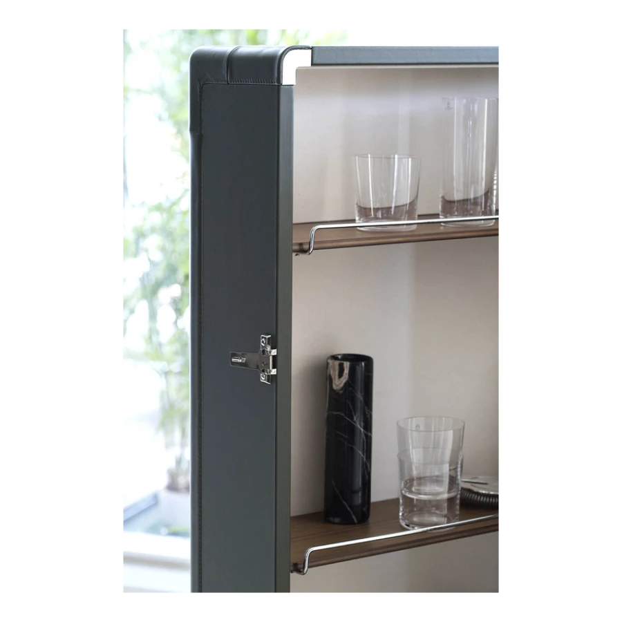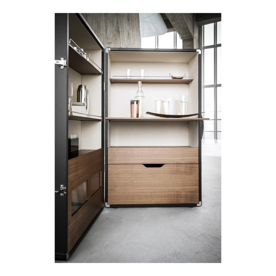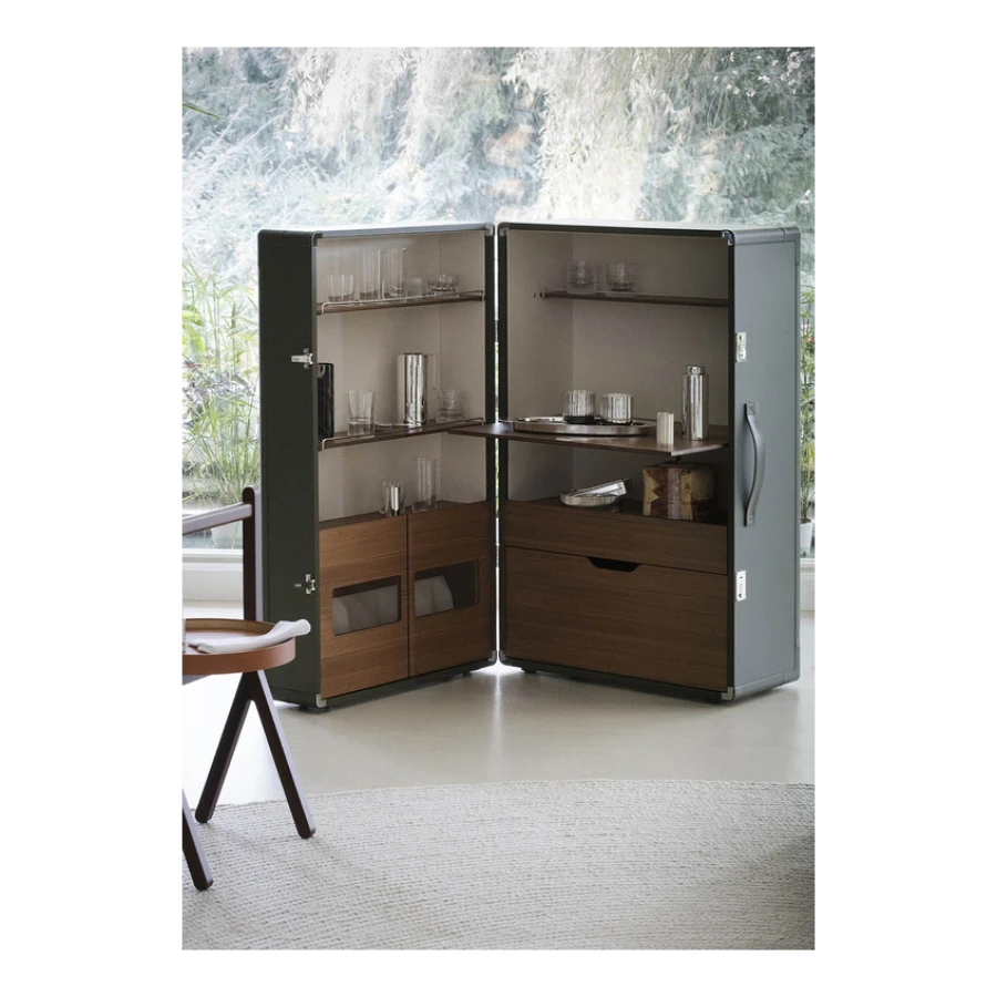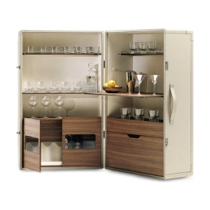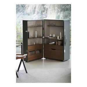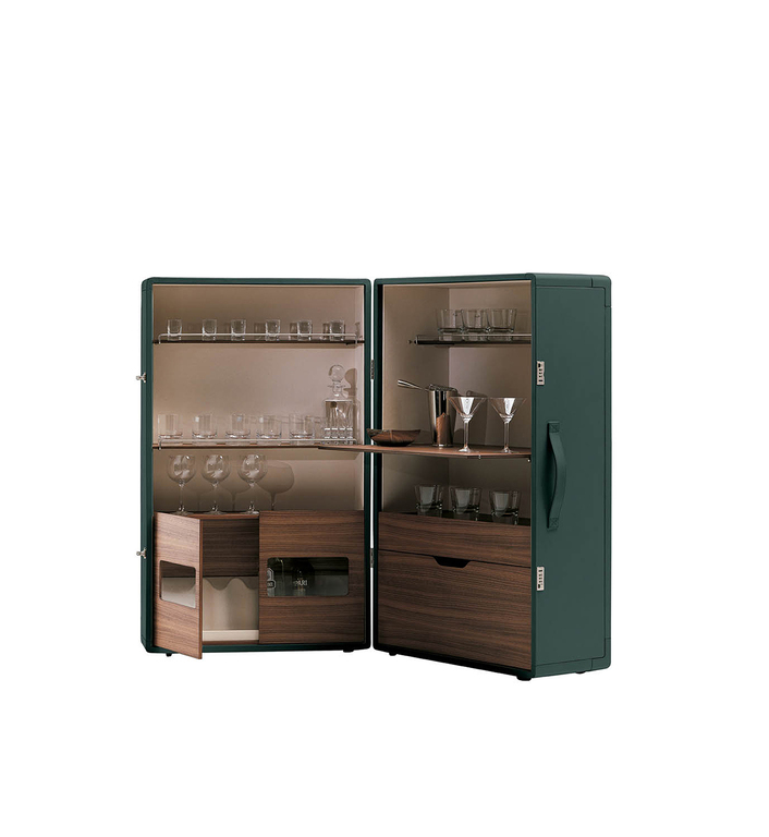 With the Isidoro mobile bar, cocktail hour returns to the home with a personal and convivial feel. A retro element given a contemporary makeover by Jean-Marie Massaud. Isidoro is an elegant cabinet on wheels that opens like a book. It has an external handle and click-to-close mechanism. A valuable item, made with fine materials and carefully studied down to the finest of details. The internal spaces are painstakingly constructed and include glass and bottle holder compartments with mini metal railings. A foldable shelf can be used as a practical worktop.