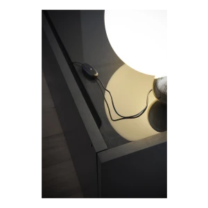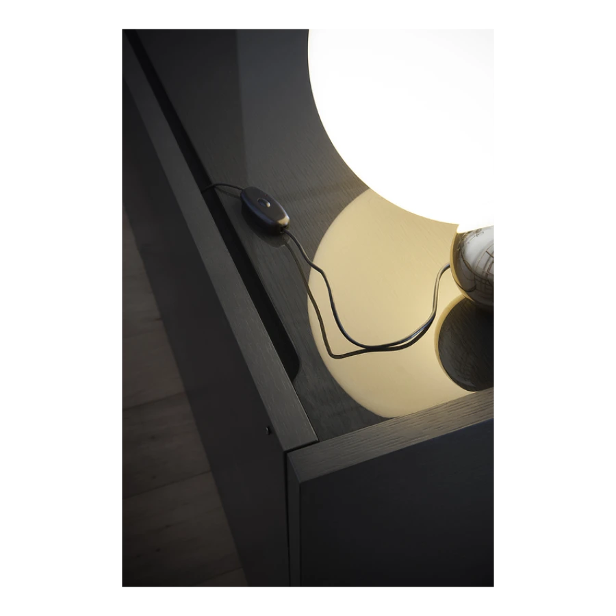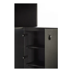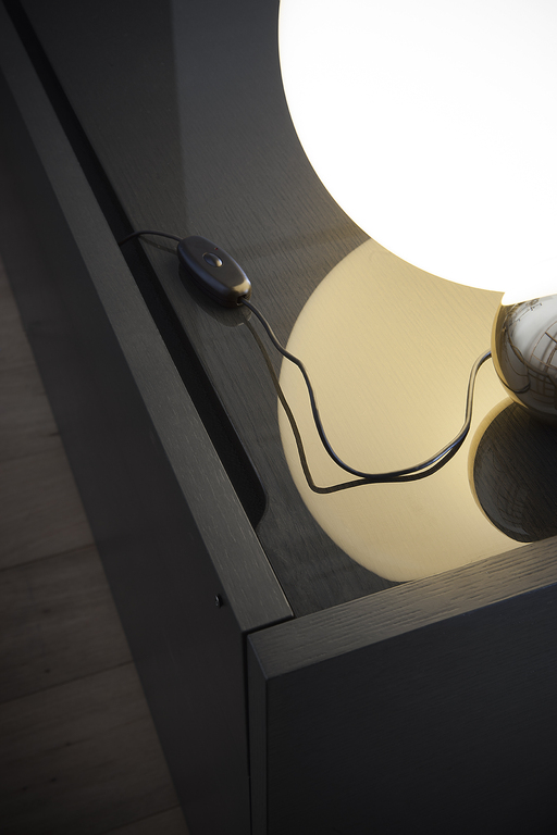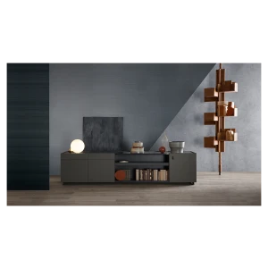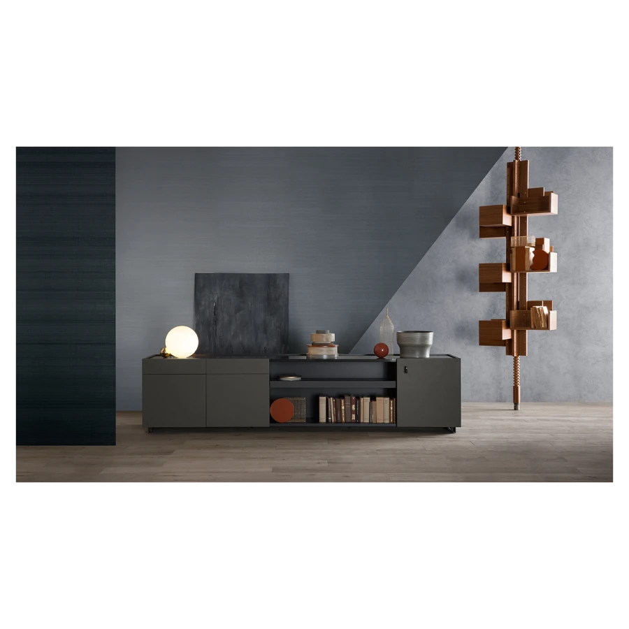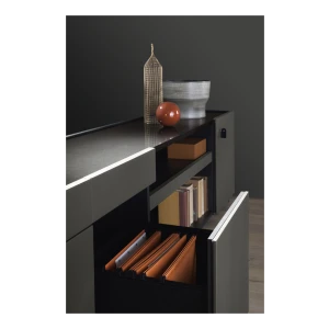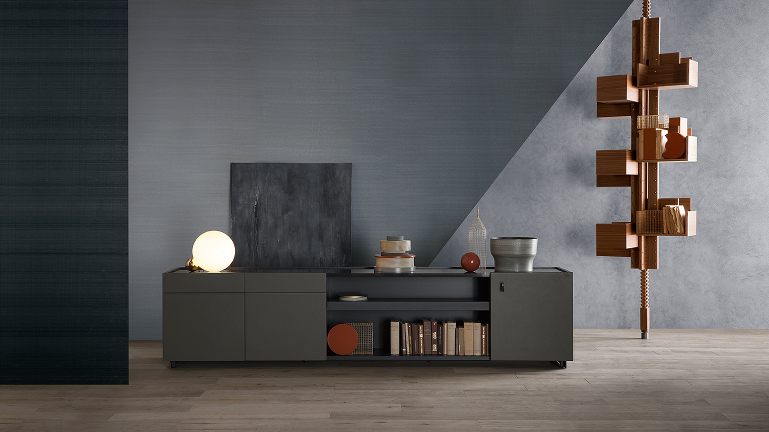 The structure of the Jobs Low Cabinets is in MDF panels with Lead or Tobacco oak veneer with glossy finish, with the exception of the top with its matt finish. The base is in lead-coloured brushed steel with adjustable feet and central connecting crossbar painted in scratchproof texturised black paint. The back of the Jobs Low Cabinet has a tilting door that accesses a little internal compartment that allows cables, which rise from the floor to the top, to pass through the slot that runs along the entire length of the surface. Jobs Low Cabinet is available in two lengths, 230 cm and 284 cm, both of which come in two different versions in terms of doors and drawers.