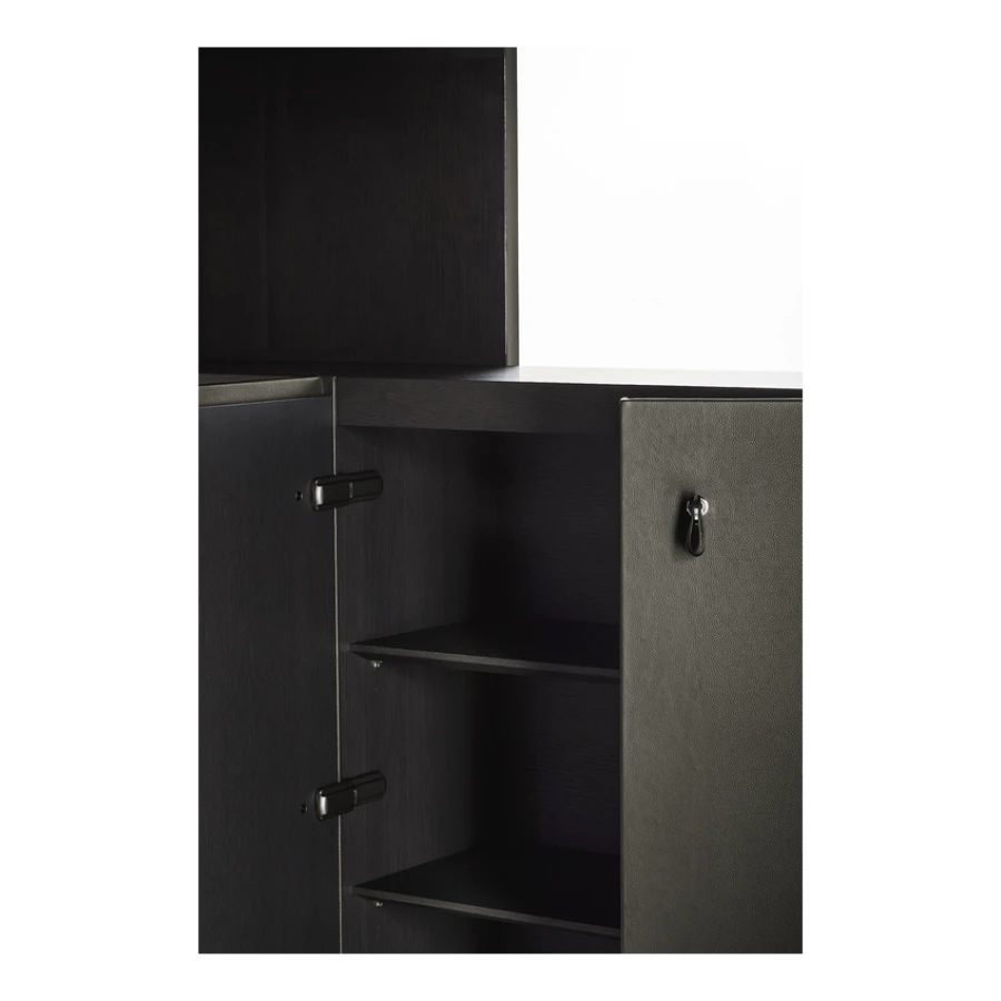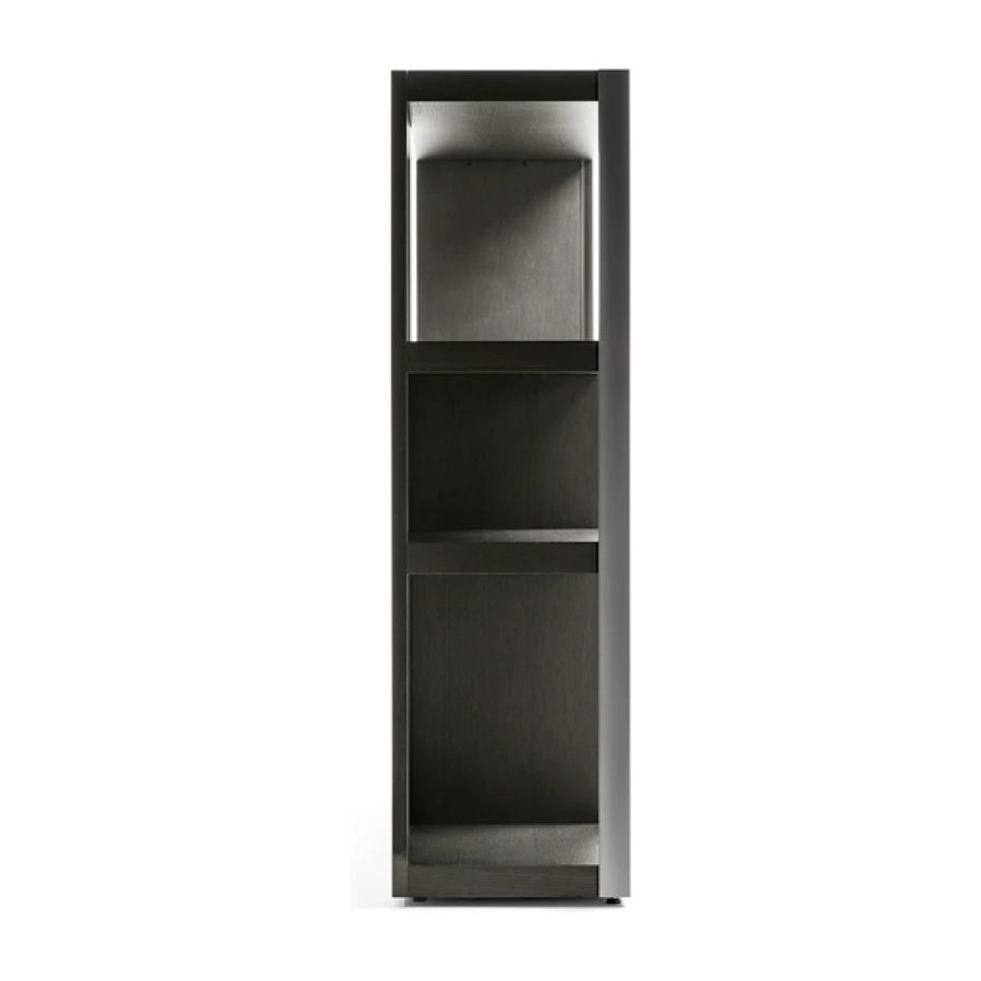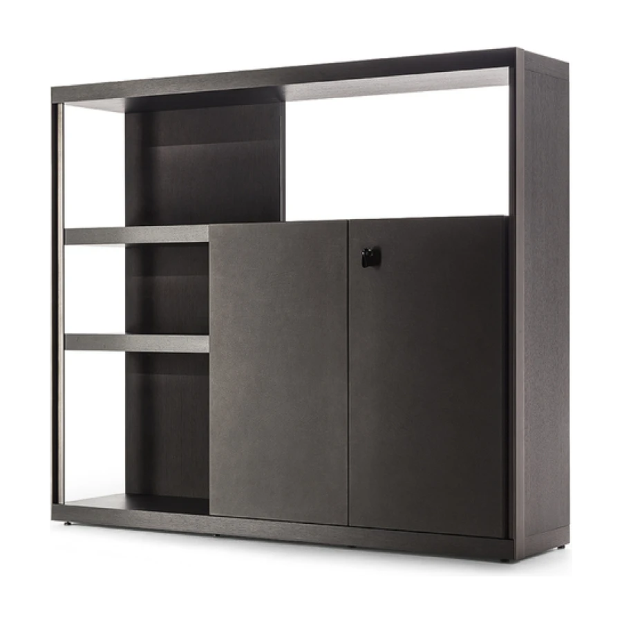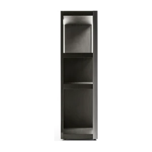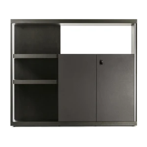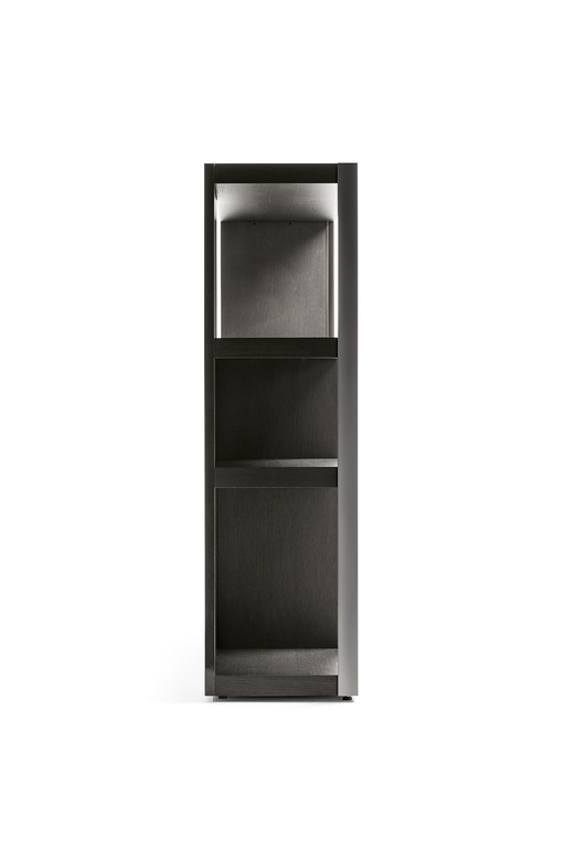 Jobs High Cabinet is both a storage unit and a bookcase, and alternates open compartments with shelves and compartments with doors. Perfect against a wall or in the centre of a room, it can also be used to define, divide and organise spaces. Like the rest of the collection, Jobs High Cabinet comes with sophisticated finishes and materials. Lead-coloured steel for the vertical uprights, with the characteristic T-section common to all Jobs elements. Pelle Frau® leather for the upholstery of the MDF doors. The same material for all of the other elements, shelves, compartments and rear panel: the oak veneer with lead or tobacco stain elegantly alternates glossy and matt surfaces.