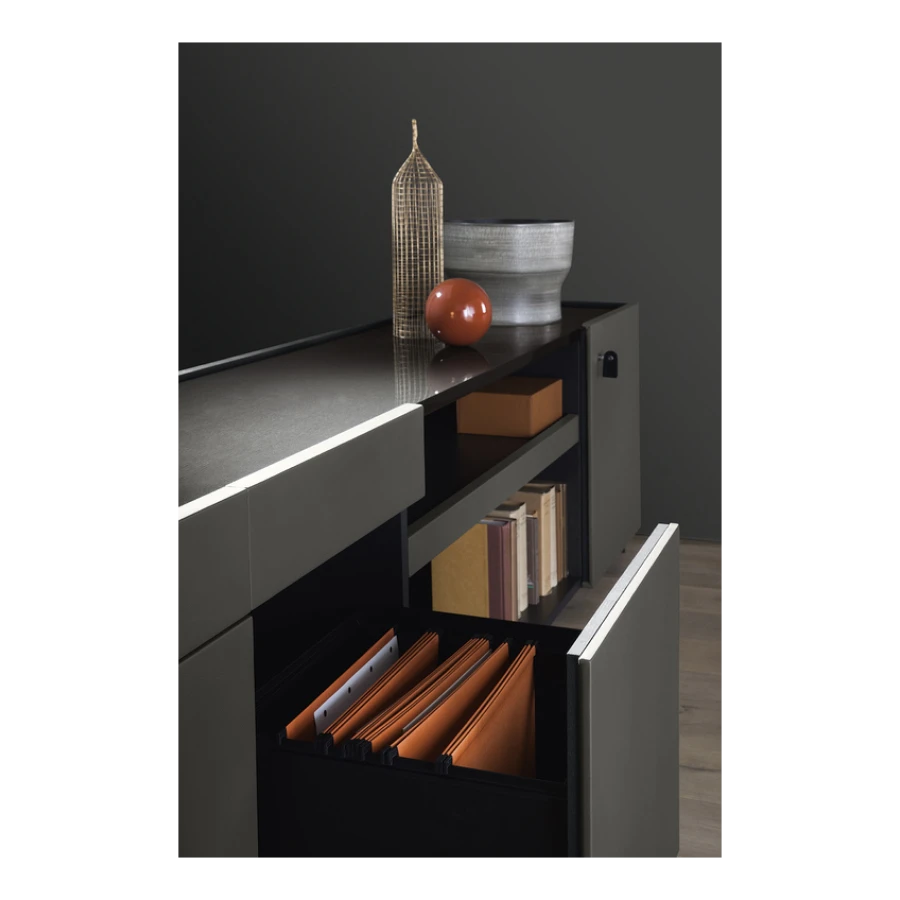 The structure of the Jobs Drawer Unit comes with a Lead or Tobacco oak veneer with glossy finish while the top has a matt finish. The base is finished with scratchproof texturised black paint and has four swivel castors. The Jobs Drawer Unit comes with two drawers with front covered in Pelle Frau® leather and internal structure finished with scratchproof texturised black paint. The drawers have a single lock positioned on the right side of the unit. The open compartment of the Jobs Drawer Unit is positioned on the opposite side to the drawers.