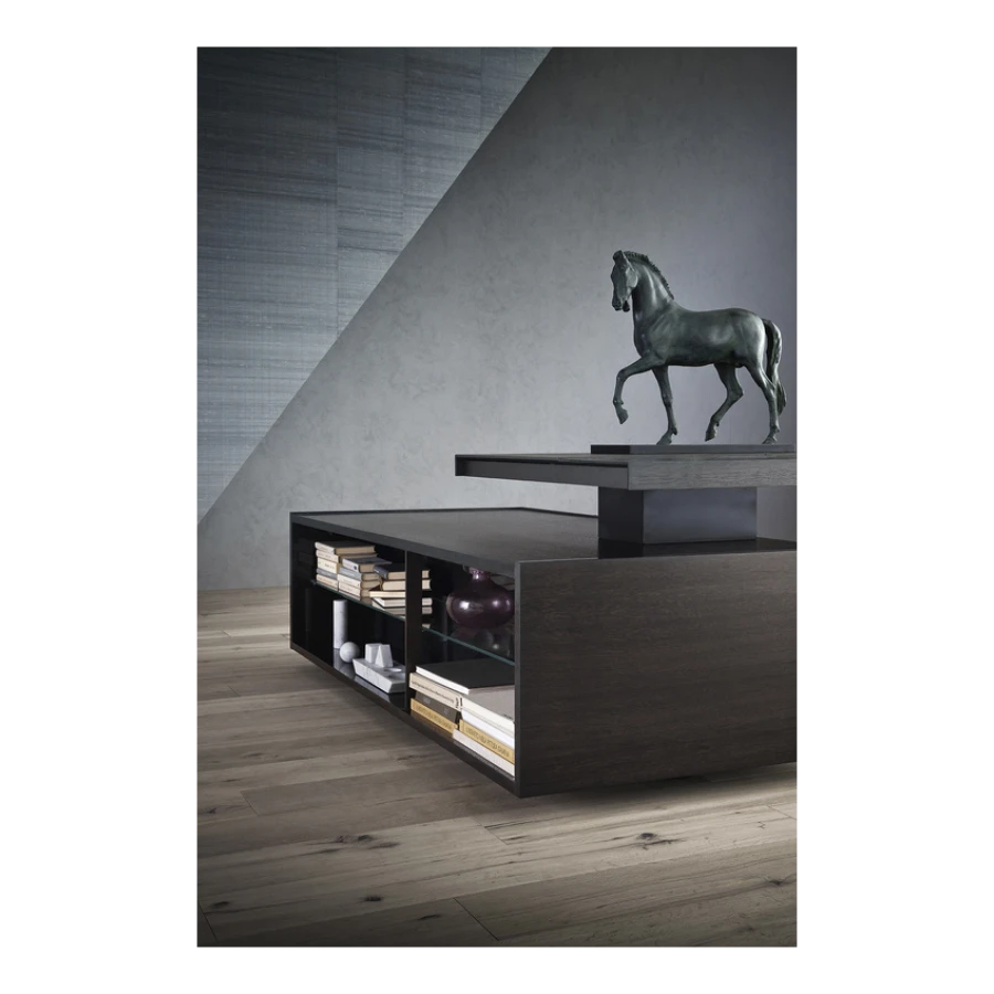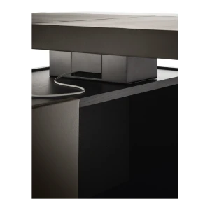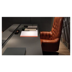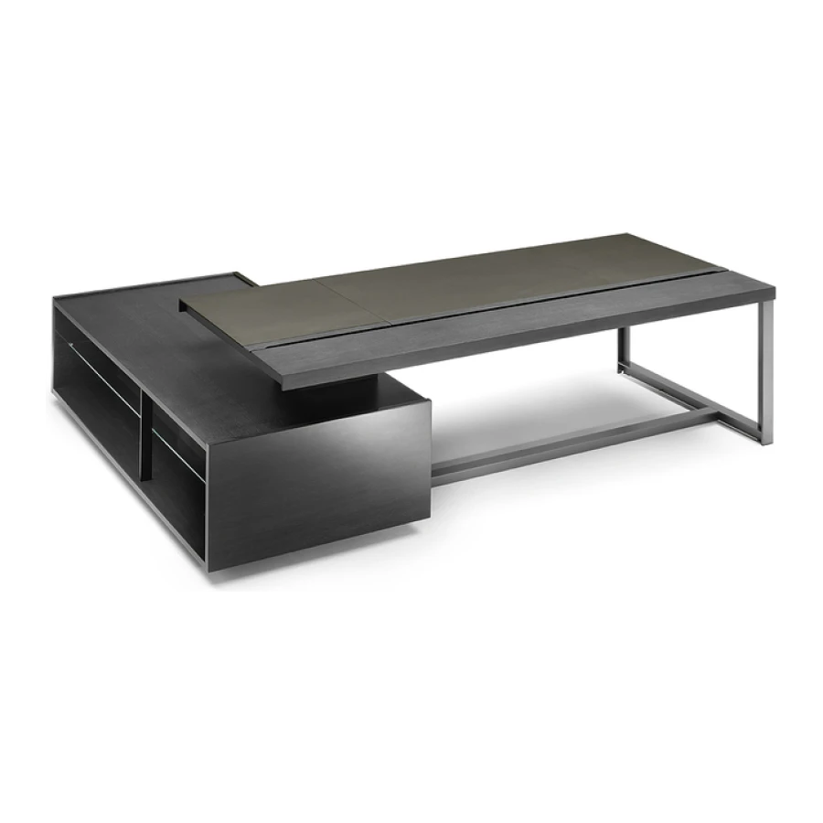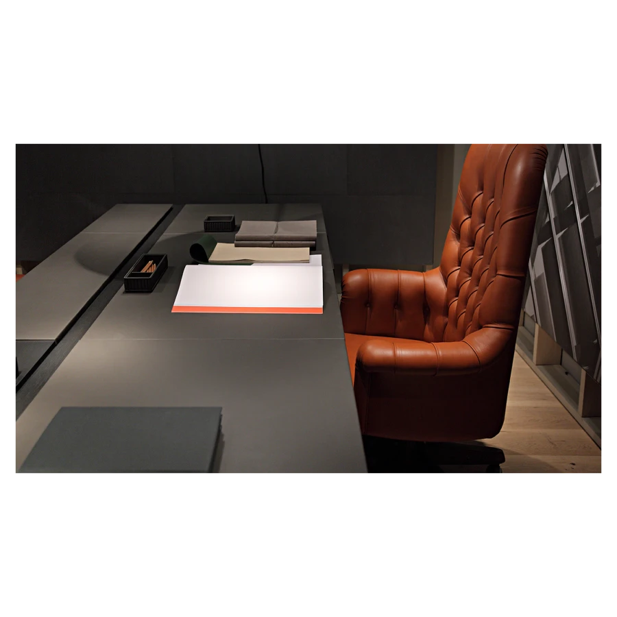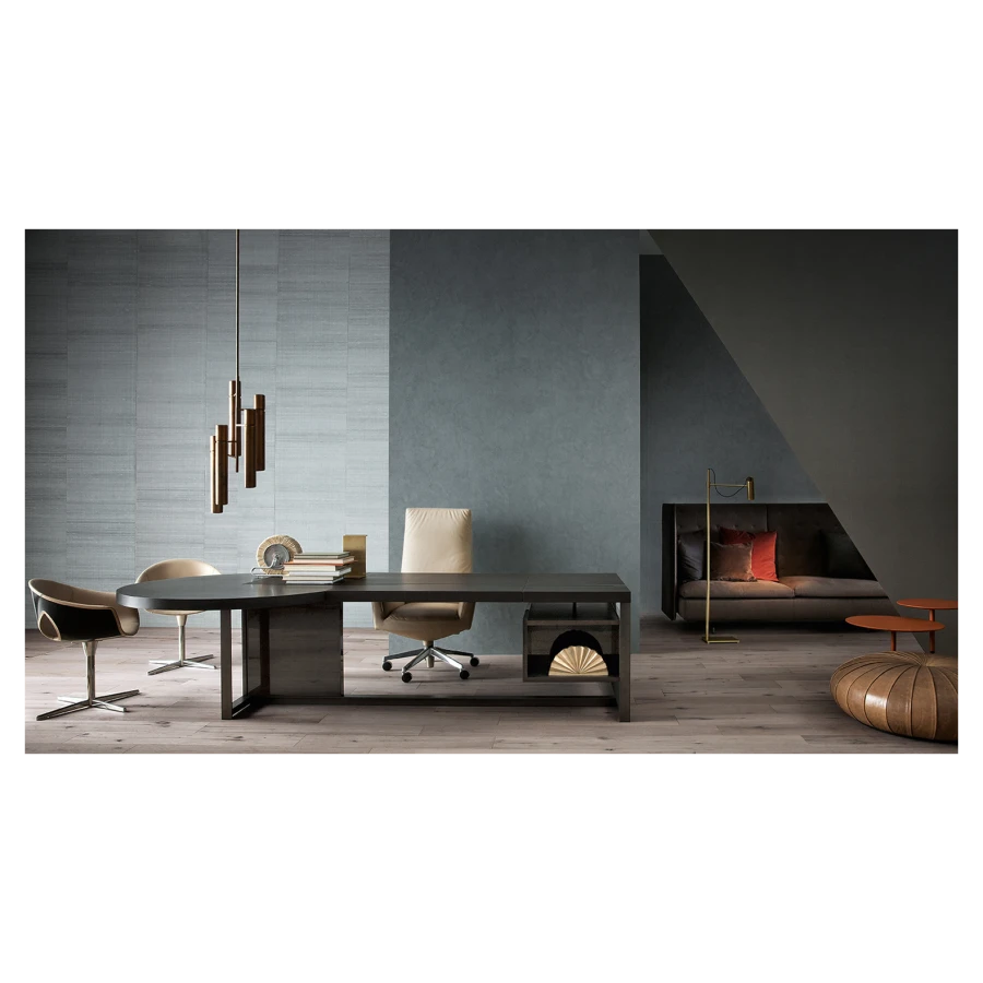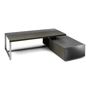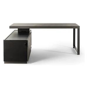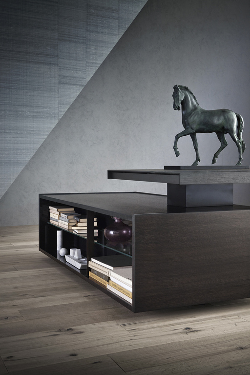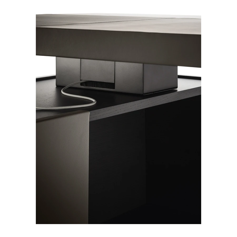 The top of the Jobs President Desk is upholstered in Pelle Frau® leather, embellished with a strip of Lead or Tobacco oak, with matt finish that runs right along its length and separates the work area from the “guest area”. The ‘guest area’ can be upholstered in Pelle Frau® leather, like the rest of the surface, or with a matt, Lead or Tobacco oak veneer, matching the column or cabinet. The top also comes with a sliding door that accesses a small internal compartment equipped with a pen holder that can also be used as a cable passageway.