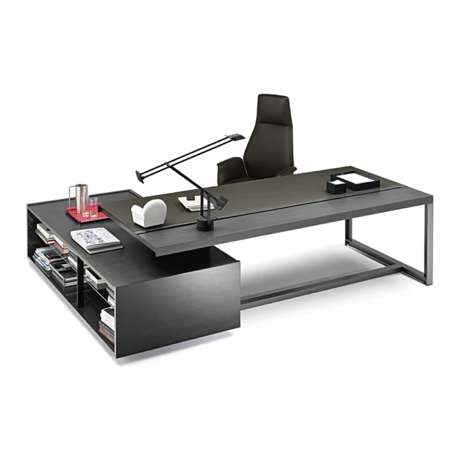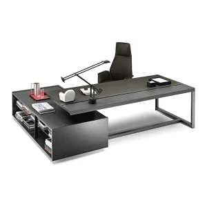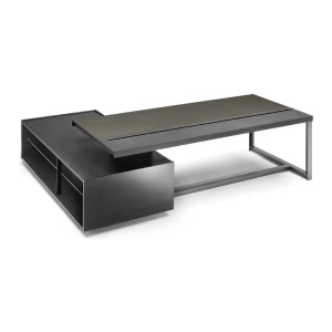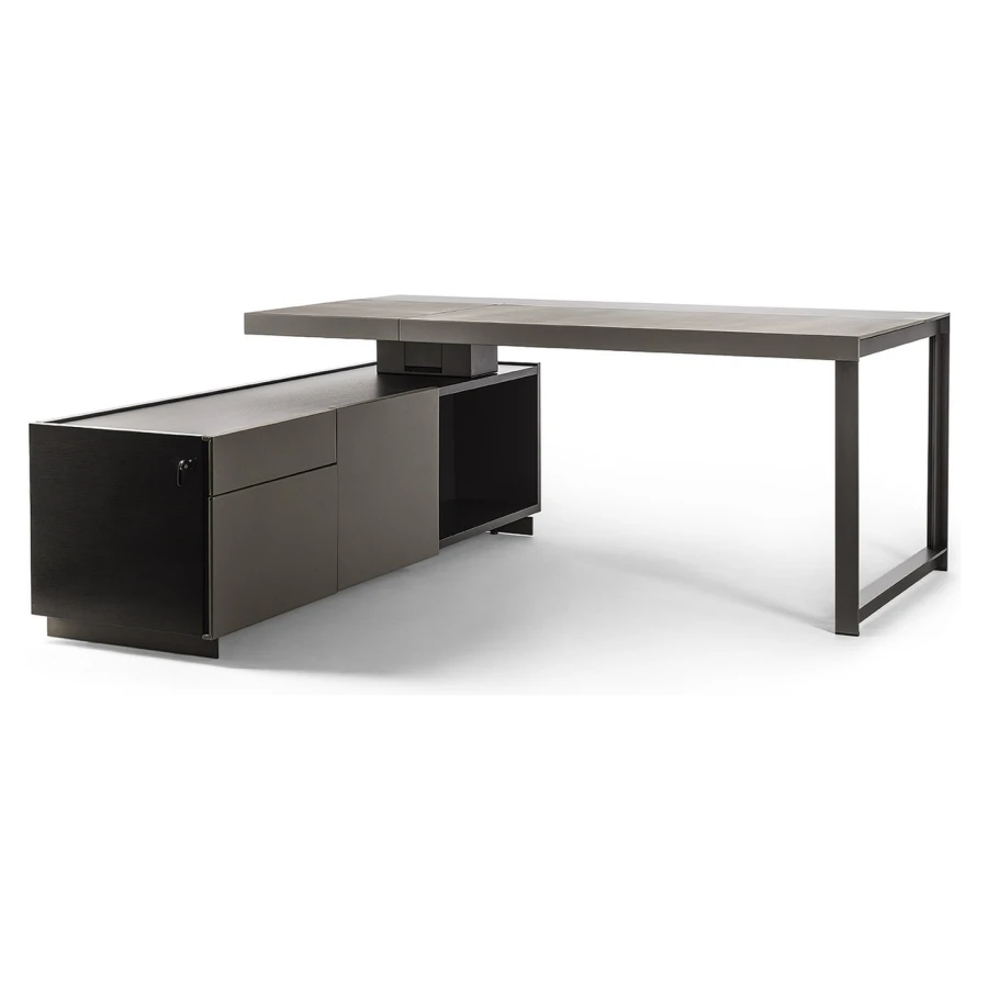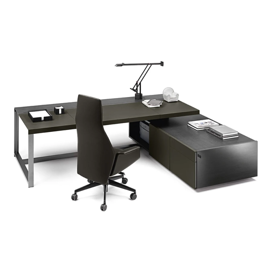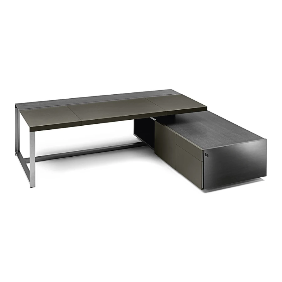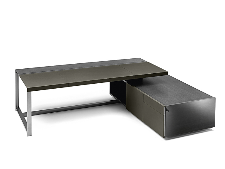 The Jobs Executive Desk has a suspended drawer unit with lock on the side. The front panel of the drawer is covered in Pelle Frau® leather with internal structure in scratchproof texturised black paint. On the opposite side to the drawer, i.e. the ‘guest area’ side, the drawer unit has an open compartment.
