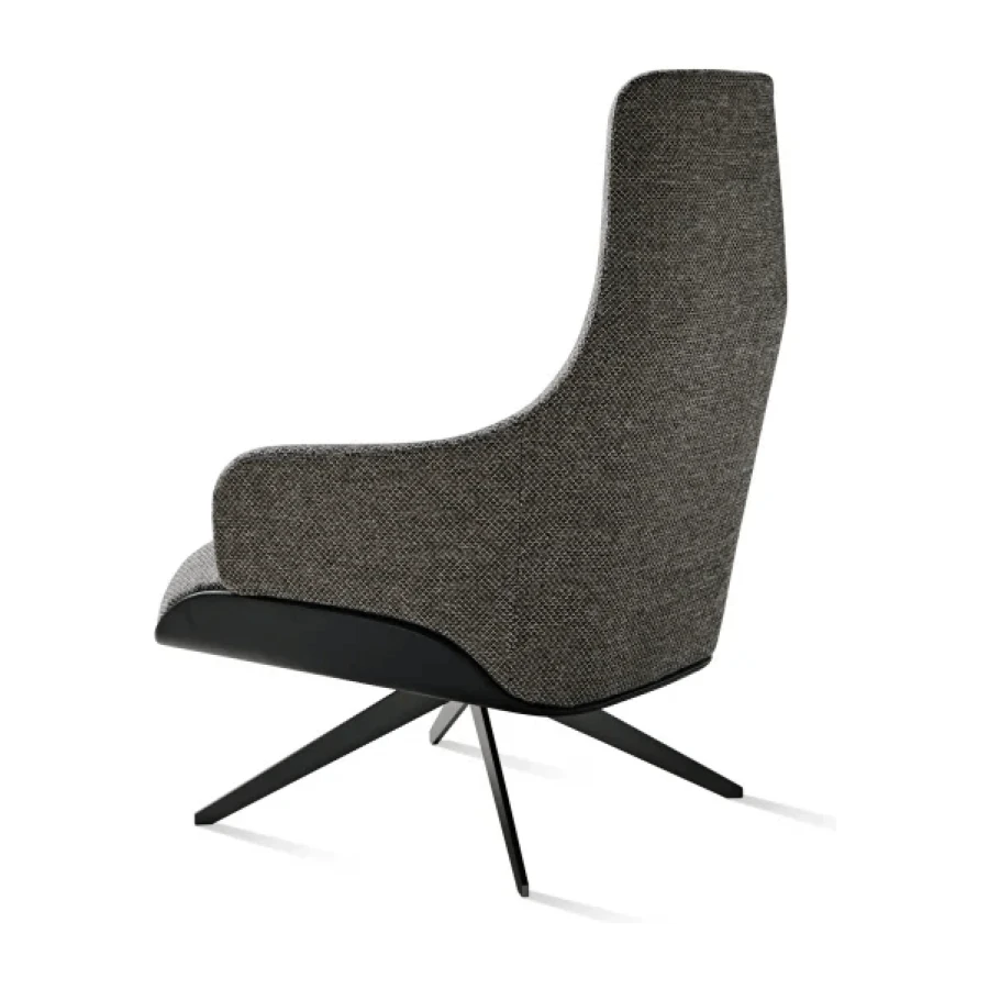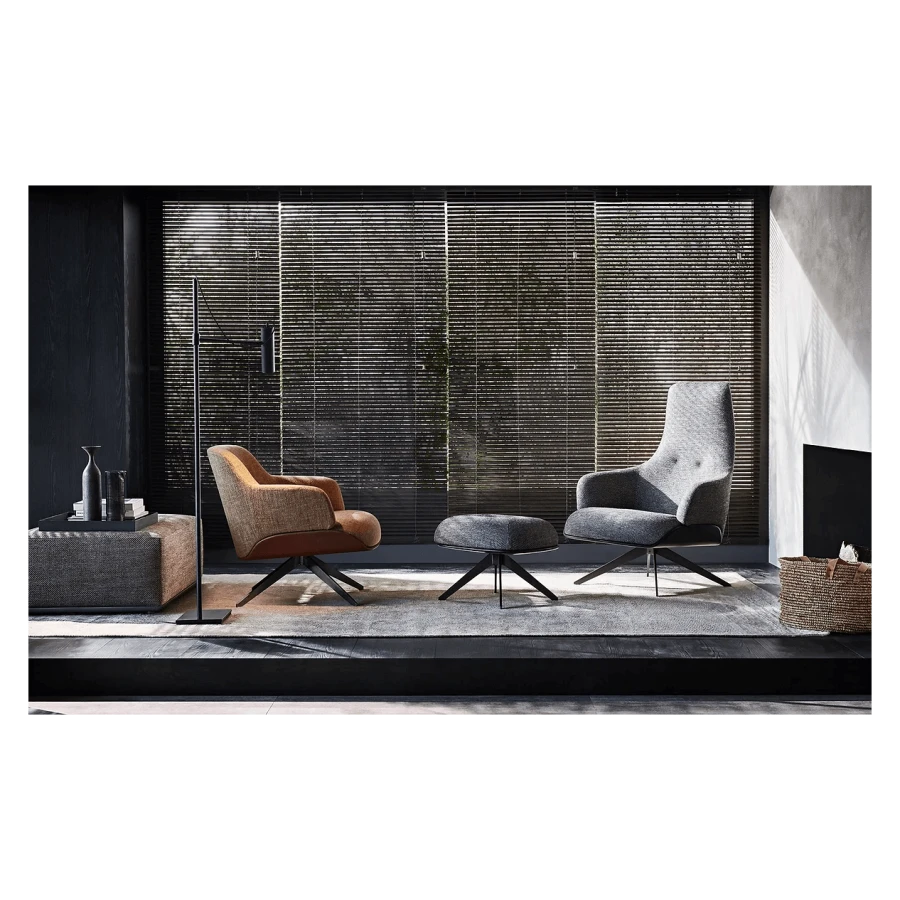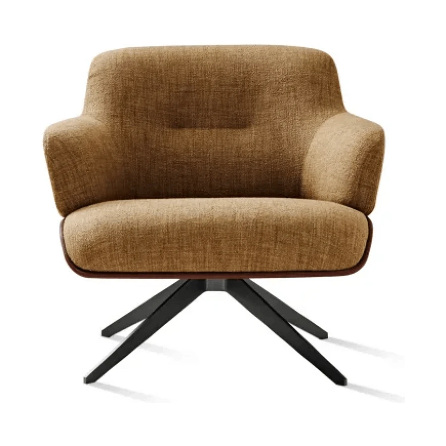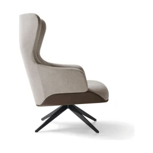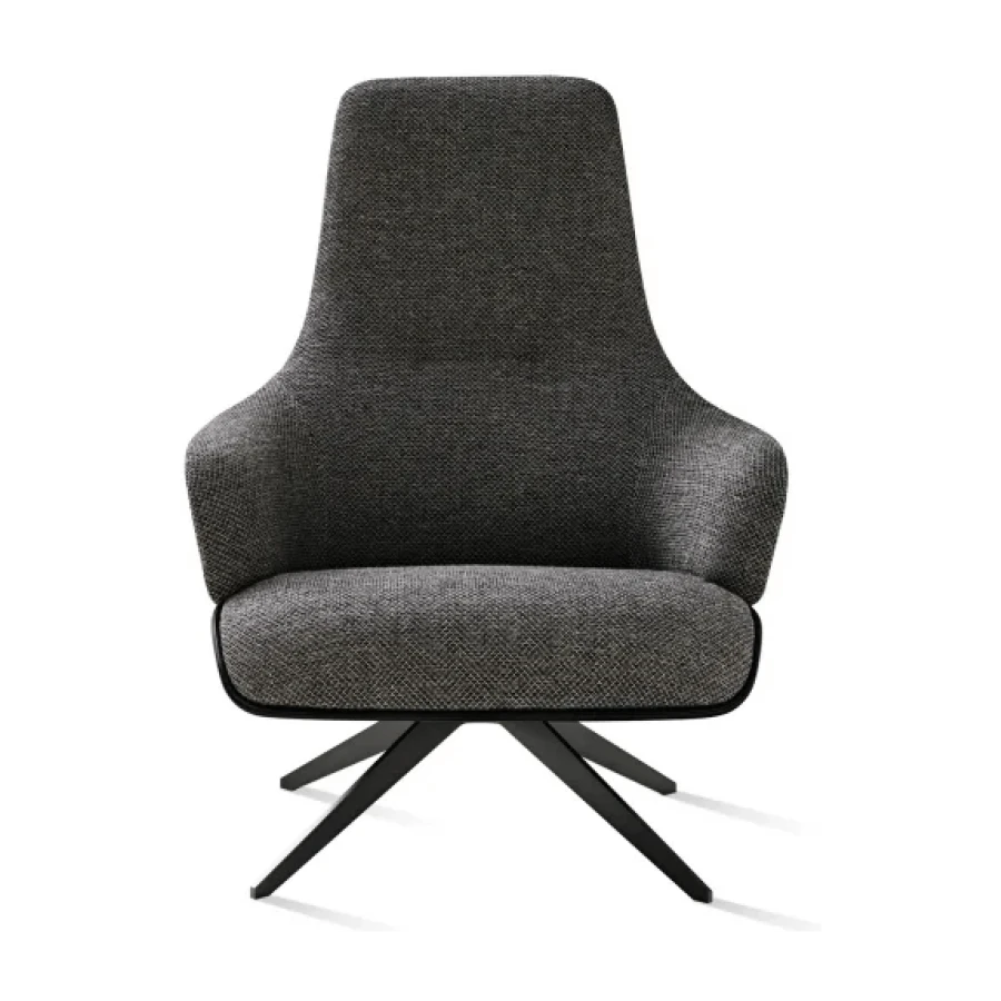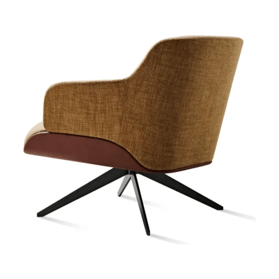 The external and internal upholstery in textiles or leather can be combined at will. The central metal base features 4 spokes designed to support the slightly sloping frame for greater comfort. The outer shell, made of moulded structural polyurethane foam entirely upholstered also in leather is matched by an inner foamed frame.