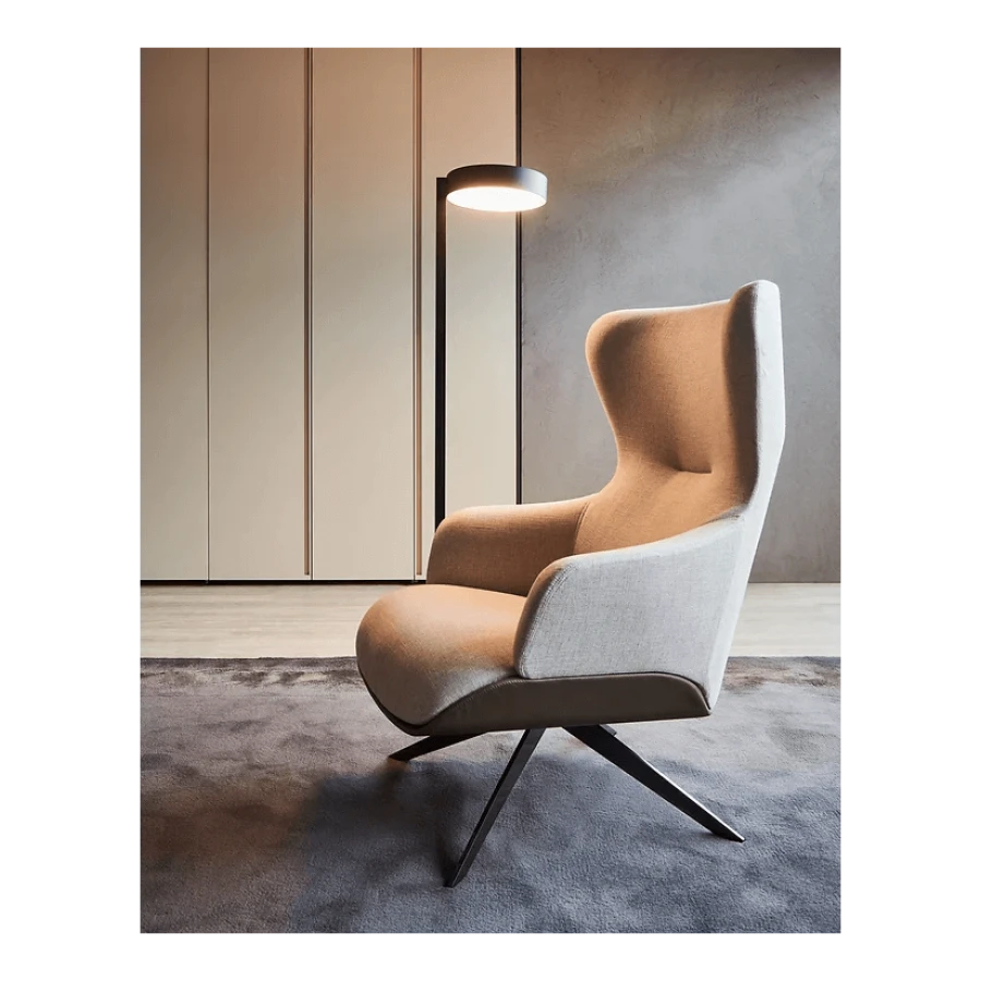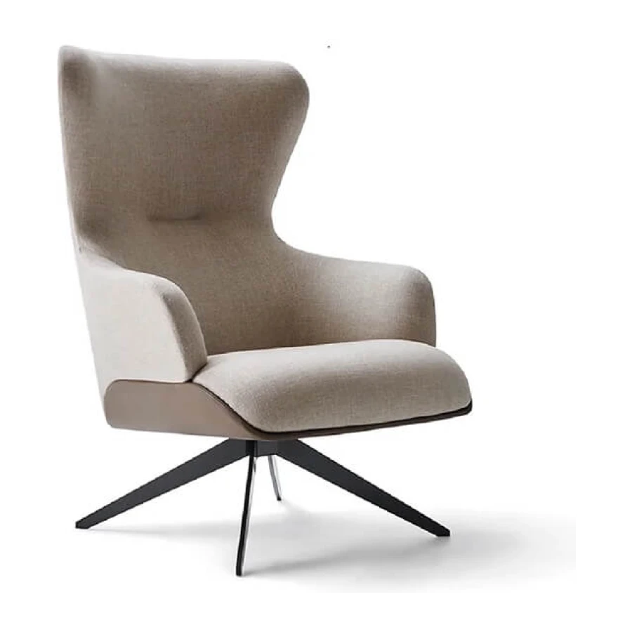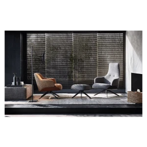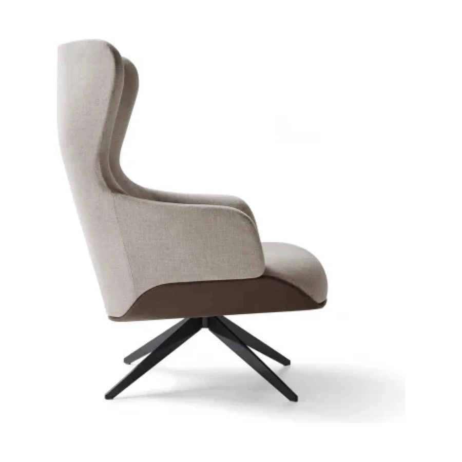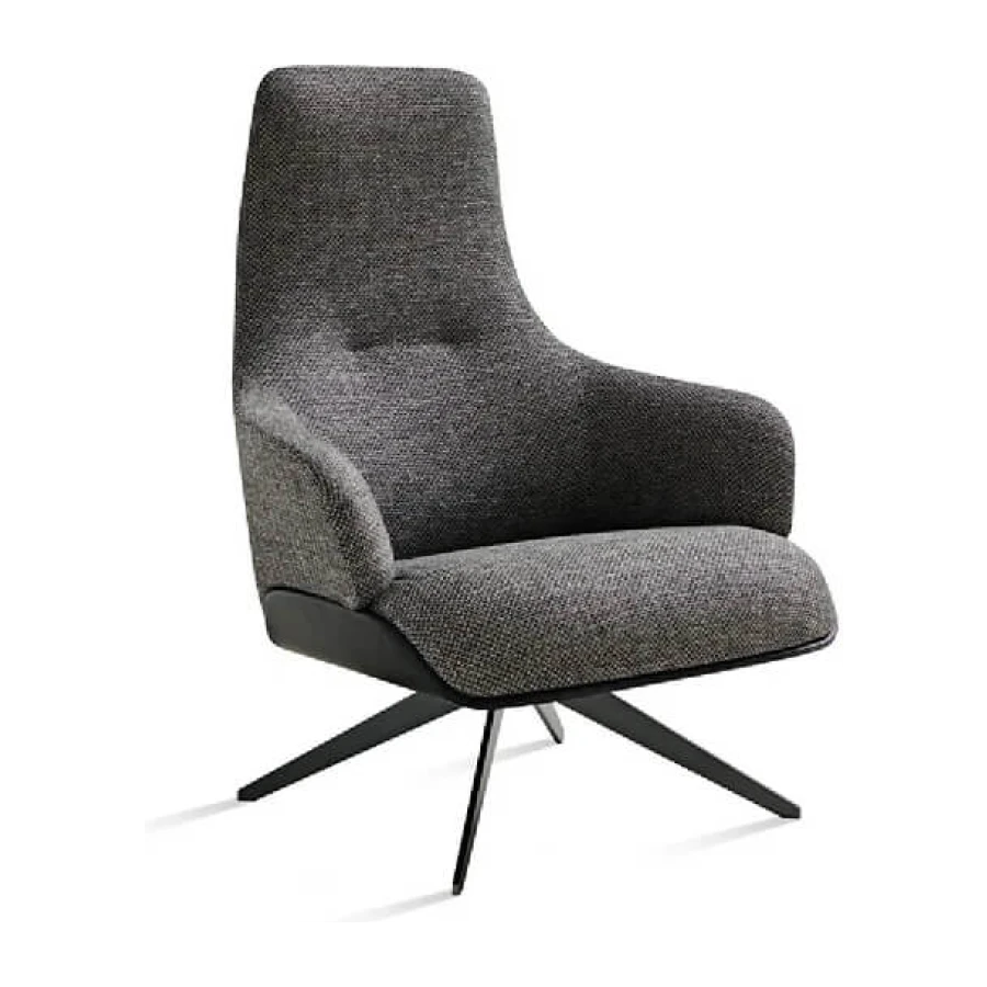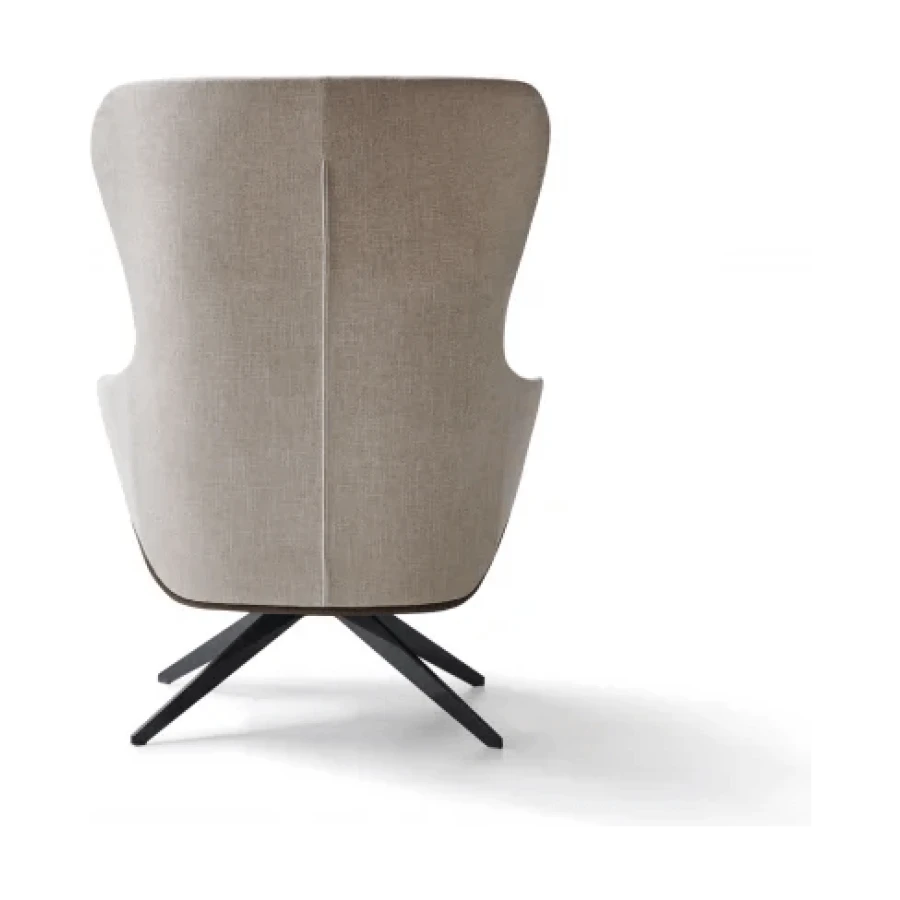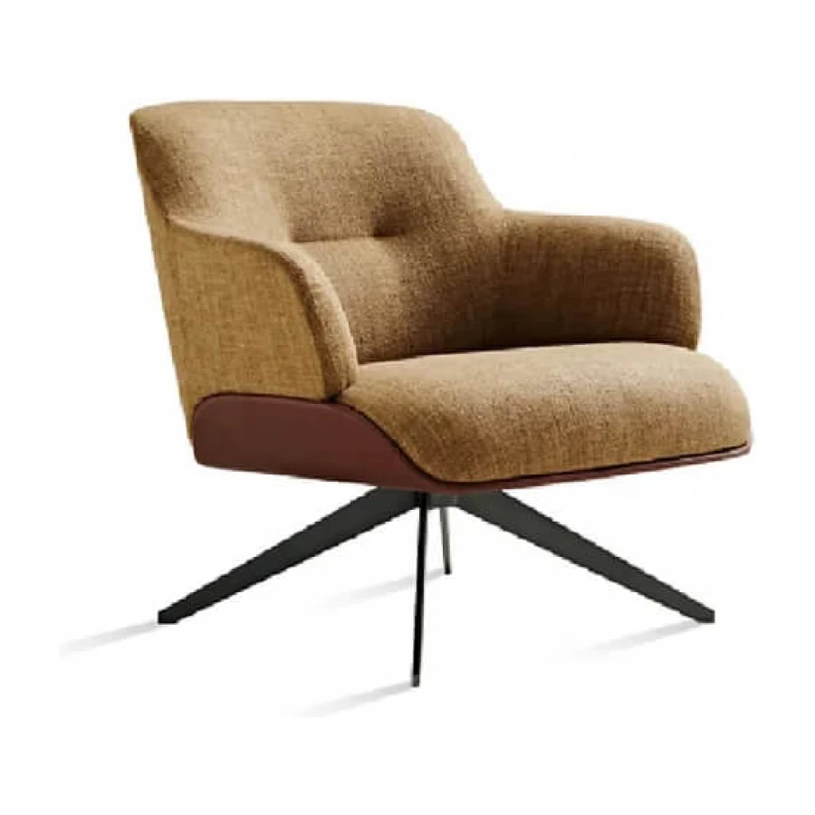 The external and internal upholstery in textiles or leather can be combined at will. The central metal base features 4 spokes designed to support the slightly sloping frame for greater comfort. The outer shell, made of moulded structural polyurethane foam entirely upholstered also in leather is matched by an inner foamed frame.