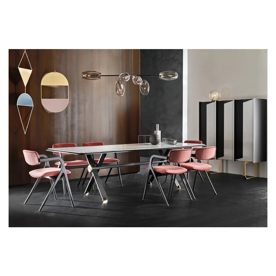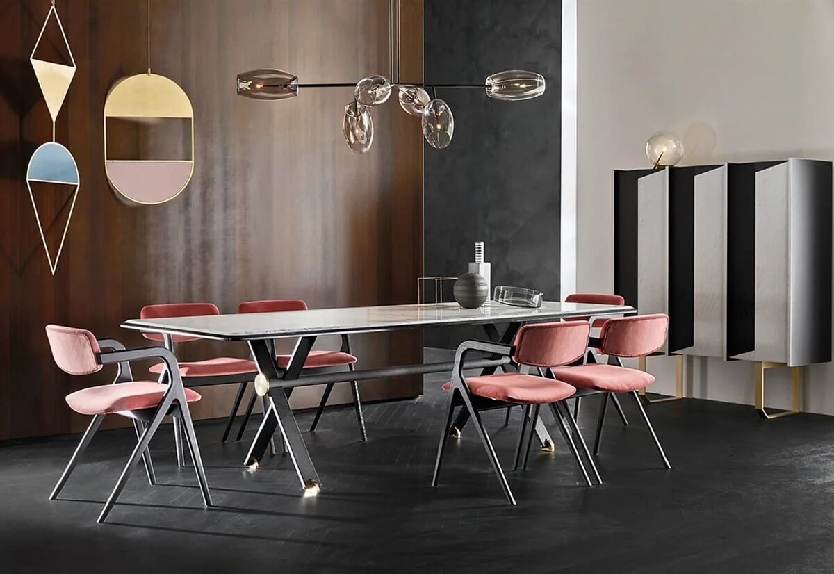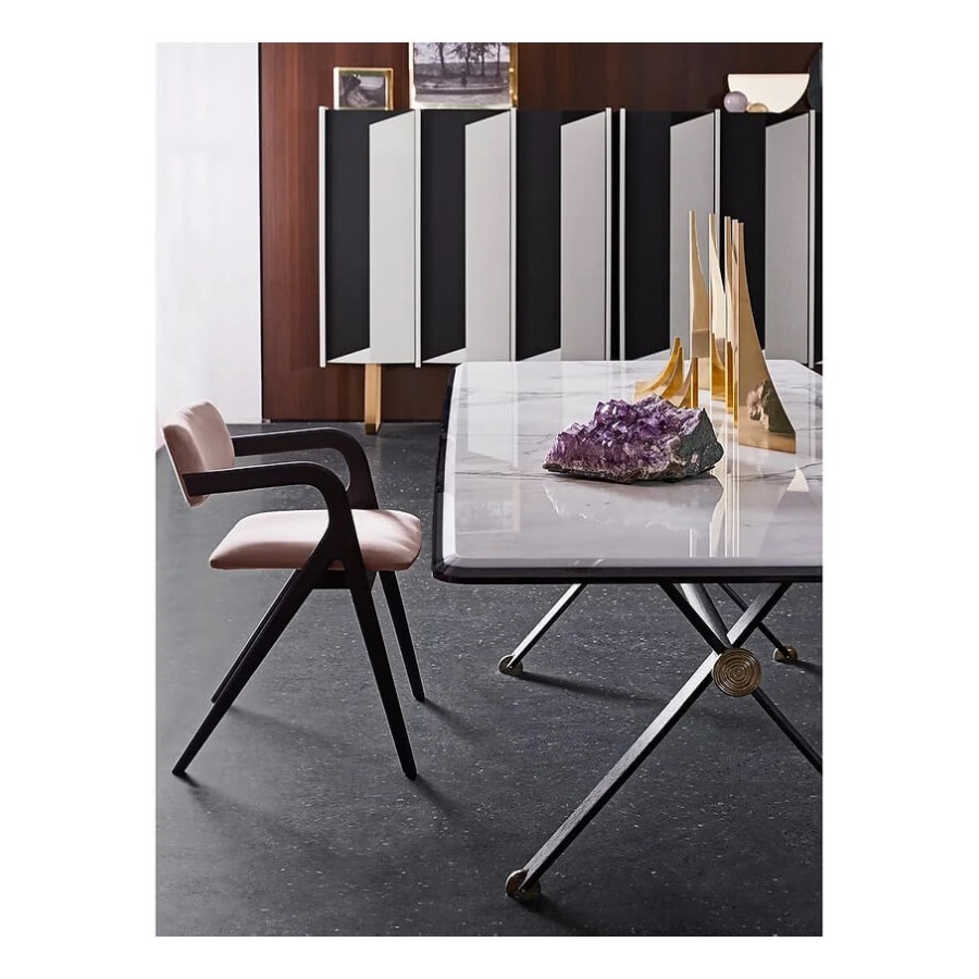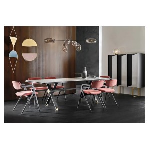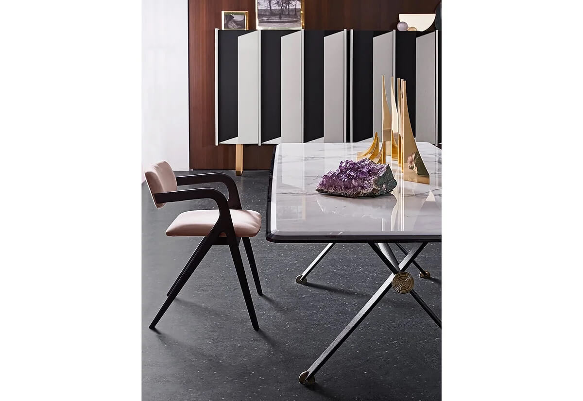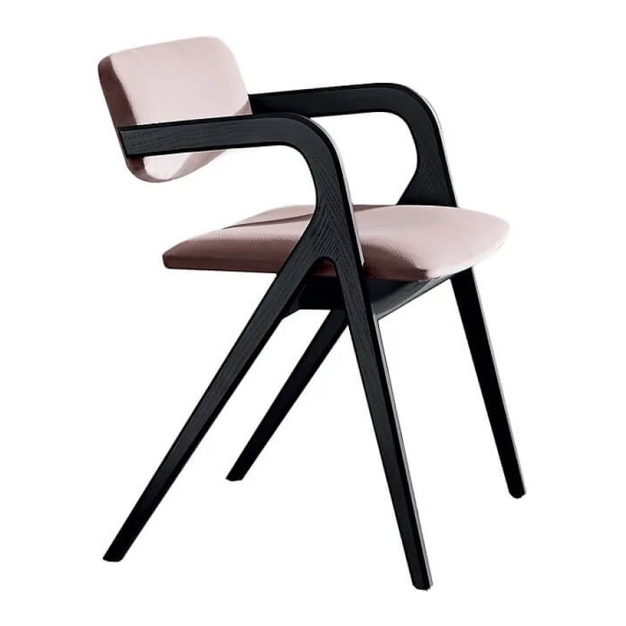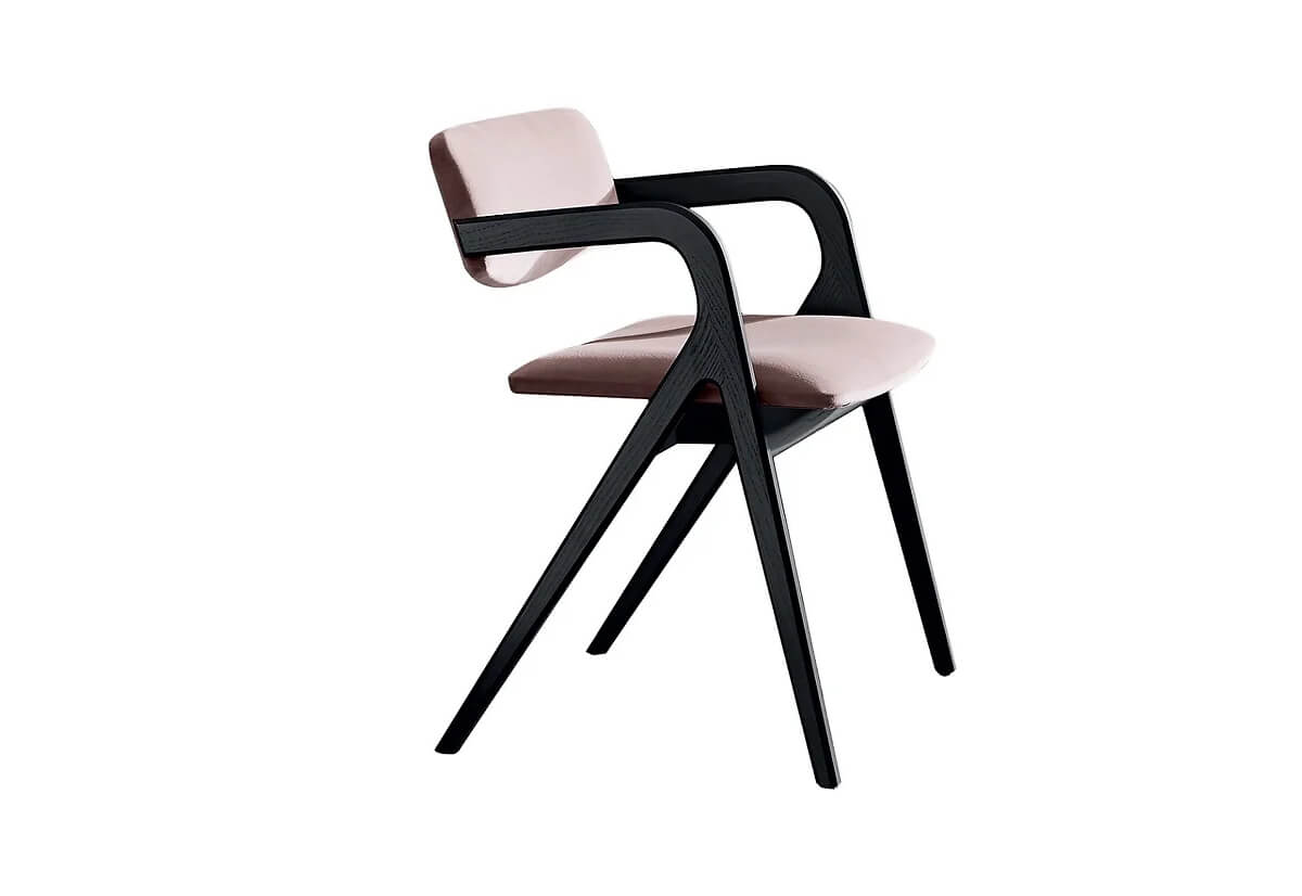 Chair with black lacquered open pore solid curved ash structure. Also available in natural ash, tobacco stained or white open pore lacquered ash. Seat with inside structure in wood and by-products padded in non-deformable polyurethane foam. Backrest made of structural polyurethane dipped in flexible polyurethane foam. Covered by fabric or leather as per samples. Not removable cover.