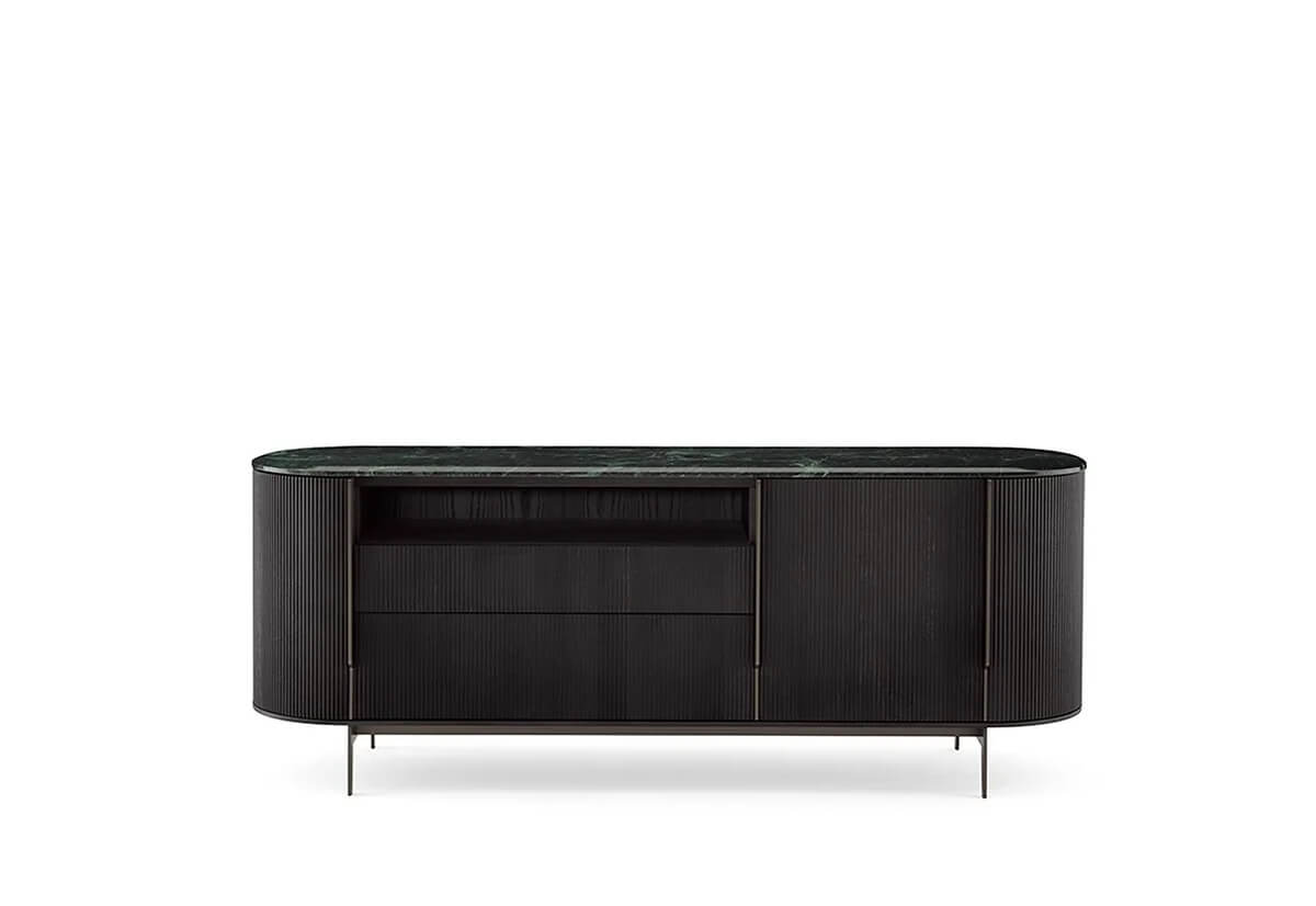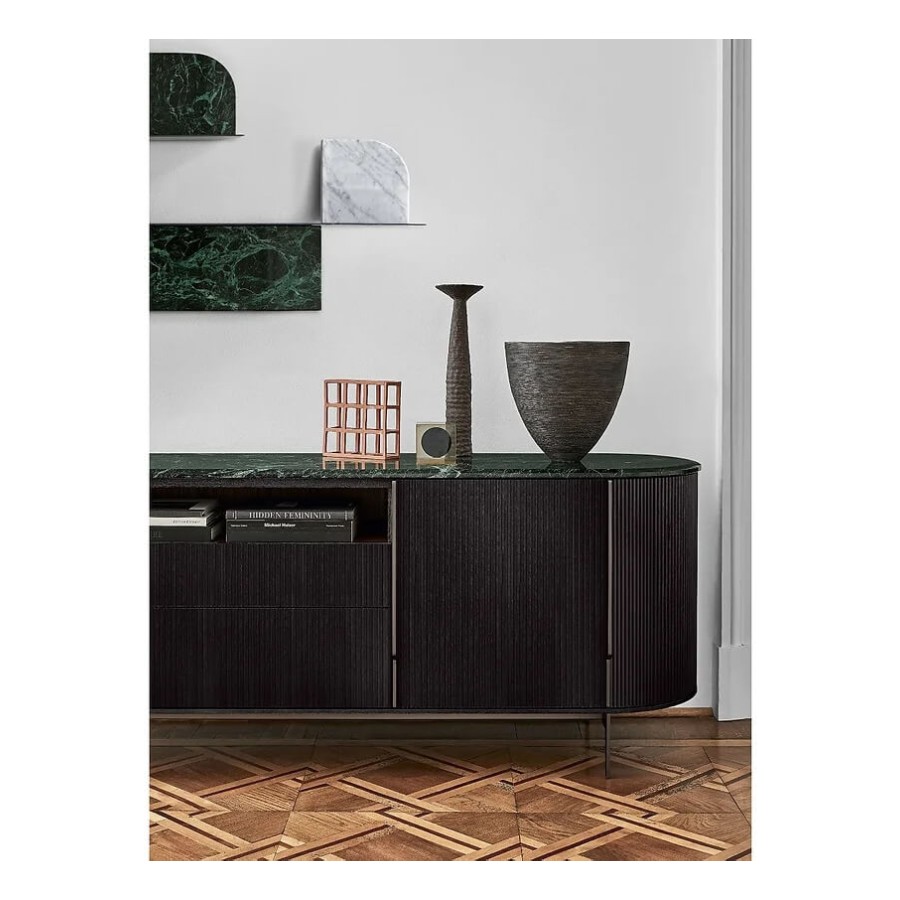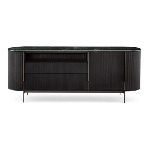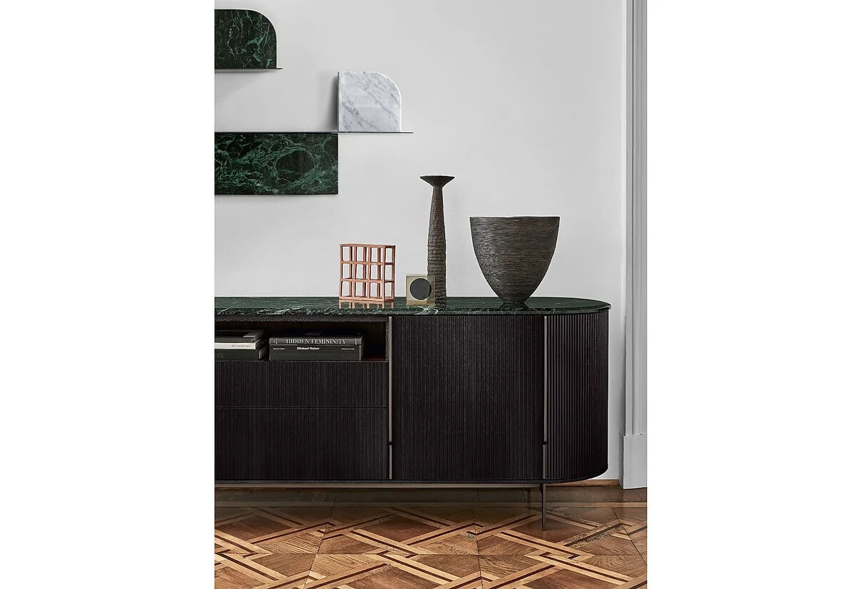 Sideboard with doors, drawers and open module. Structure in black lacquered open pore or walnut lacquered open pore limewood. Front and sides cladded with hand knurled border. Modules with doors supplied with inside wooden shelf. In the black lacquered open pore version top available in beveled Calacatta Vagli Oro or Verde Alpi marble or 6 mm thick tempered black back painted glass. Handles and metal parts lacquered in the “fango” colour. In the walnut lacquered open pore version top available in bevelled Calacatta Vagli Oro/Verde Alpi marble or 6 mm thick tempered back painted glass in liquorice, blue grey or green grey colours.