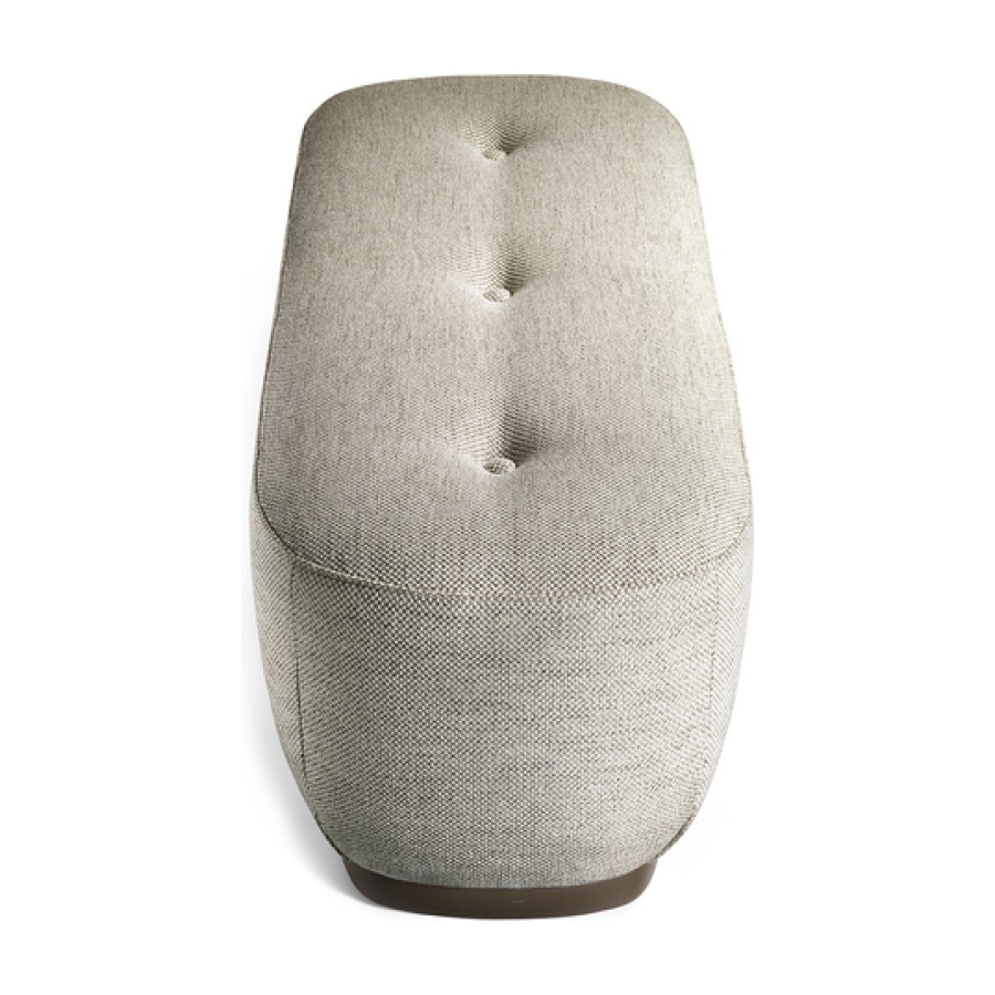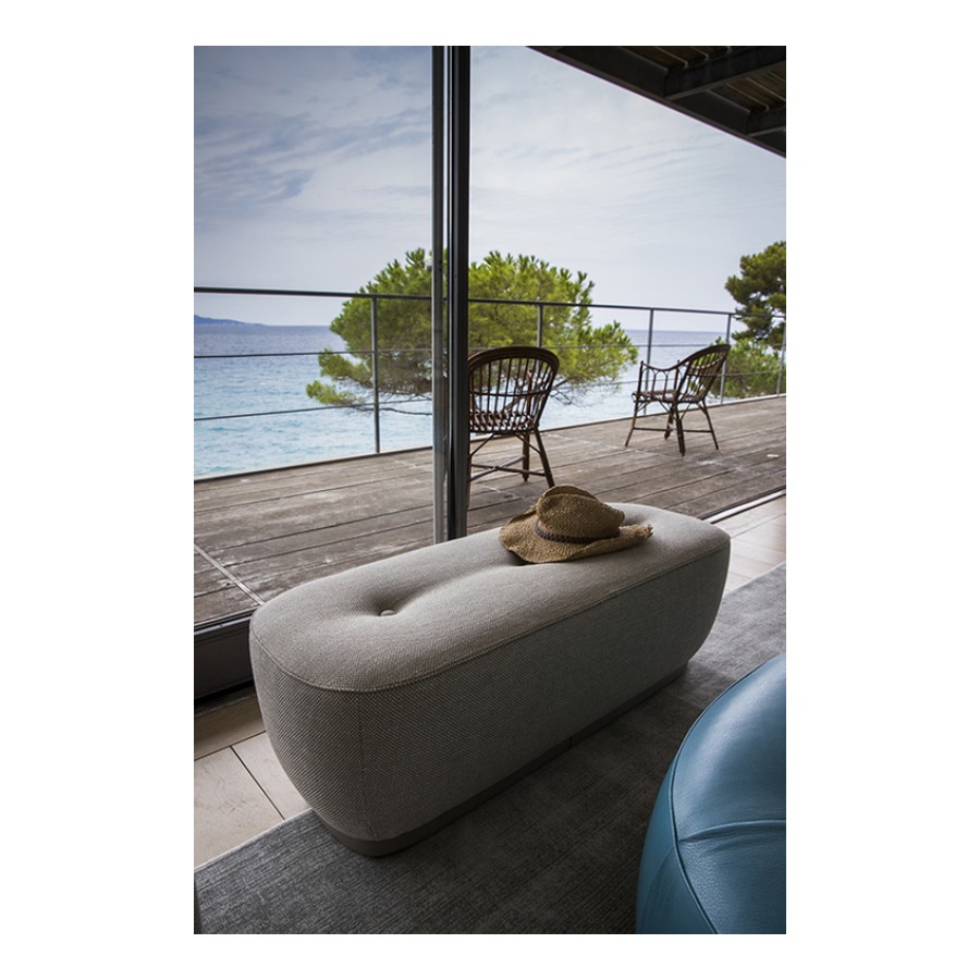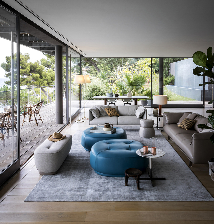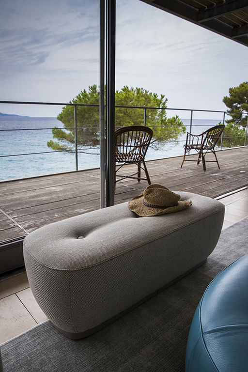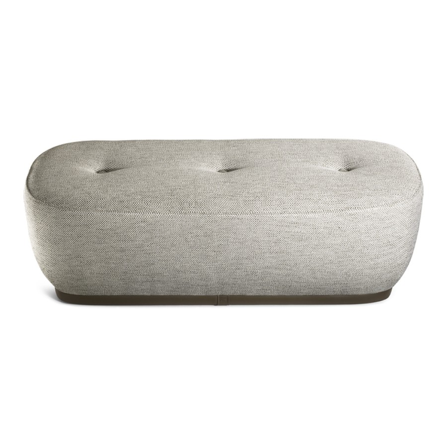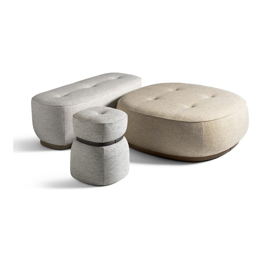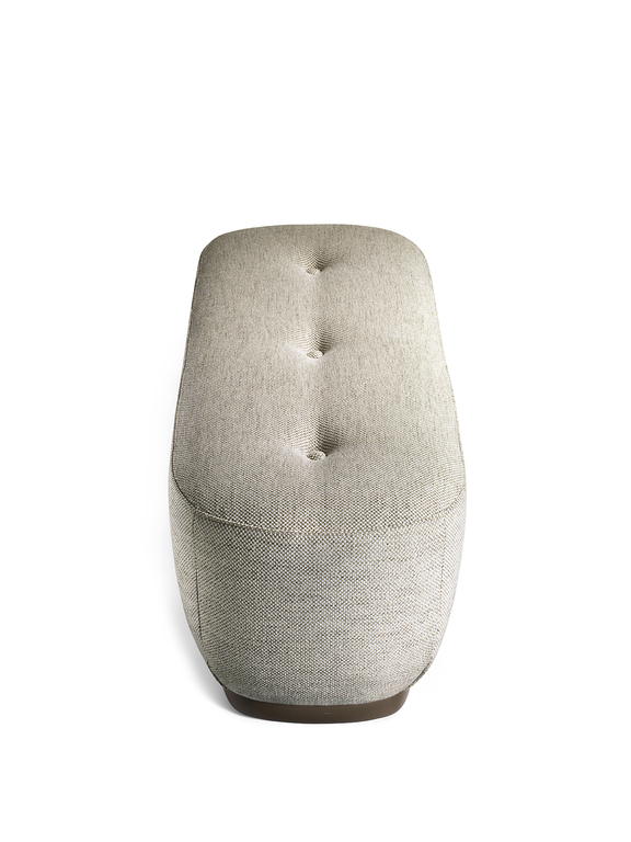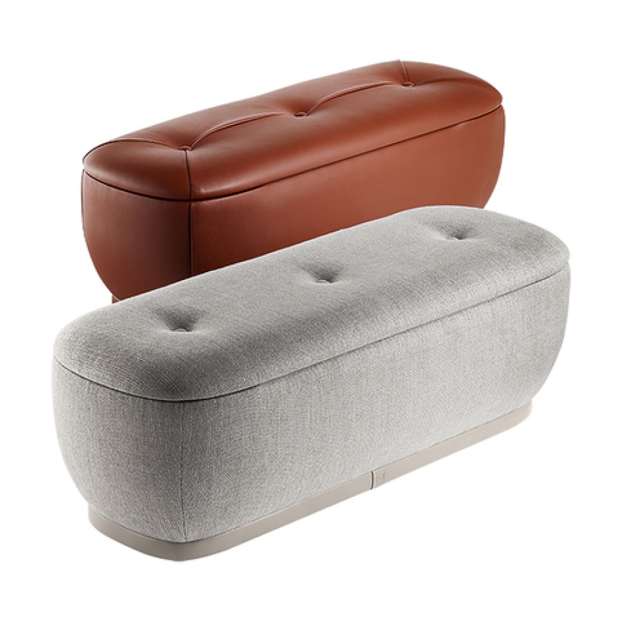 Leplì is a stool, bench and pouf. Kensaku Oshiro designs four versatile pieces with a strong identity. The designer draws on traditional Poltrona Frau processes and decorations, combining them with sartorial details borrowed from the world of fashion. Classic stitching and soft folds bring out the sinuous simplicity of the design. The voluptuous curves of the stool, in particular, are inspired by the female form and, like in a dress, a slender belt highlights her “waist”.