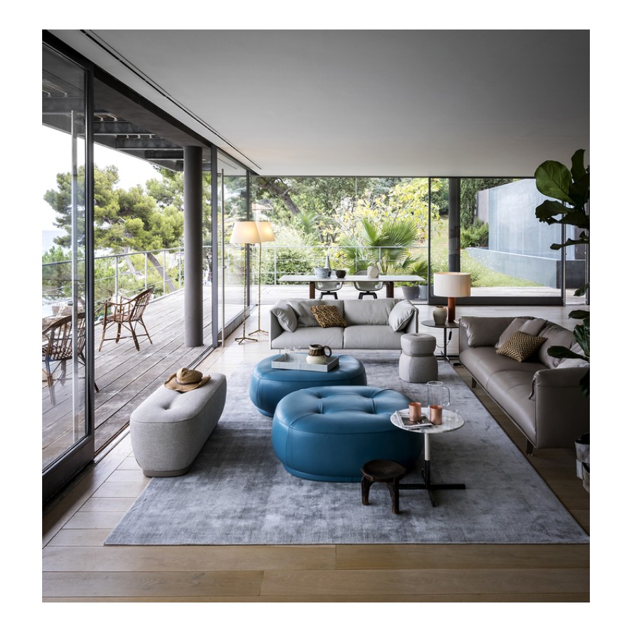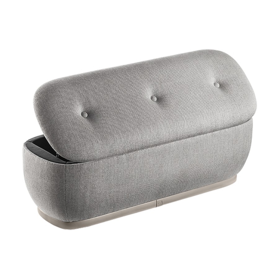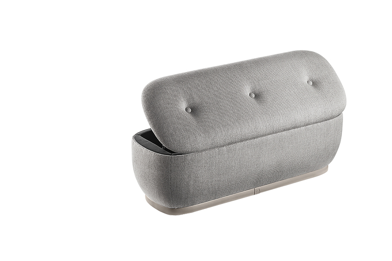 The structure of the Leplì pouf is in birch plywood and poplar with uprights in solid beech and infill in kraftliner. In the version with storage compartment, the side shells are in moulded rigid polyurethane, the metal parts of the opening mechanism and the zips are in nickel-plated steel and zamak, and the lid is in birch plywood. The base is in poplar plywood with a scratch-resistant black lacquered MDF bottom. The seat is padded with polyurethane foam and polyester wadding (the model with storage compartment has polyurethane foam padding for the structure and lid). The Leplì poufs can be upholstered in Pelle Frau® leather or fabric with an ornamental leather band. When the upholstery is in leather the ornamental band is always the same colour as the pouf. In the leather version four folds originate from the central button of the seat to define the profile of the pouf. In the fabric version the folds are replaced by stitching.