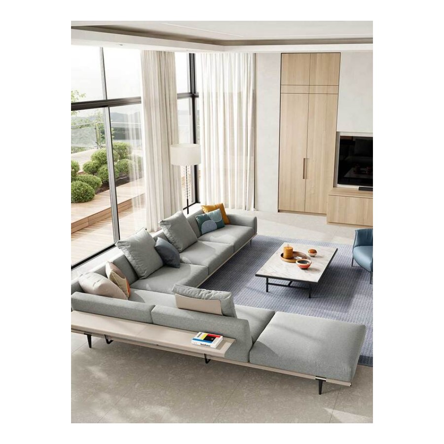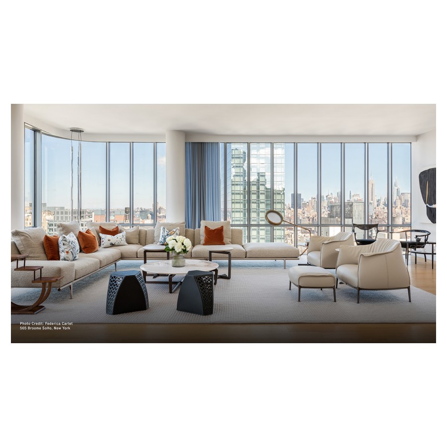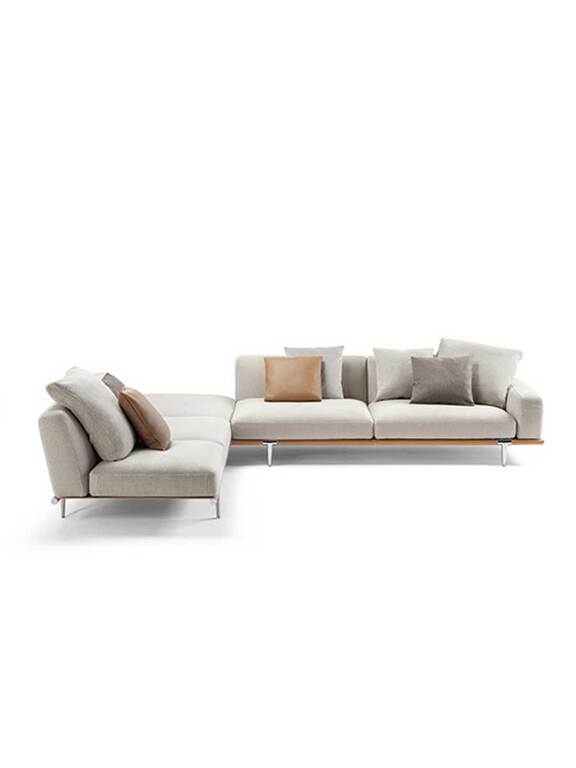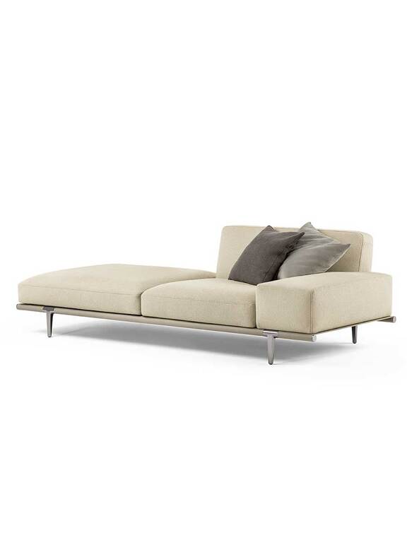Let it Be is a modular furniture system, open to infinite configurations. The modular sofas can be completed with shelves and storage units that expand their functions. The structure and the soft down cushions appear to be suspended on saddle-leather straps. The foot, unexpectedly set back compared with the corner, exalts the sensation that the seats are floating in space. The purity of the design melds with the precious details. The visible leather and saddle-leather stitching bring to mind the luxurious workmanship of saddles and harnesses.