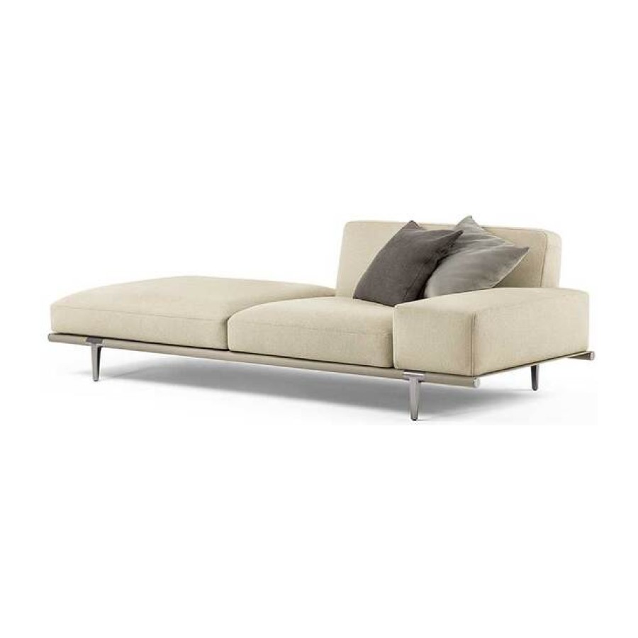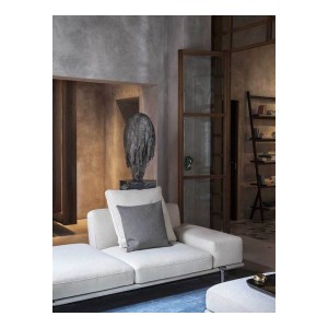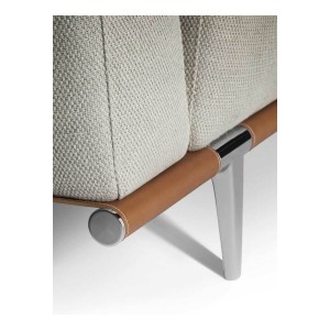 The structure and cushions are upholstered in Pelle Frau® leather, also combined with fabric. Alternatively, saddle-leather combined with Pelle Frau® leather or fabric. The shelves and armrest or backrest surfaces are upholstered in saddle-leather. Frame in die-cast aluminium with joints in black painted steel. The backrest and armrest structure, padded with polyurethane foam and polyester wadding, is in solid poplar and birch plywood. The seat spring system consists of intertwined elastic belts. Seat cushion padded in goose down and polyester wadding. Moulded aluminium feet of two heights with ruthenium or burnished and blasted finish.