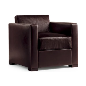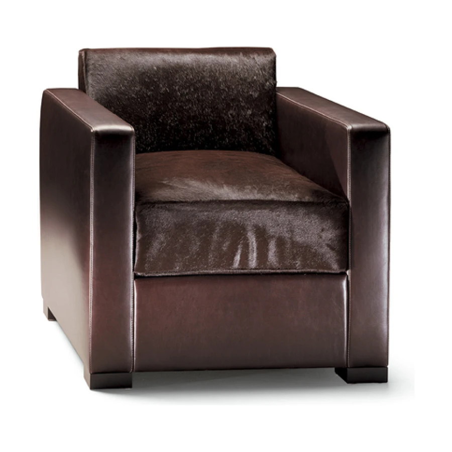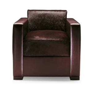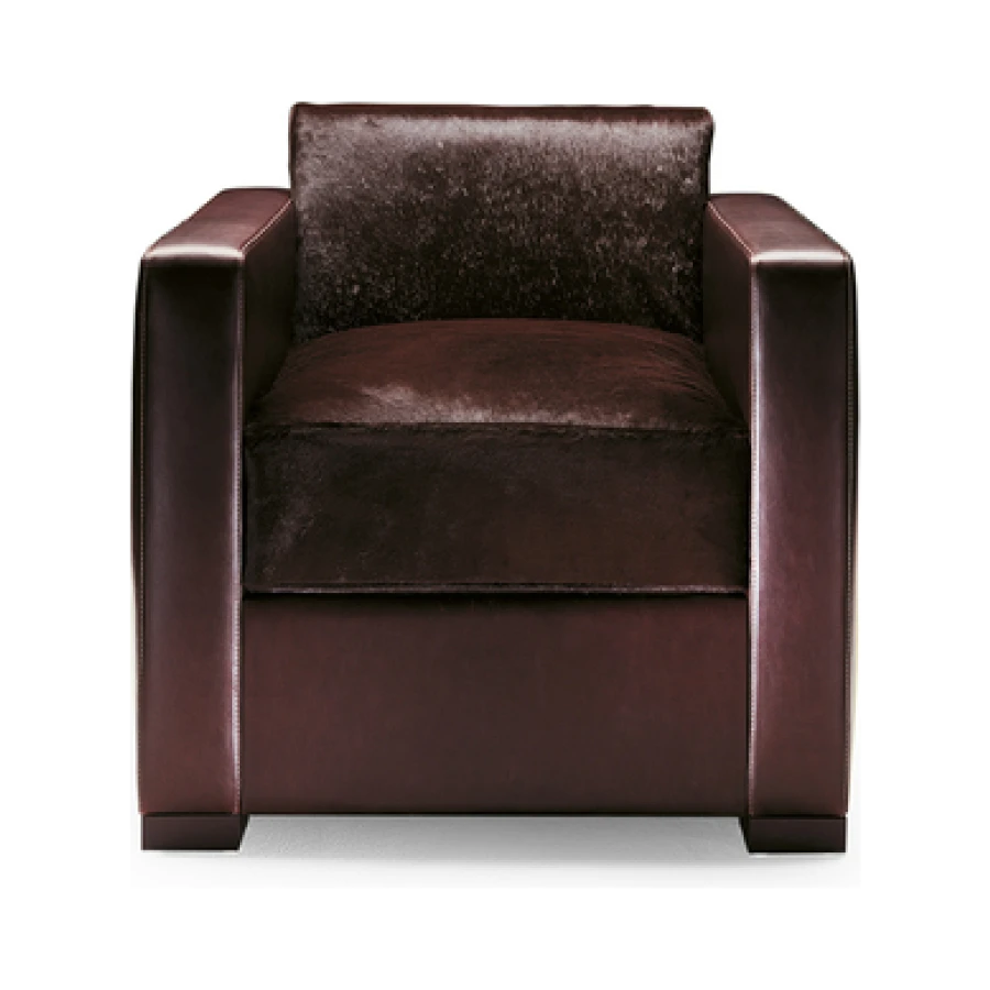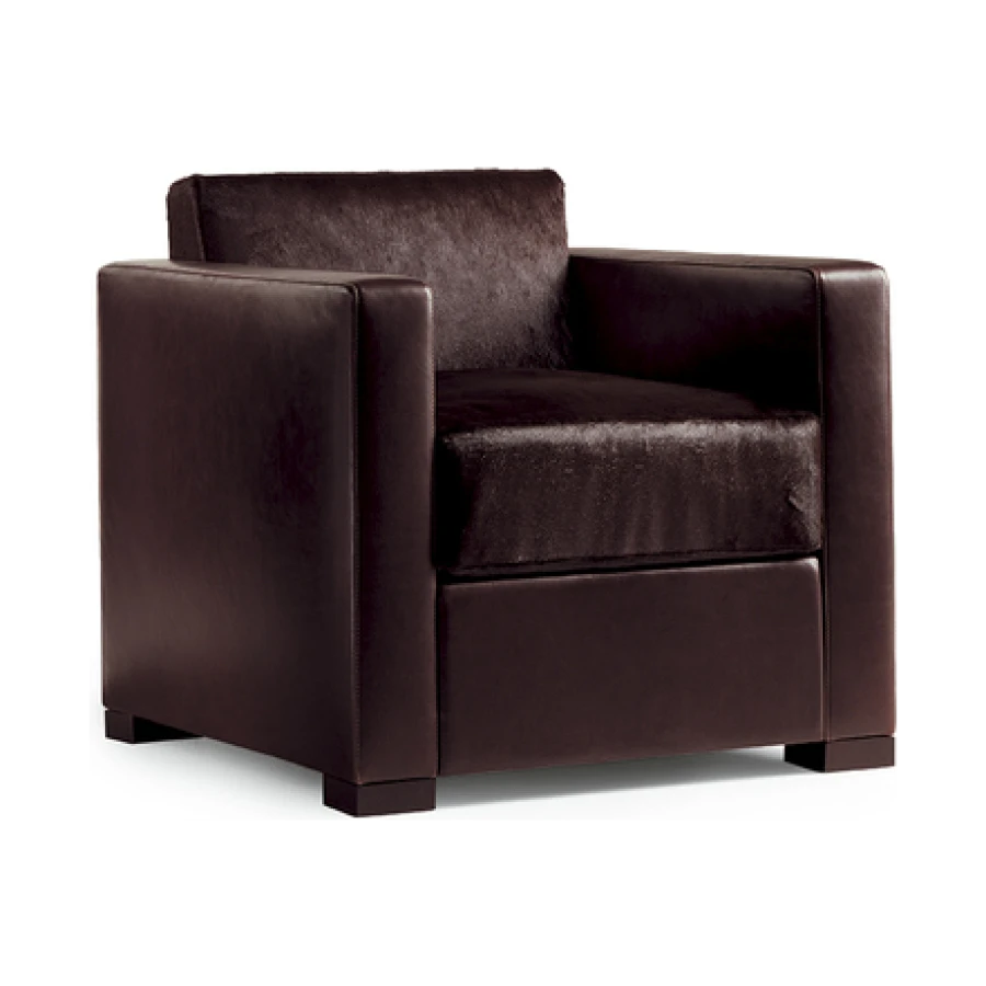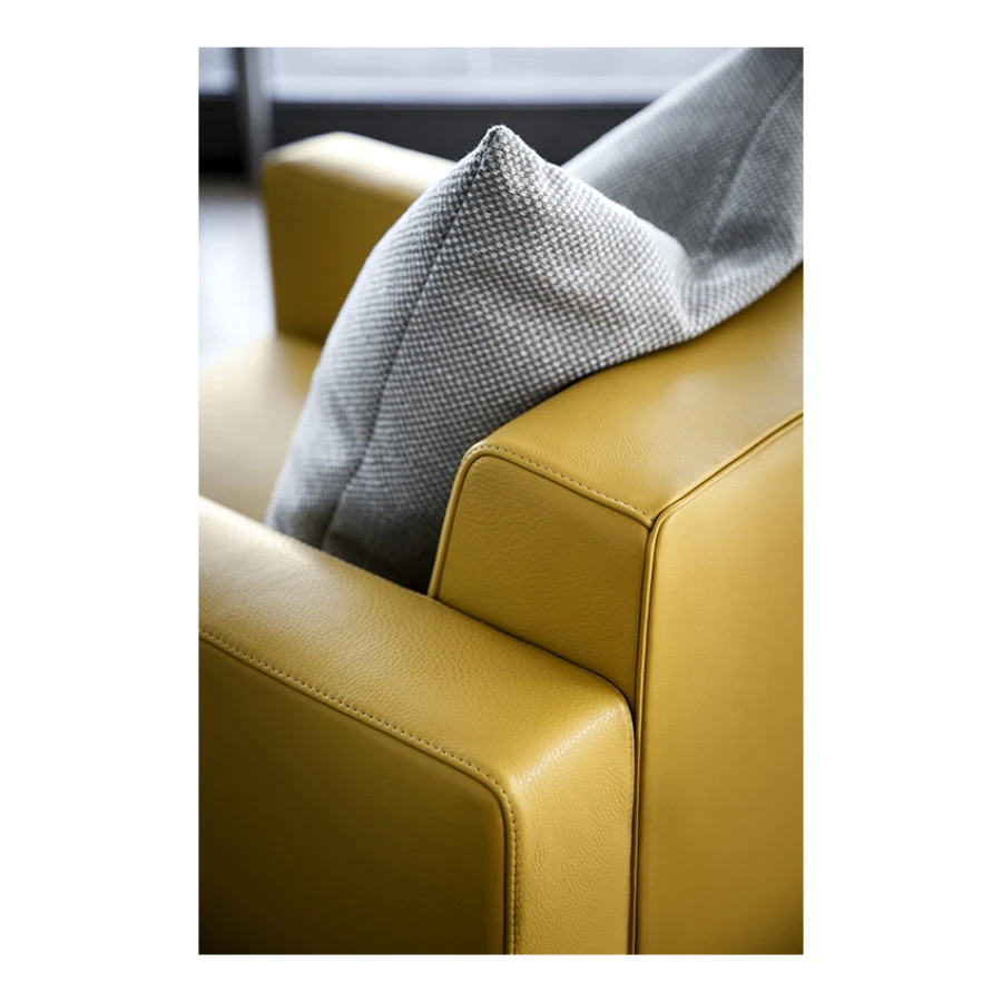 The Linea A sofa and armchair are distinctive for the extreme precision of the upholstery stitching, perfectly taut and calibrated in relation to the sturdy solid beech and birch plywood structure. Close attention has also been paid to the internal details like the zigzag springs of the seat and the goose down padding of the cushions with stabilising insert in polyurethane foam. The upholstery is available in Pelle Frau® leather or fabric and in the combination Pelle Frau® leather with pony skin leather for the backrest and seat cushions. Feet in beech with a wenge stain.