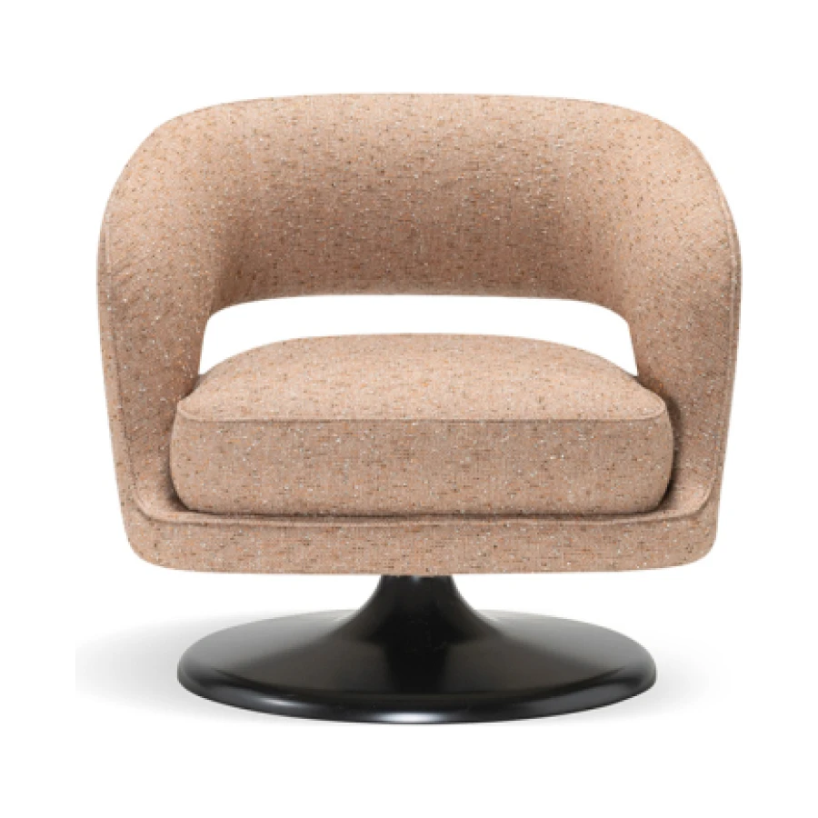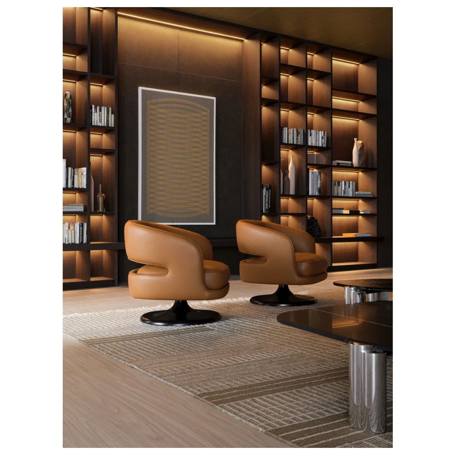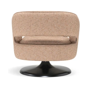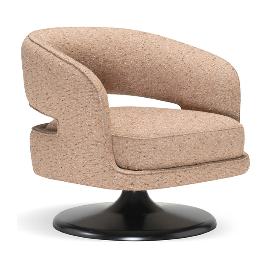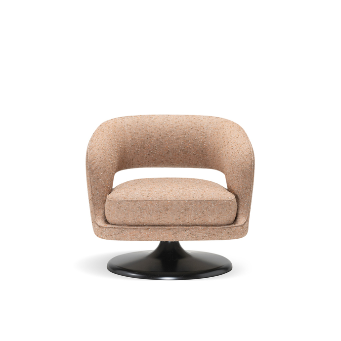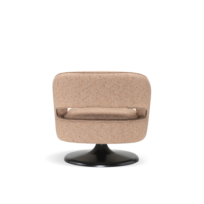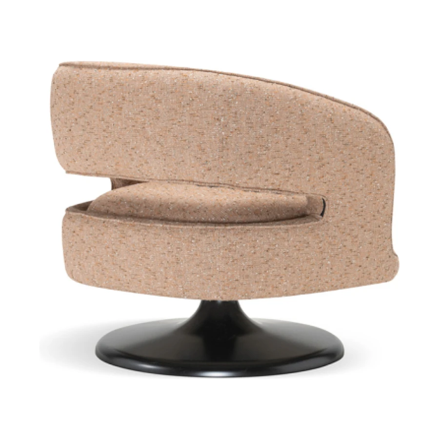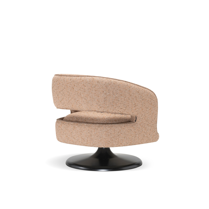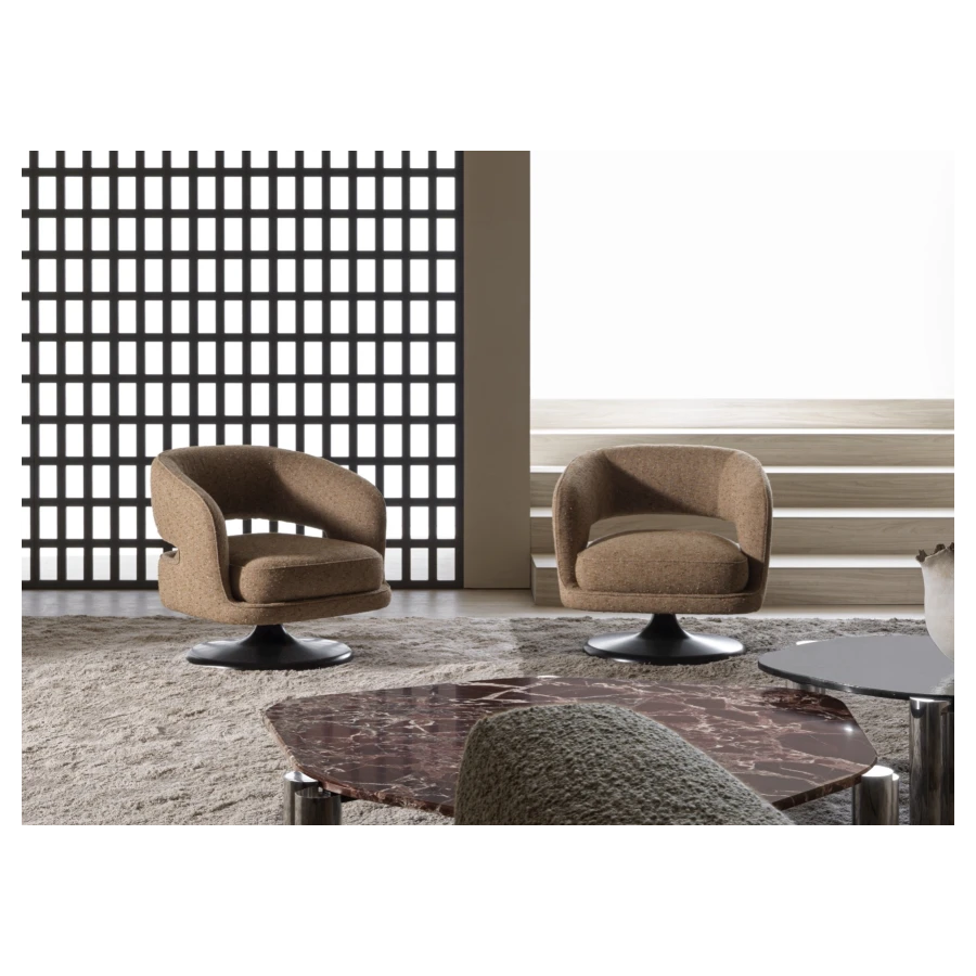 At its foundation, the Linea armchair features an iconic trumpet-shaped swivel base—an elegant nod to mid-century design, reinterpreted with contemporary fluidity. The sculptural form is further enhanced by a distinctive void in the backrest, a subtle yet impactful detail that lightens its visual presence while maintaining an enveloping sense of comfort.