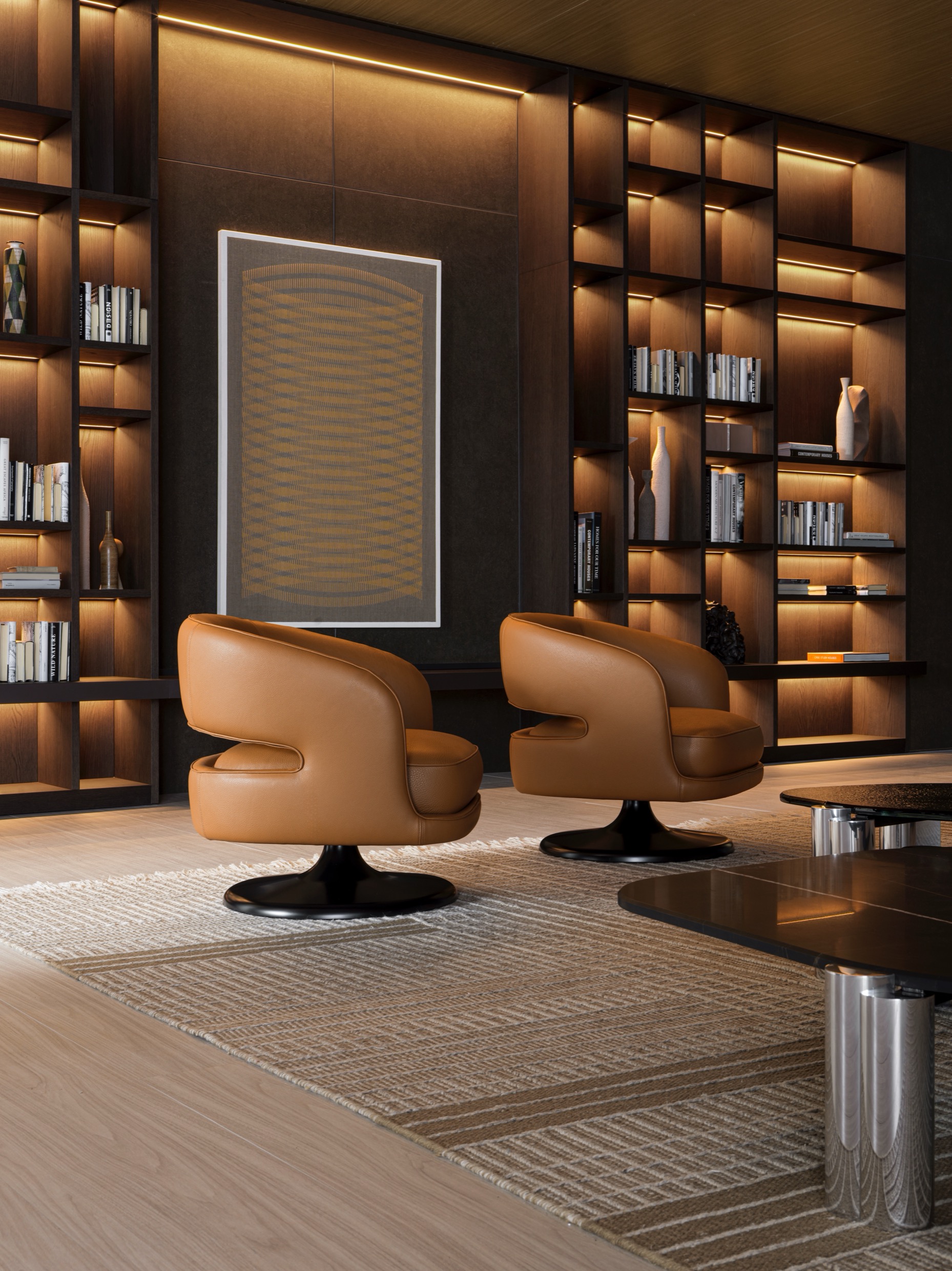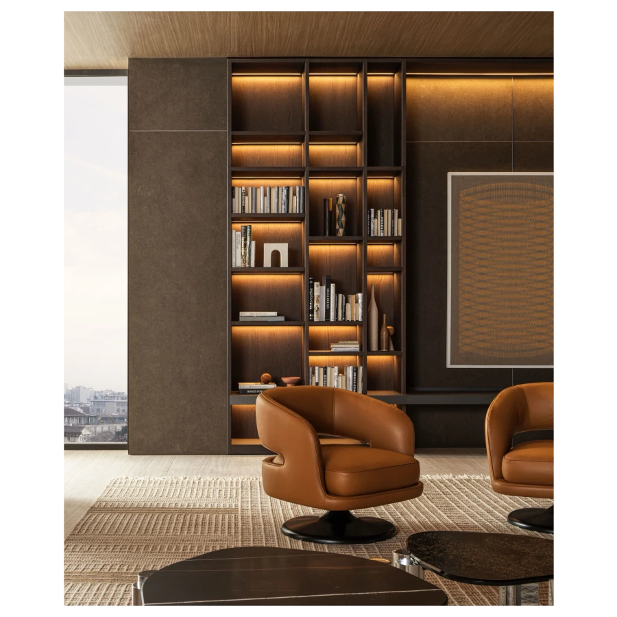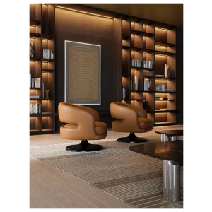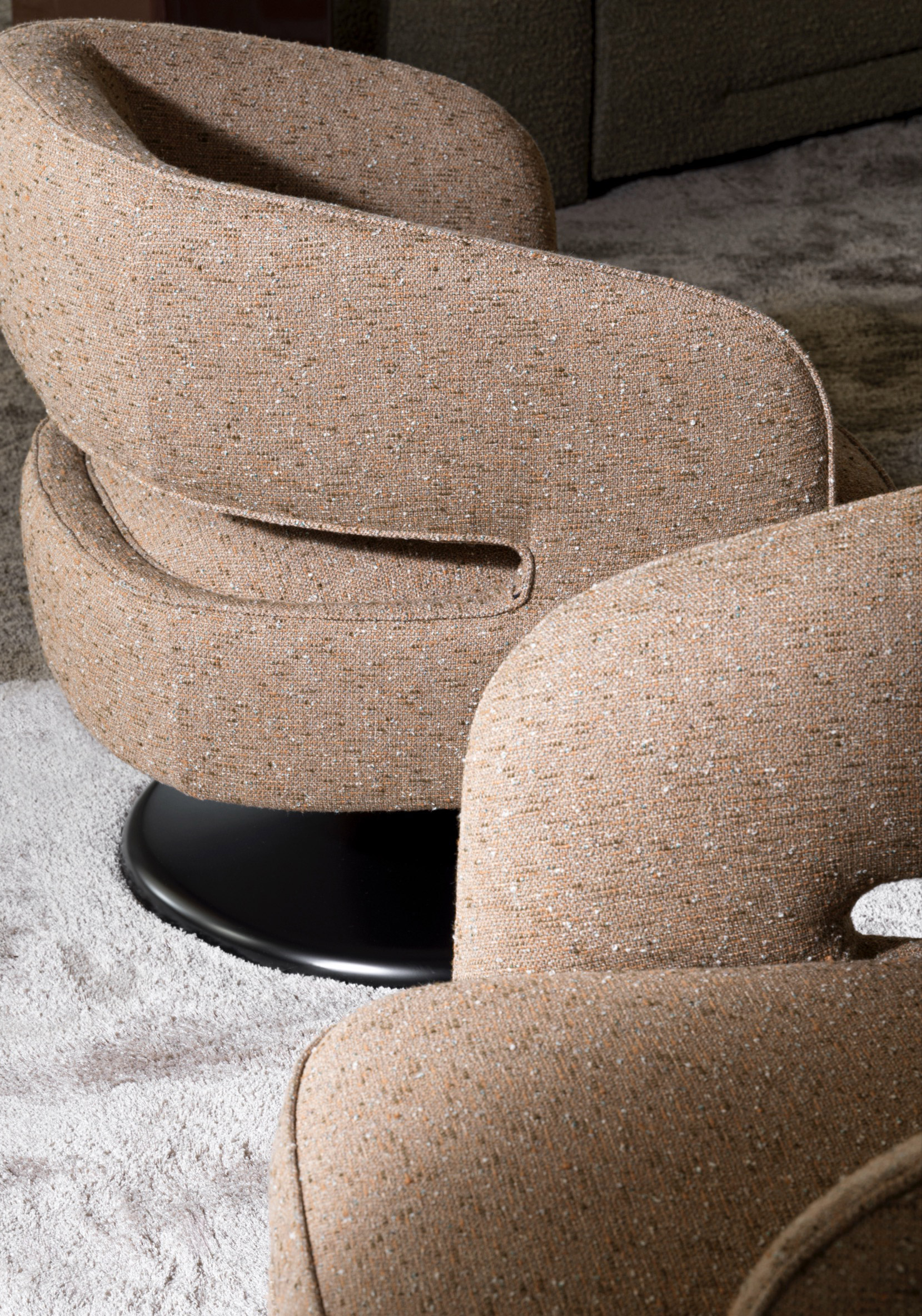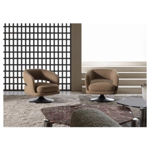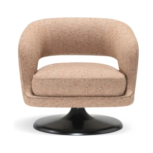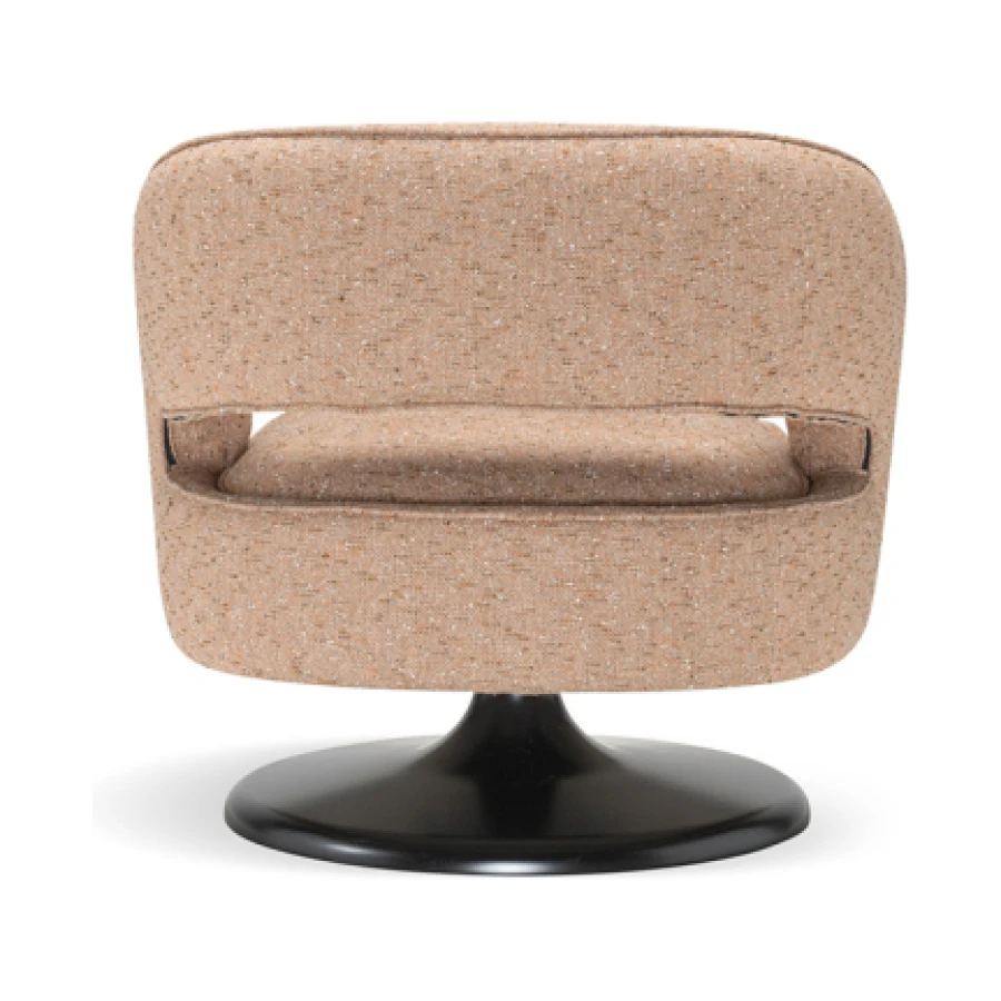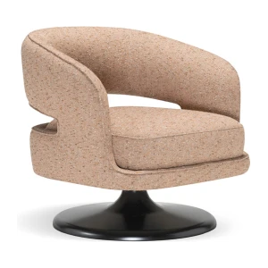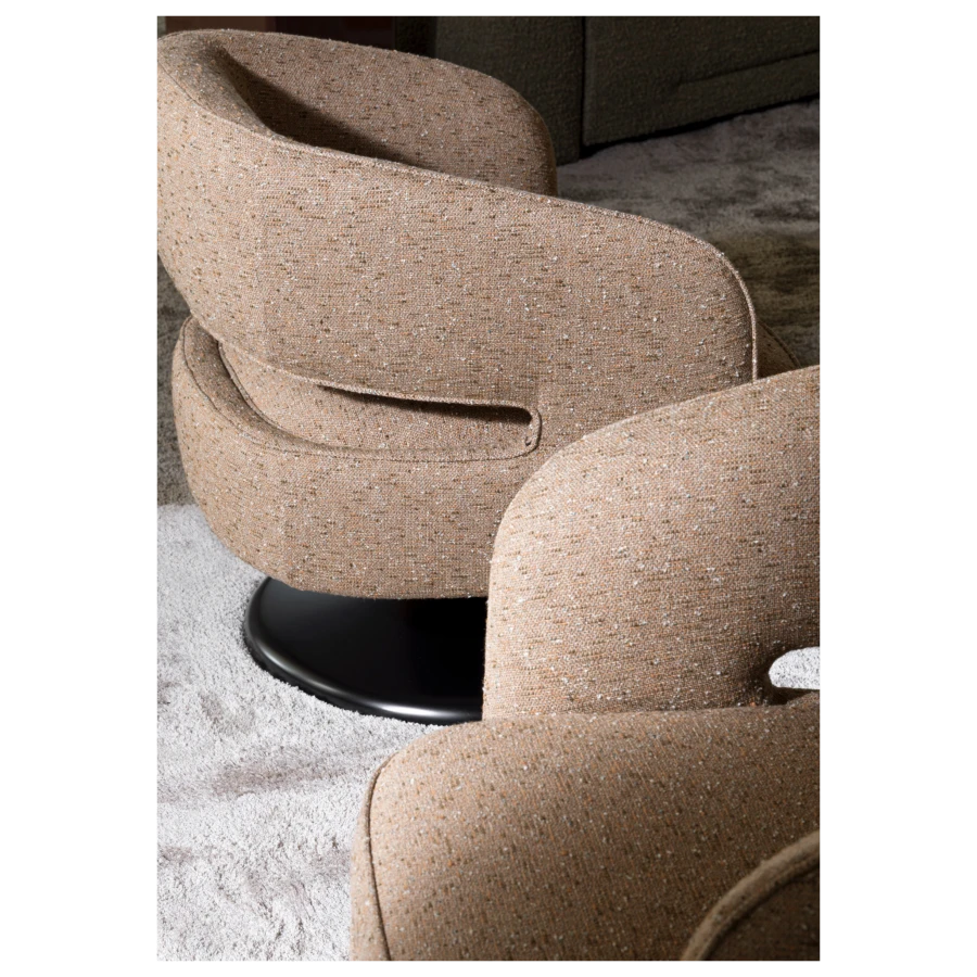 At its foundation, the Linea armchair features an iconic trumpet-shaped swivel base—an elegant nod to mid-century design, reinterpreted with contemporary fluidity. The sculptural form is further enhanced by a distinctive void in the backrest, a subtle yet impactful detail that lightens its visual presence while maintaining an enveloping sense of comfort.