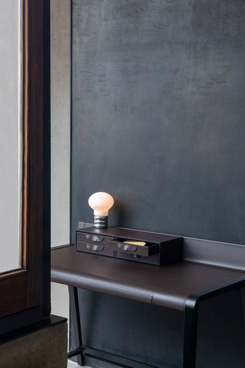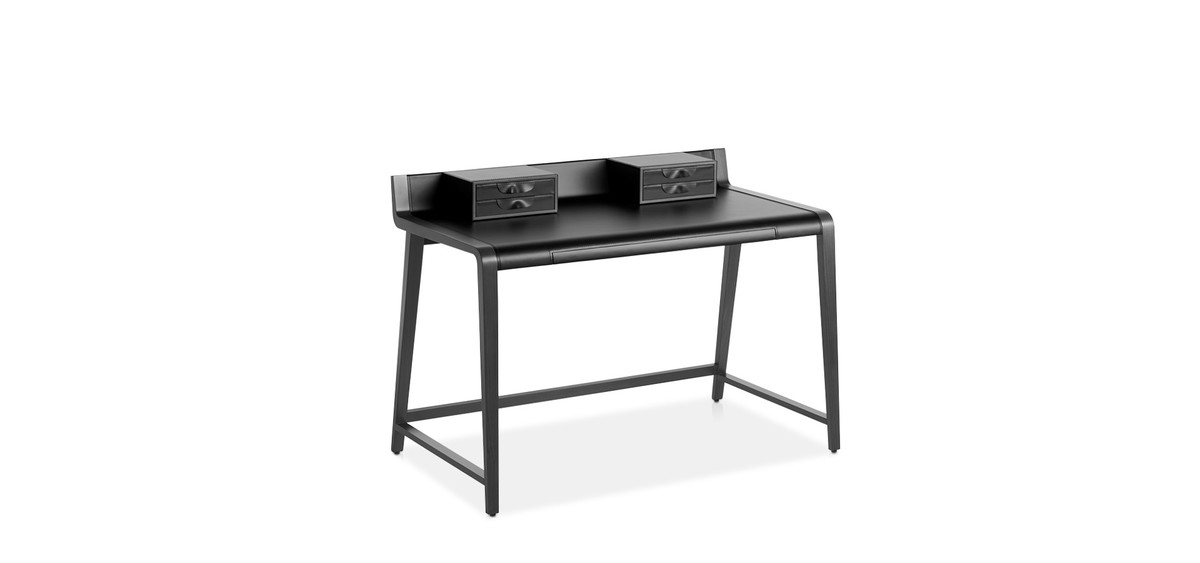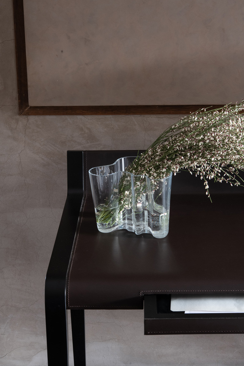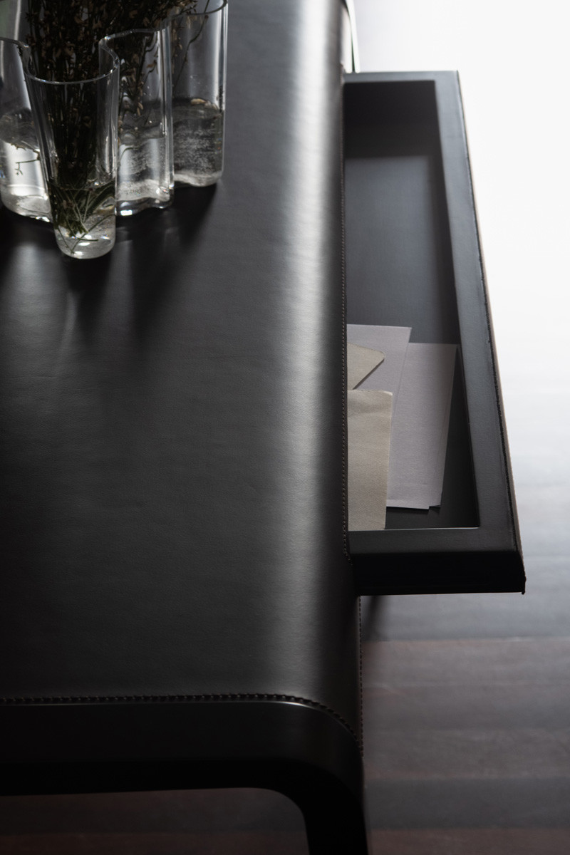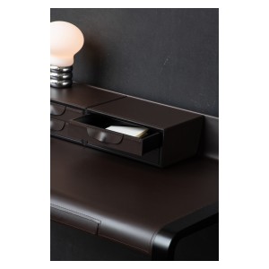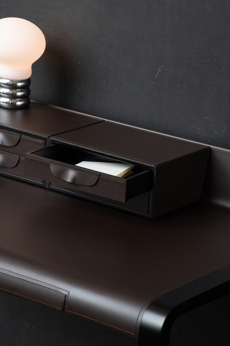 Linus is a writing desk with solid beech wood structure with top and drawers covered in hide leather. To expand its functionality, a storage compartment hidden discreetly under the top that does not affect its design.