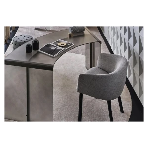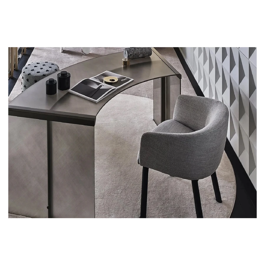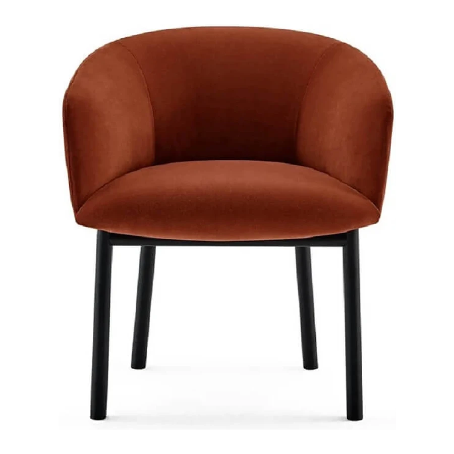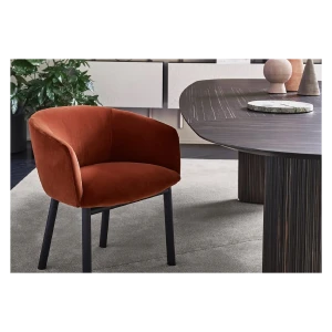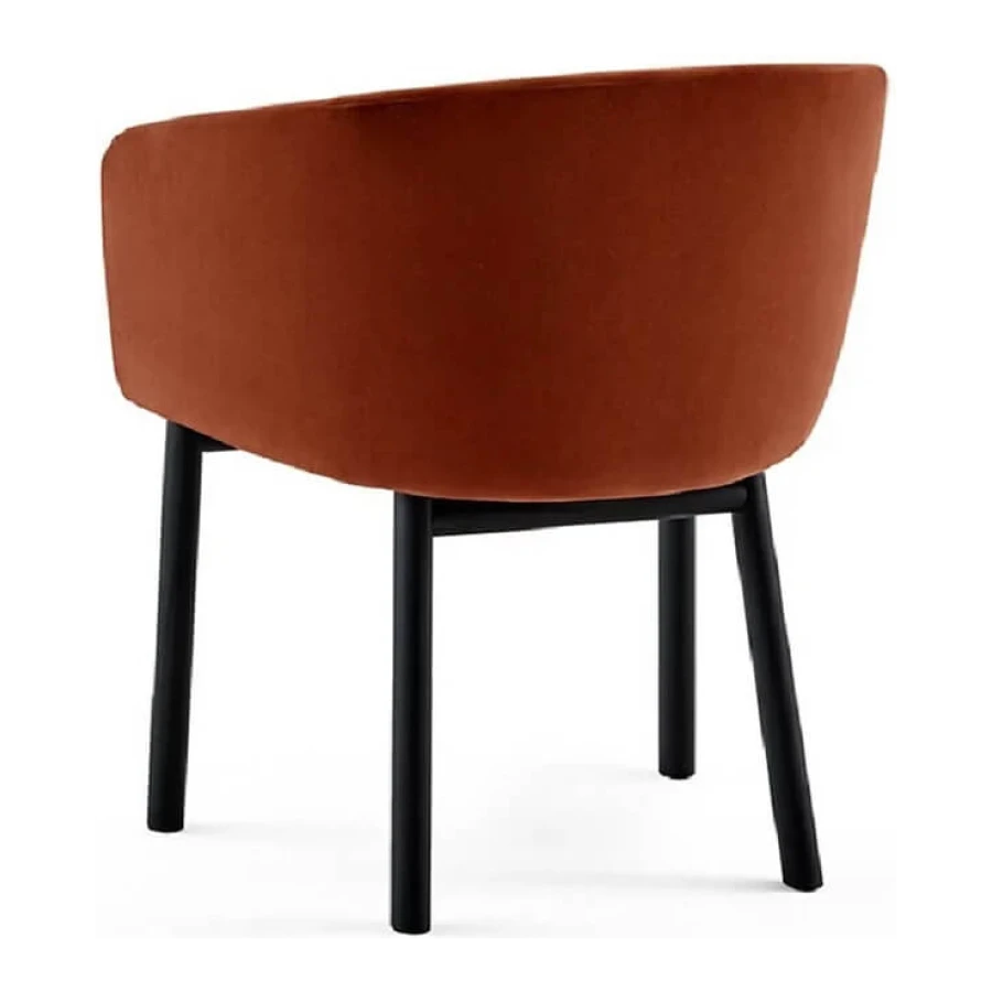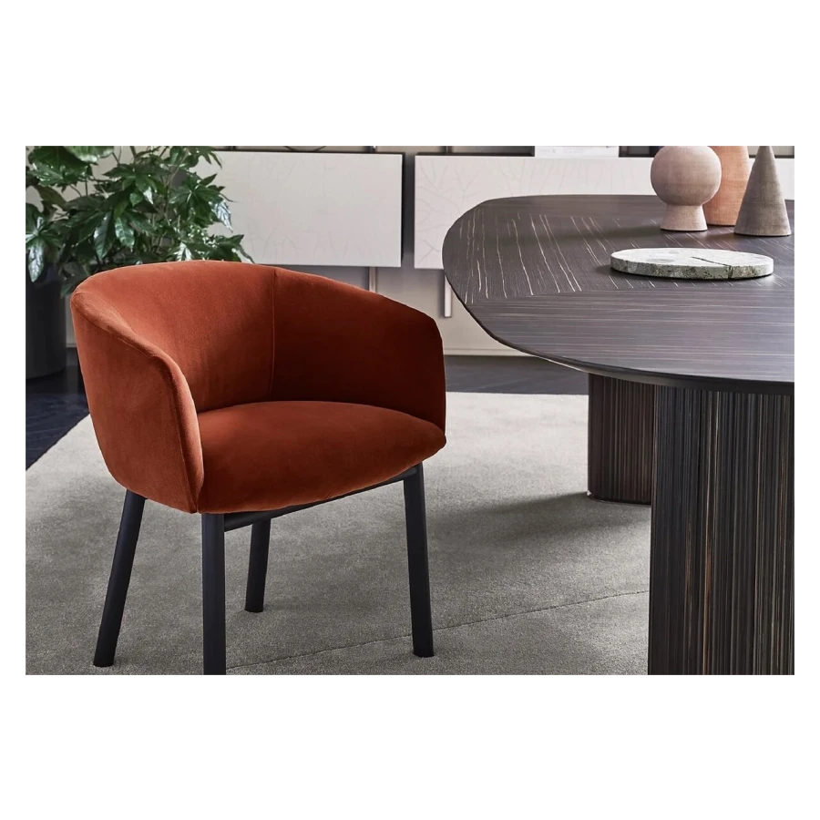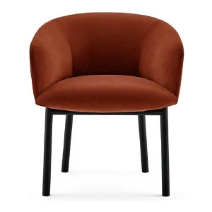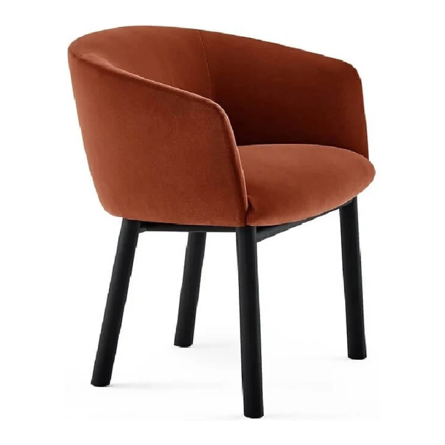 Chair with inside structure in metal dipped in polyurethane foam in different density and polyester fibre. Black open pore lacquered solid ash base. Covered by fabric or leather as per samples. Not removable cover.