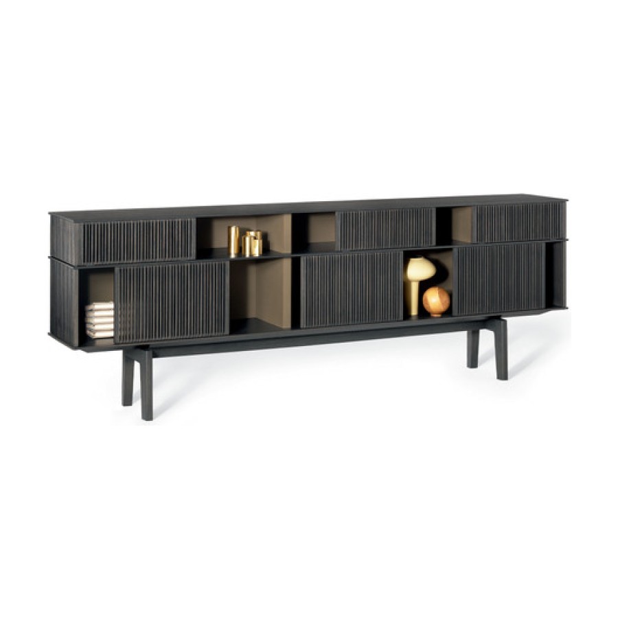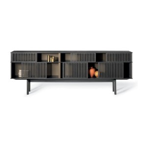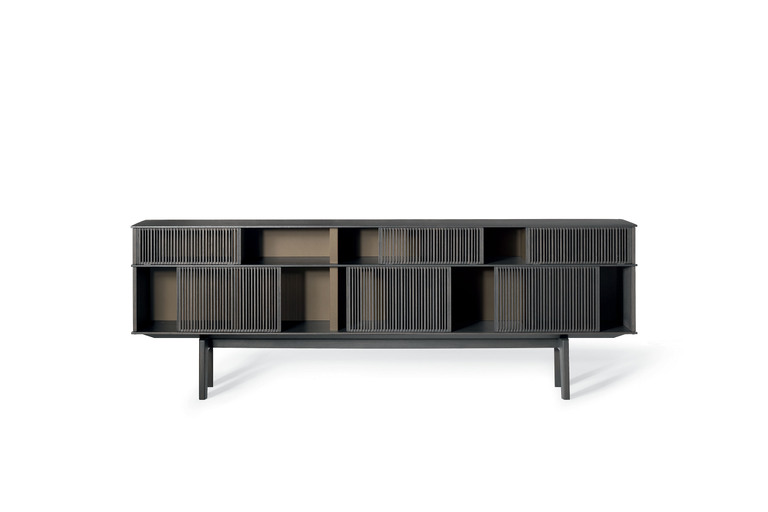 With the Lloyd storage units and bookcases Jean-Marie Massaud designs a system of variable geometries. Thin vertical wooden rods create light grilles that run from top to bottom on invisible horizontal rails. Each grille can be moved as desired to create sequences that are different each time. A fluctuating score of solids and voids, of light and shade. A sensual game that offers a glimpse of the contents, books and objects without fully revealing them. The most advanced technology is combined with traditional materials, wood and saddle leather, to form a solid and minimalist structure.