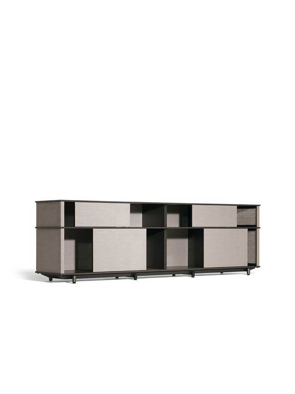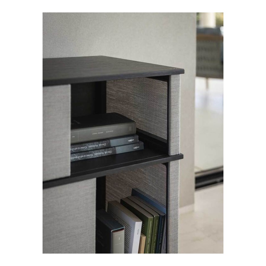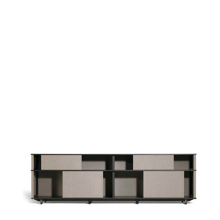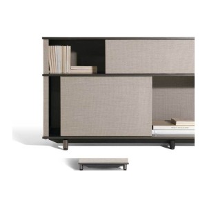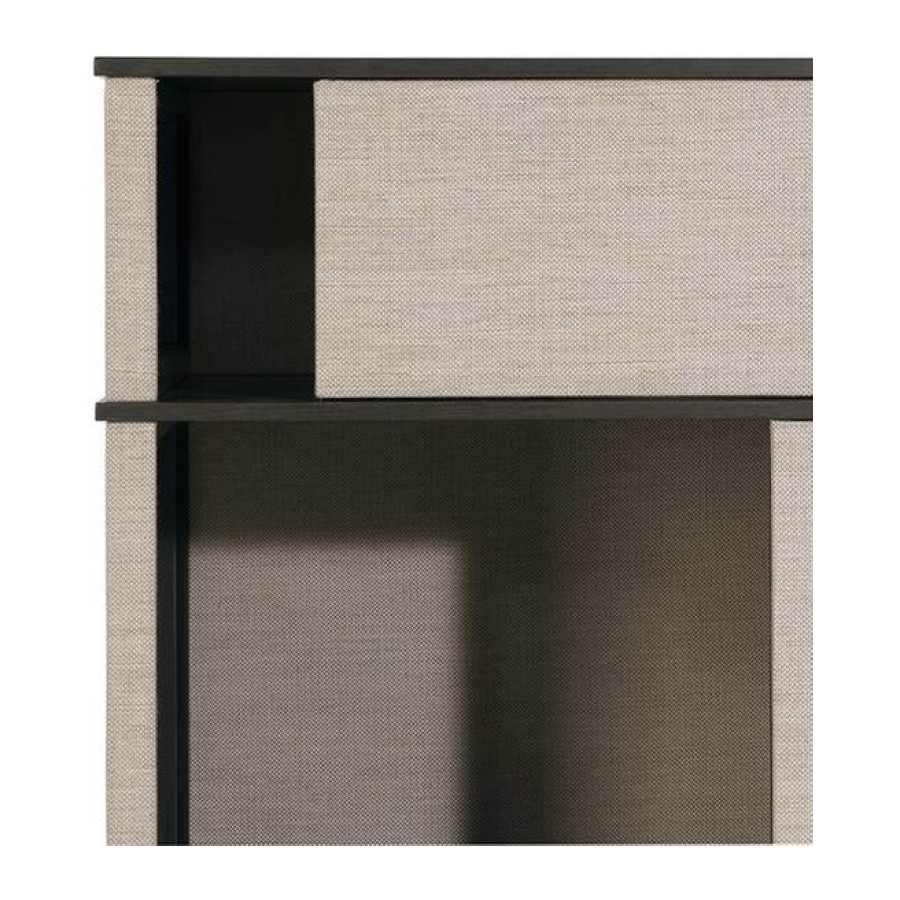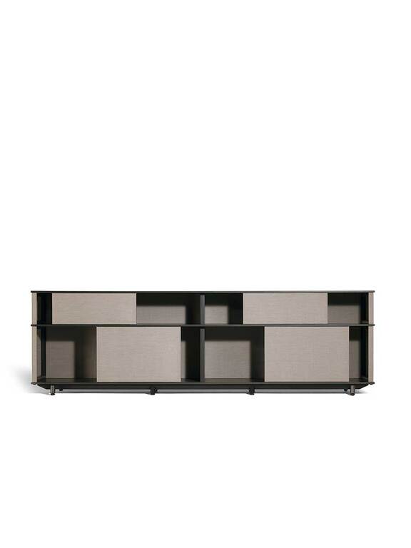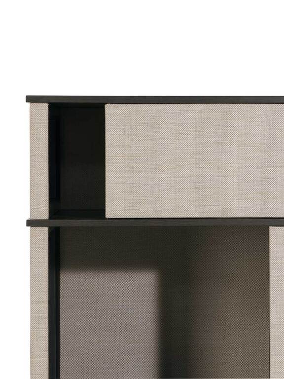 Inspired by the world of hi-fi loudspeakers, the Lloyd Tex self-supporting bookcase, designed by Jean-Marie Massaud, plays on the transparency and lightness of the Techno-fabric panels, a semi-transparent technical fabric in Light and Dark colours. The panels slide on invisible horizontal tracks, creating ever-changing sequences.