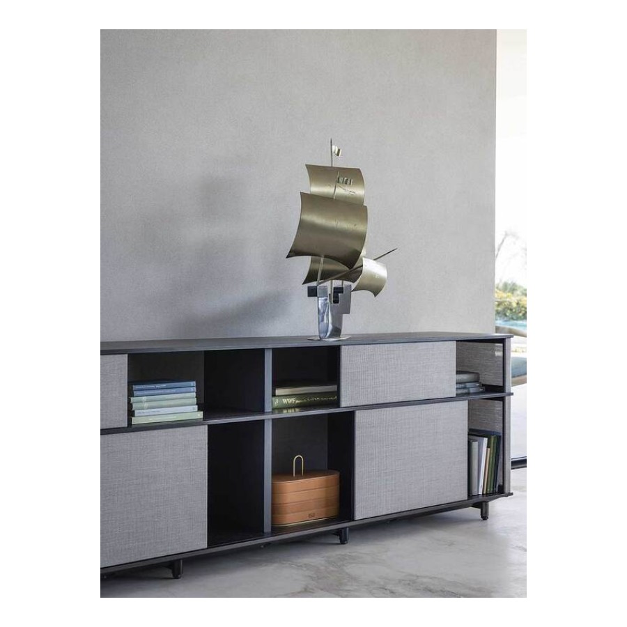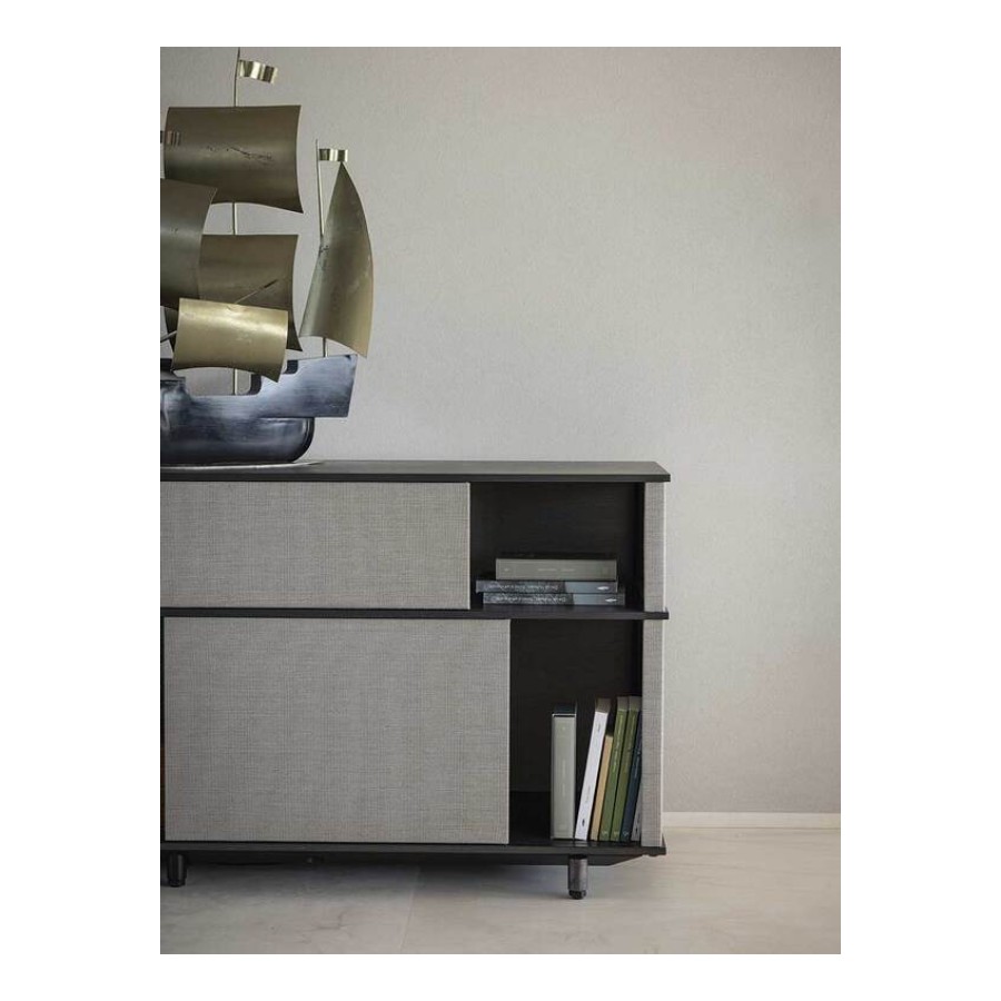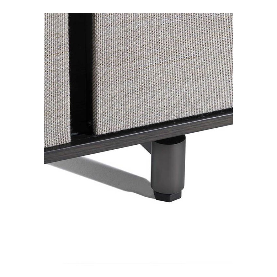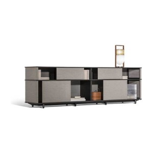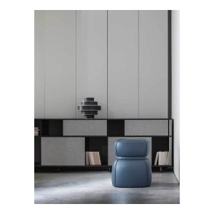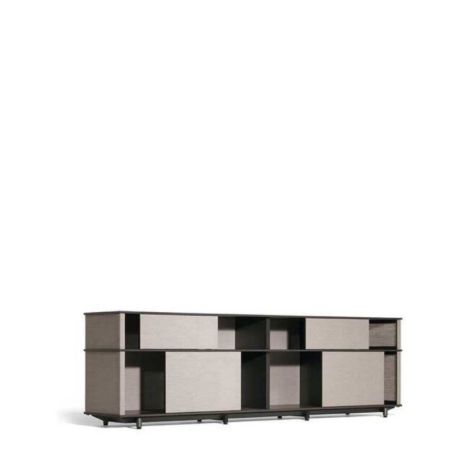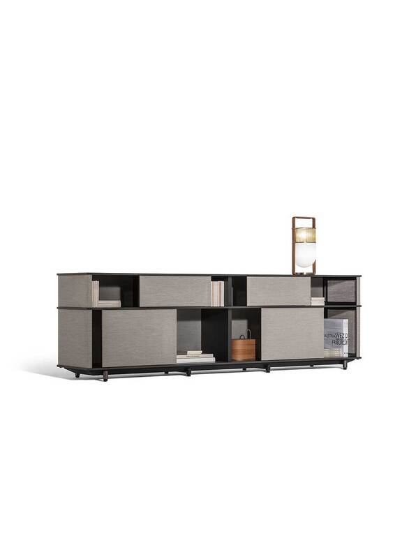 Inspired by the world of hi-fi loudspeakers, the Lloyd Tex self-supporting bookcase, designed by Jean-Marie Massaud, plays on the transparency and lightness of the Techno-fabric panels, a semi-transparent technical fabric in Light and Dark colours. The panels slide on invisible horizontal tracks, creating ever-changing sequences.