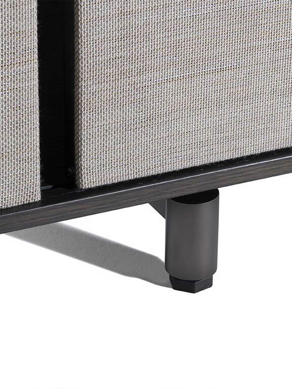 The horizontal elements on which the fabric louvres slide are created in HPL laminate, a material with a thin but sturdy thickness, veneered in oak with a matte lead finish.