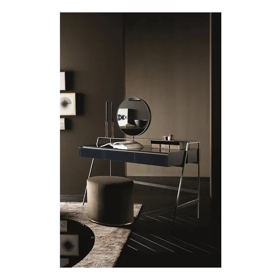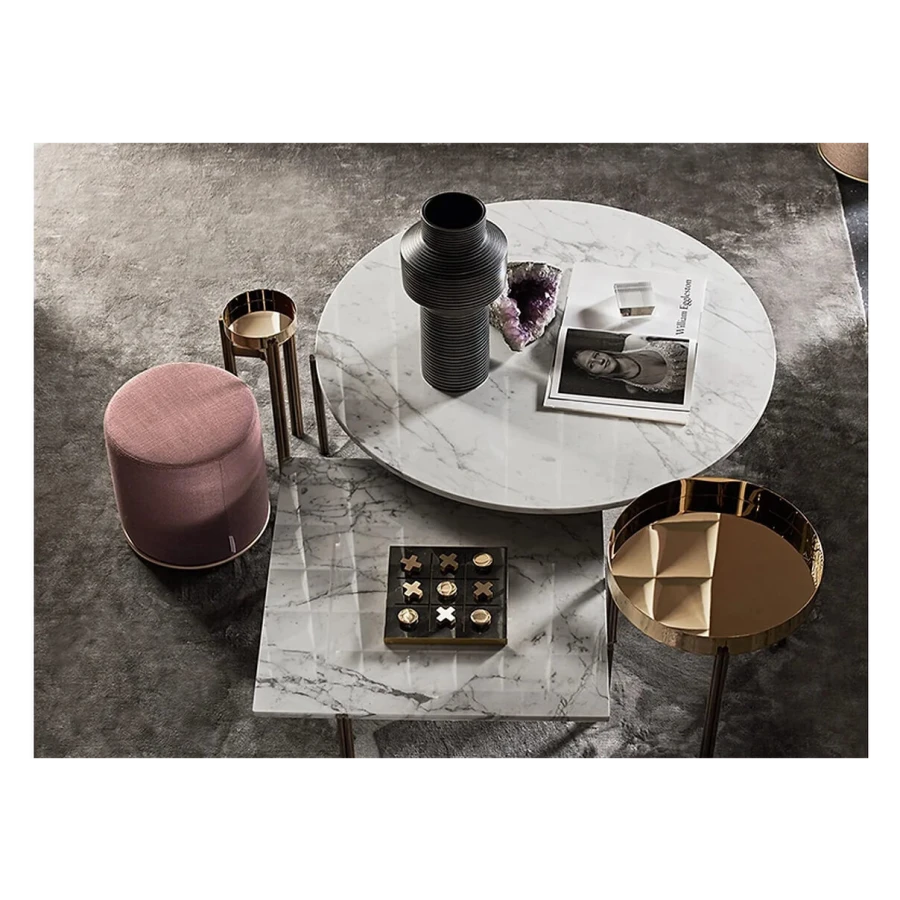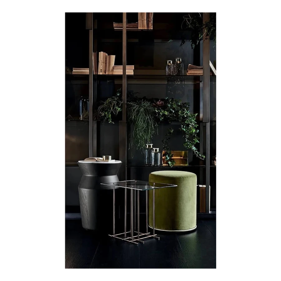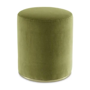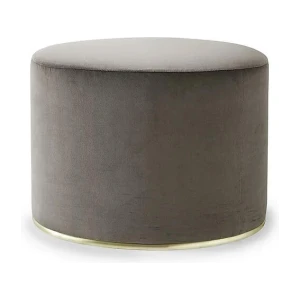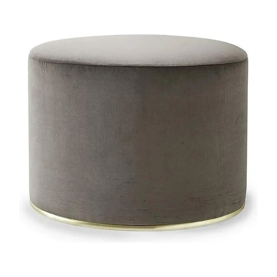 Pouffe with inside structure in wood and by-products padded in non-deformable foam polyurethane in different density and polyester fibre. Metal parts in satin brass. Covered by fabric or leather as per samples. Not removable cover.