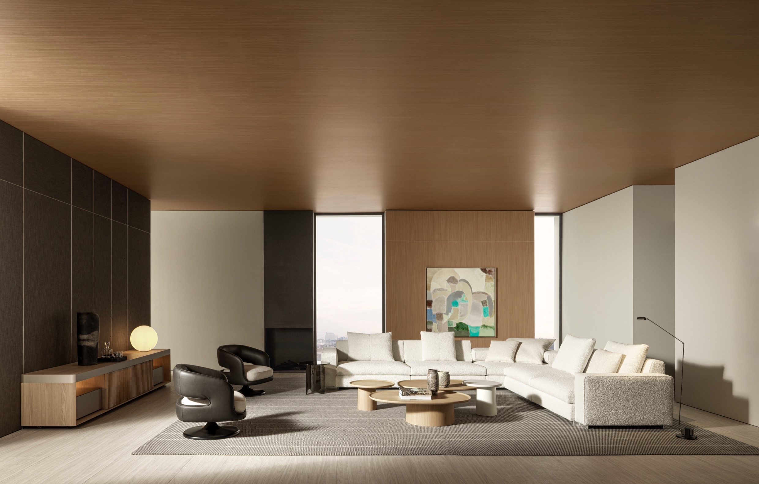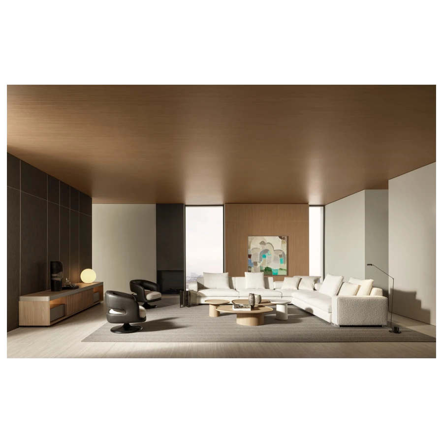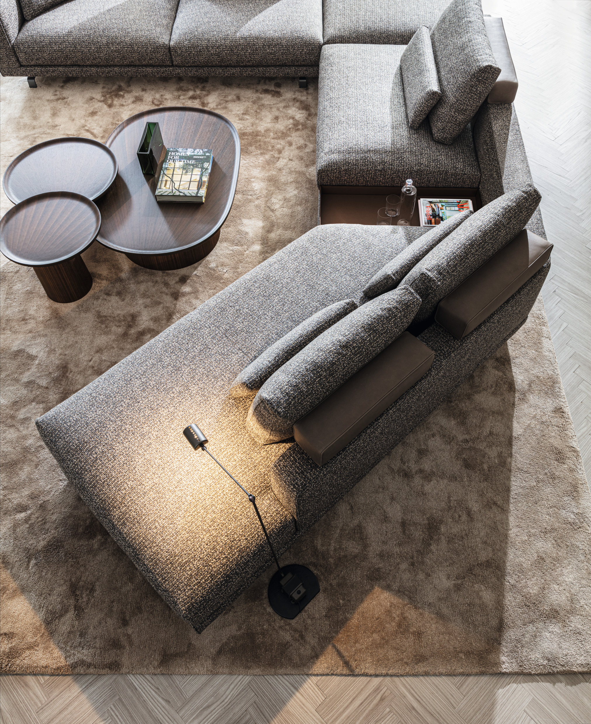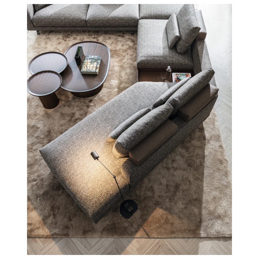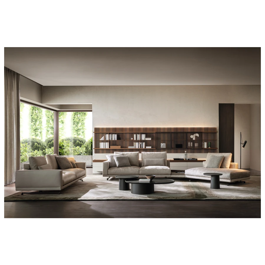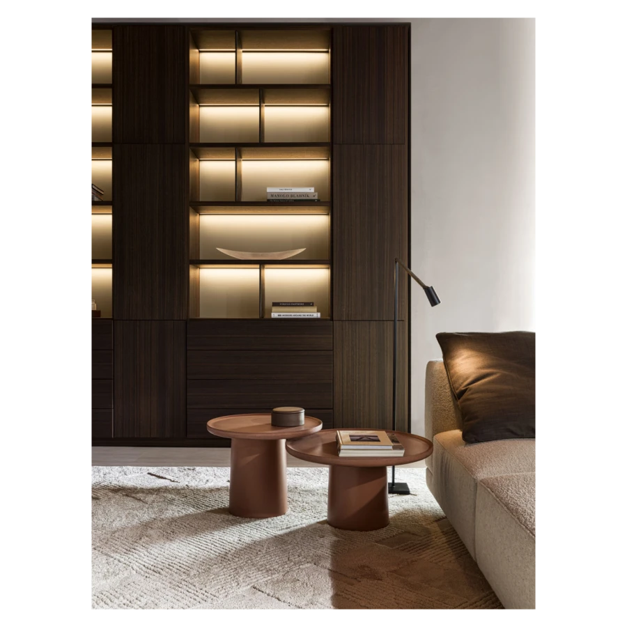The load-bearing structure, a conical central plinth, is raised from the floor and inserted into a space hollowed out within it. Transversal objects, combined at will, simply, lightly, elegantly: the quintessence of modern design.