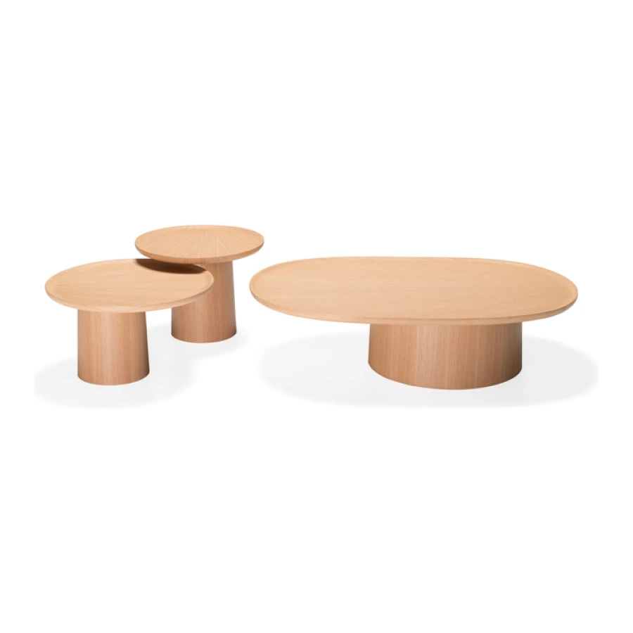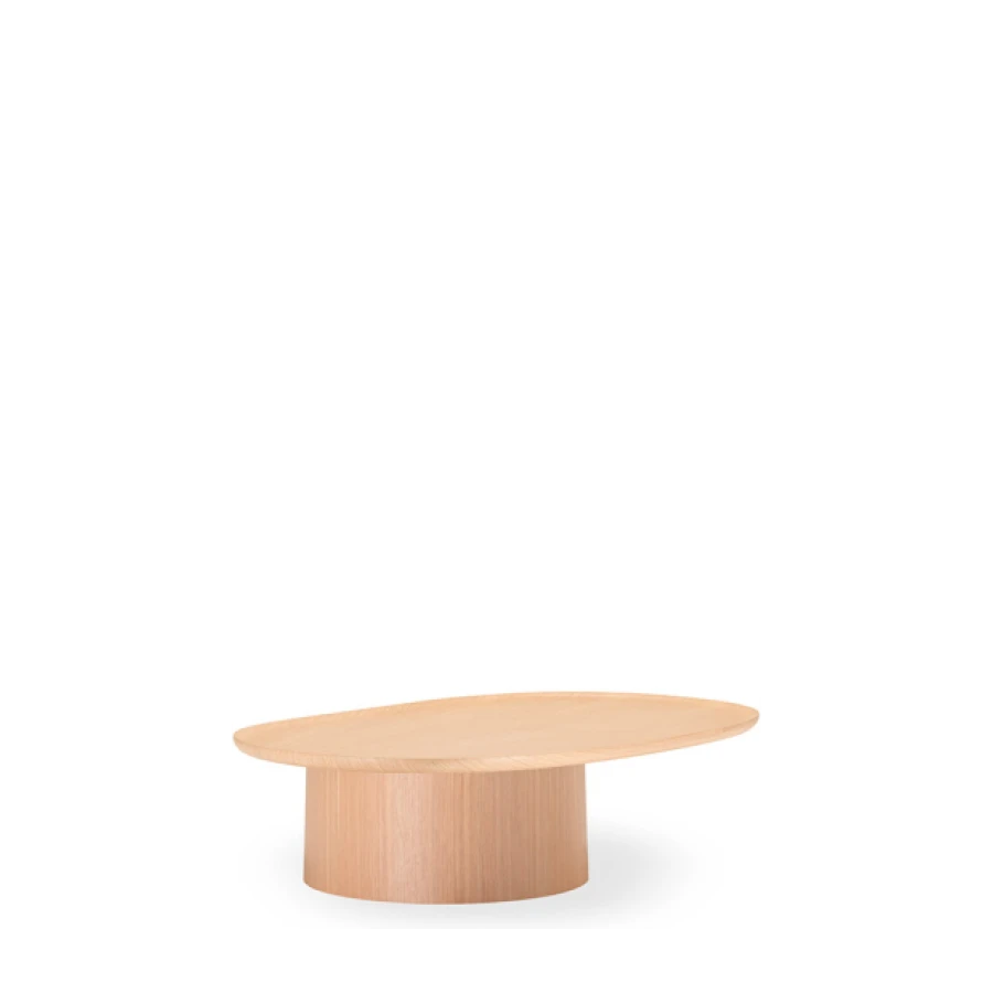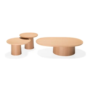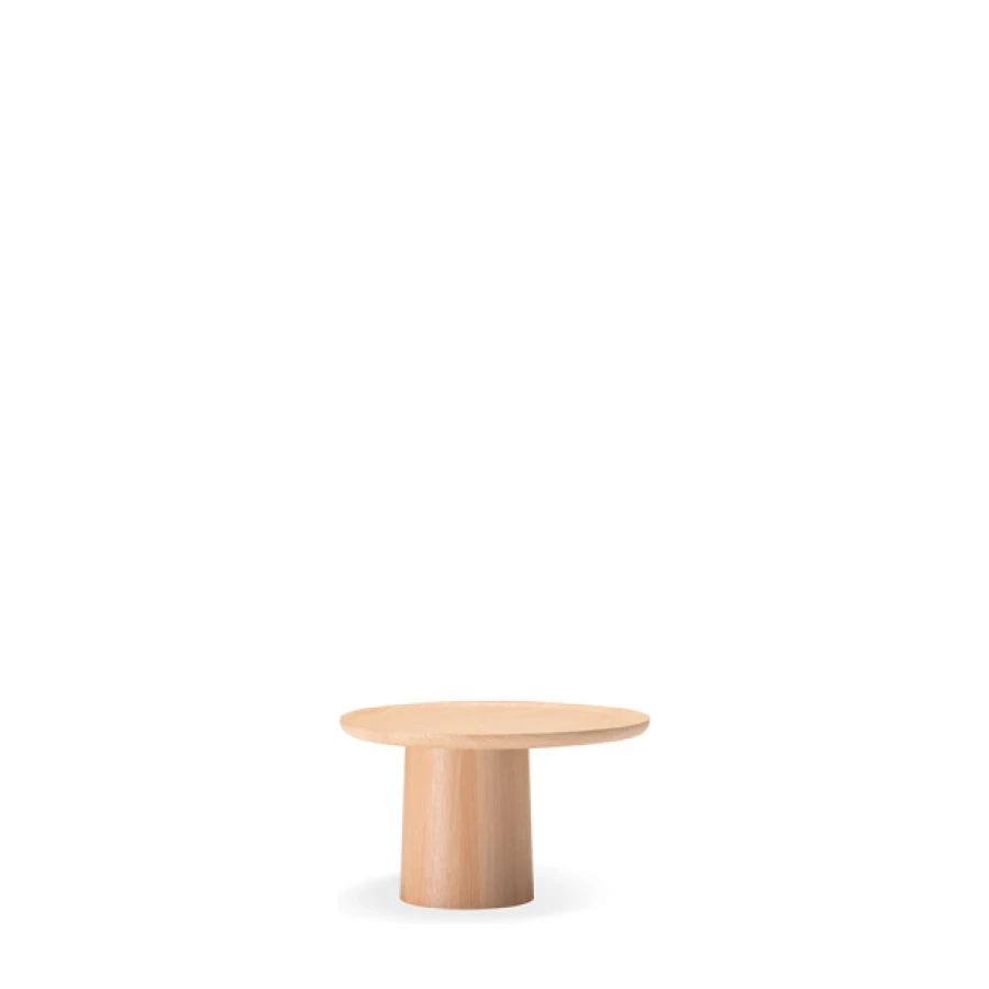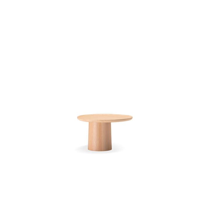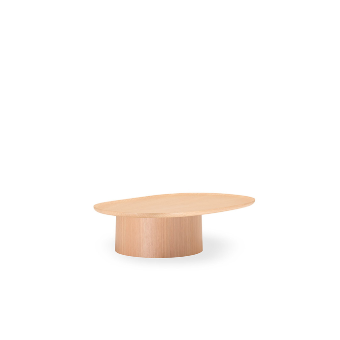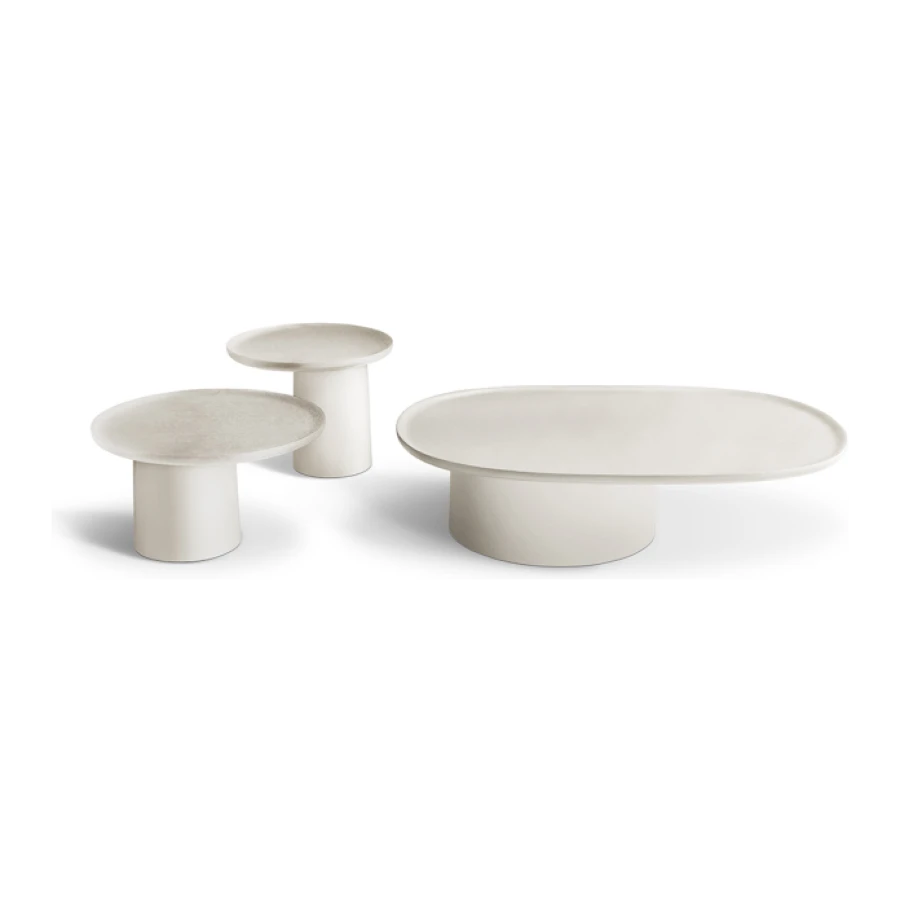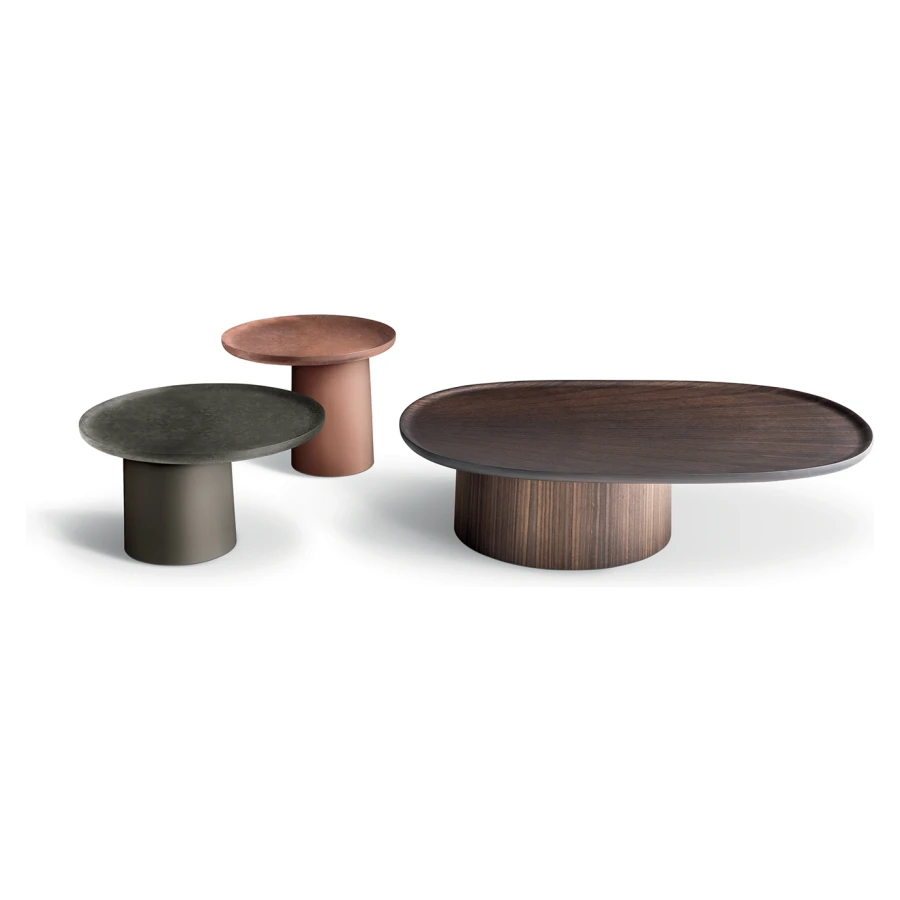 The table tops, a bit like suspended trays, come in ash, white or brick red cement or in eucalyptus wood and feature an original radial motif, achieved by means of a special procedure for joining up the slabs.
