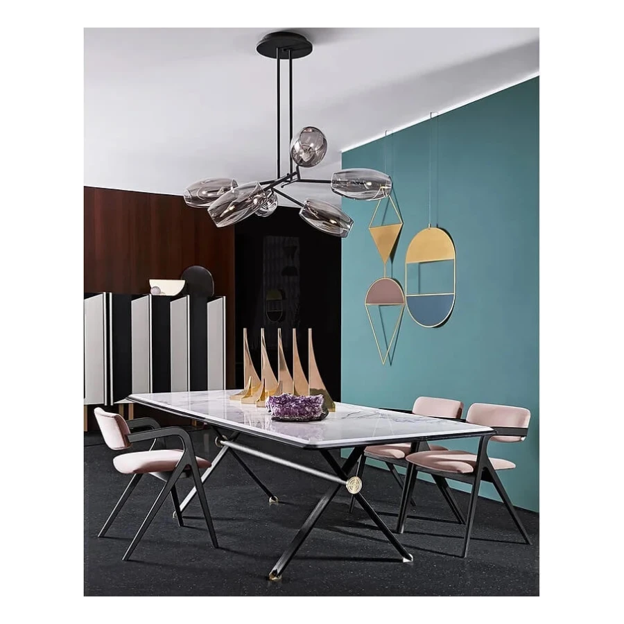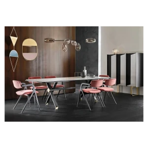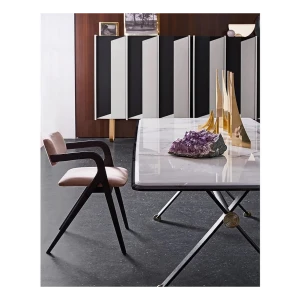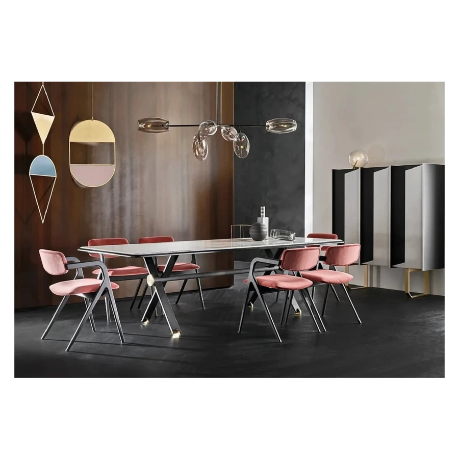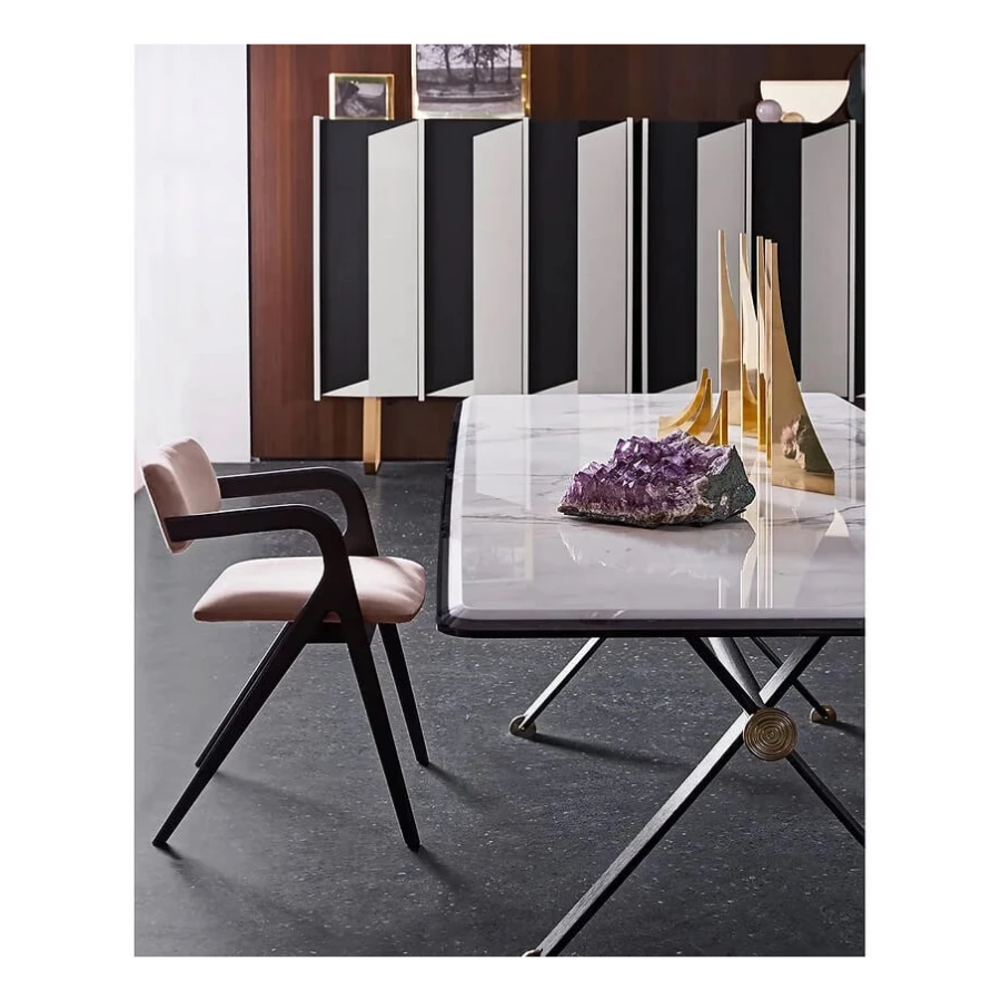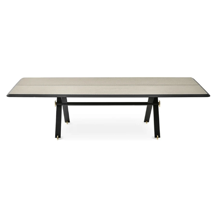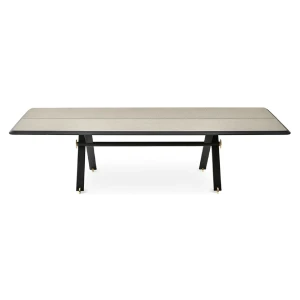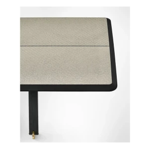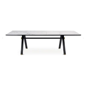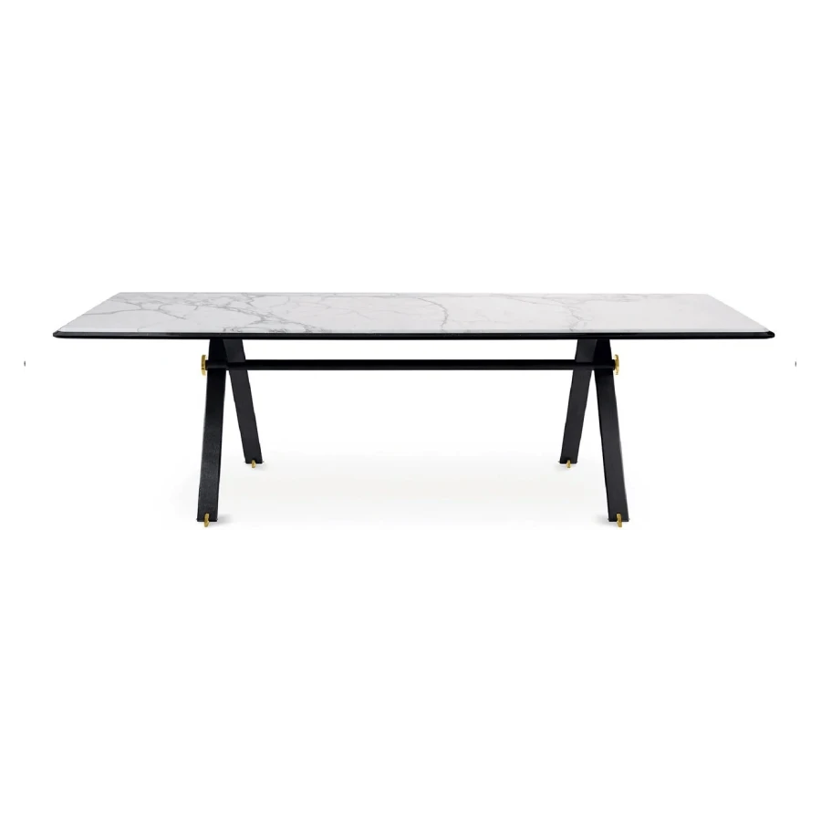 Table with black hand brushed anodised aluminium structure. Bright brass details. Bianco Statuario and Nero Marquinia marble laminated bevelled top. Also available in inlaid wooden top with “Tweed” pattern. 15mm painted bevelled glass top as per samples in the bright or satin version, on request. Available version with 15mm bevelled glass top and aluminum structure and details completely painted in the exclusive antique bronze and lead finish.