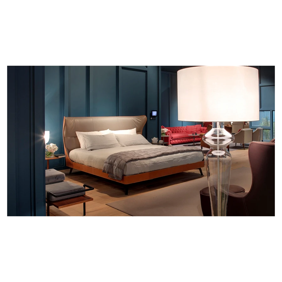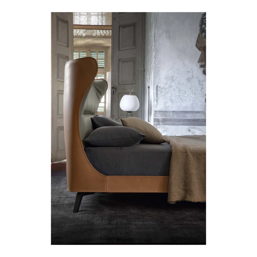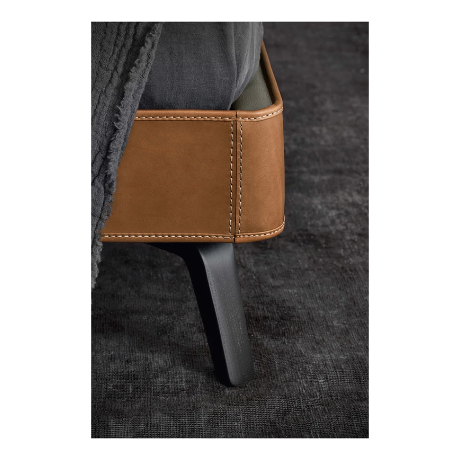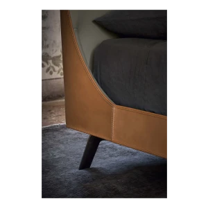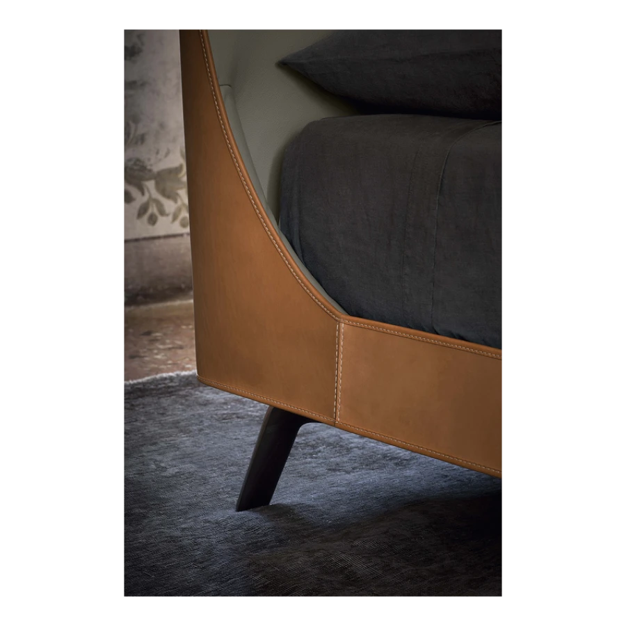 The central part of Mamy Blue Bed’s headboard is made of solid beech and poplar and birch plywood while the sides are in moulded polyurethane foam. The feet, in ash with a wenge or moka stain, counterbalance the majesty of the bed, lifting it from the ground and lightening its visual impact. Bed frame in spruce blockboard and MDF with footboard in poplar plywood. The upholstery is in Cuoio Saddle Extra leather, combined with Pelle Frau® leather for the inside of the headboard. The combination of the various materials is enhanced by the impeccable visible contrast stitching.
