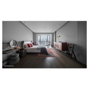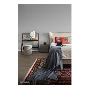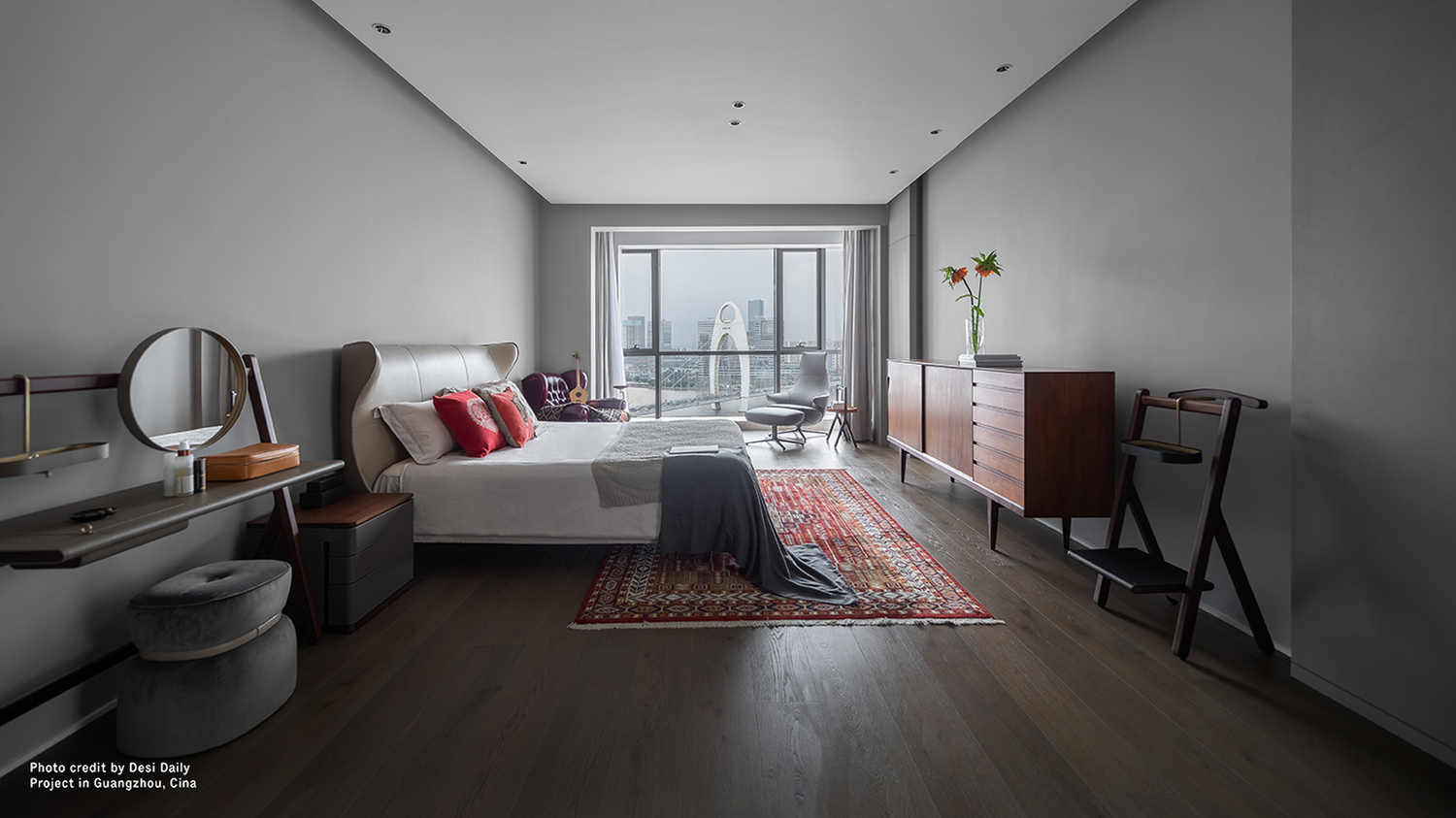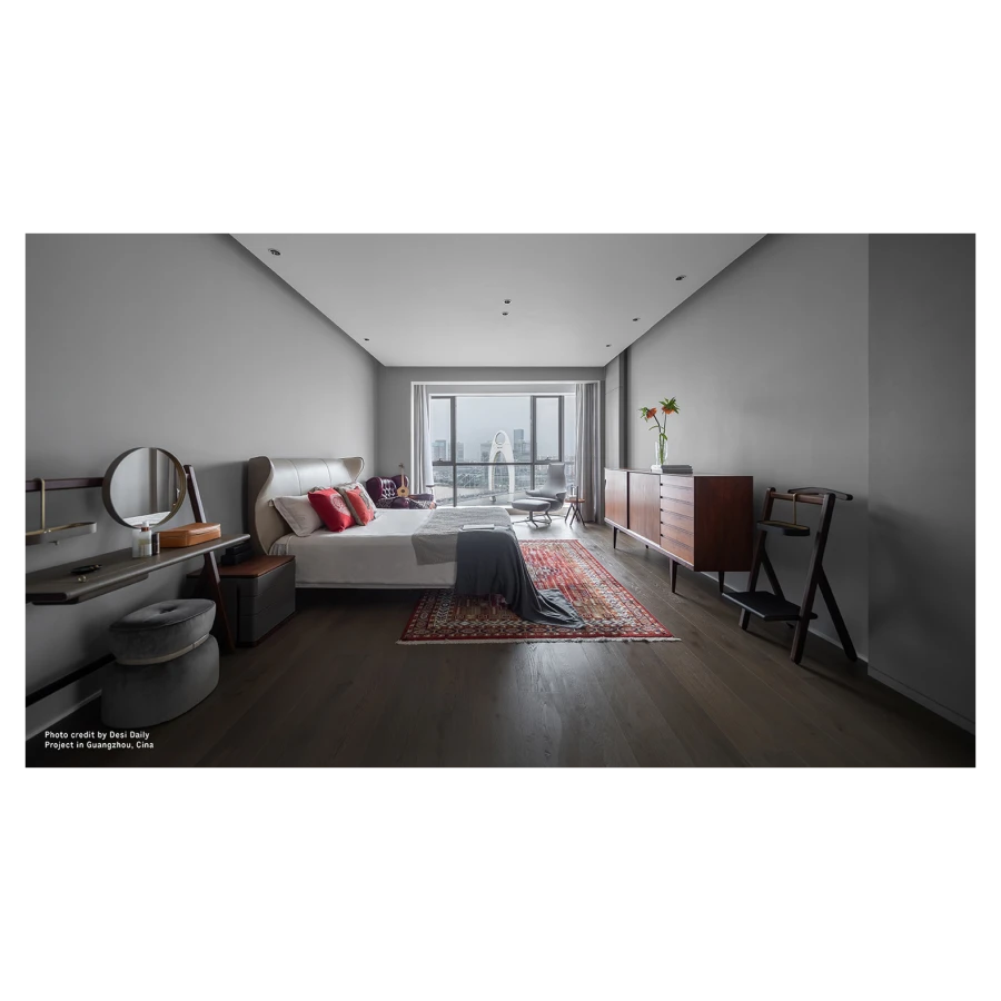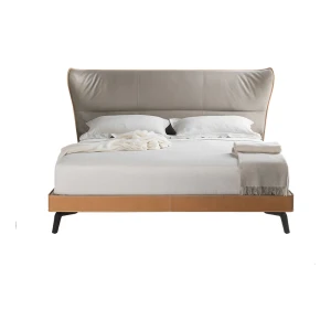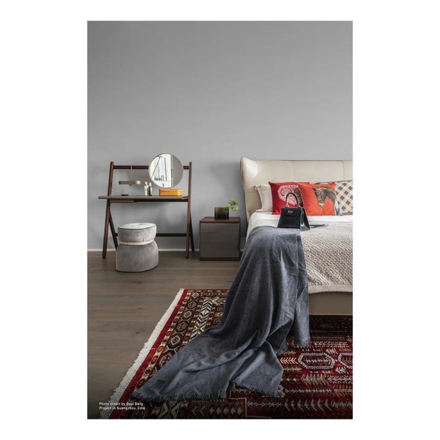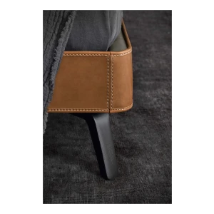 The central part of Mamy Blue Bed’s headboard is made of solid beech and poplar and birch plywood while the sides are in moulded polyurethane foam. The feet, in ash with a wenge or moka stain, counterbalance the majesty of the bed, lifting it from the ground and lightening its visual impact. Bed frame in spruce blockboard and MDF with footboard in poplar plywood. The upholstery is in Cuoio Saddle Extra leather, combined with Pelle Frau® leather for the inside of the headboard. The combination of the various materials is enhanced by the impeccable visible contrast stitching.