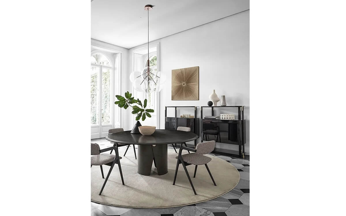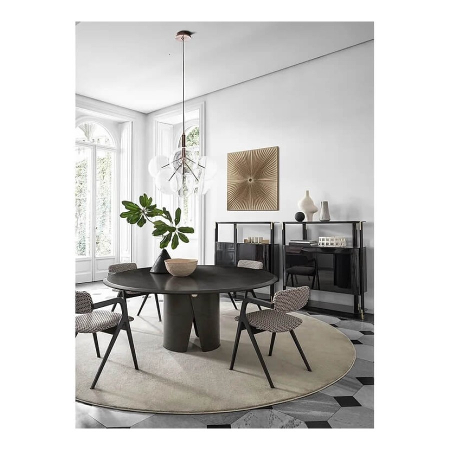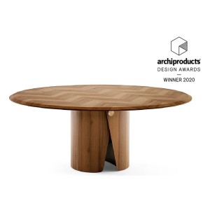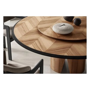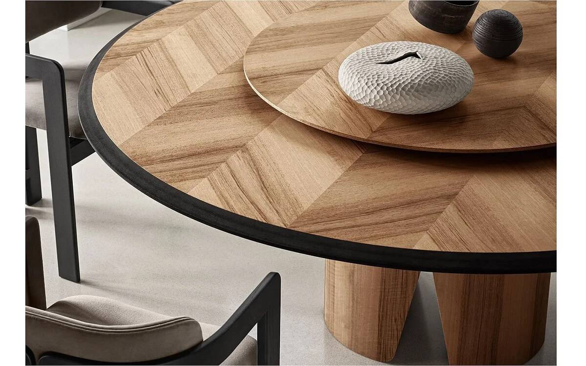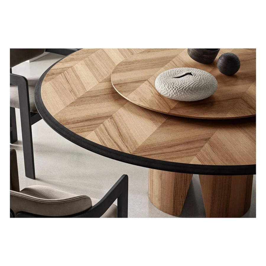 Table with top in “Colore” Frisè Walnut herringbone wood inlay and black bevelled edge. Also available in “Colore” Frisè Walnut, dark grey Frisé Maple or white Frisè Tanganika with bevelled edge in the same finish. Curved base with satin brass button. Resting lazy susan on request, available in the same finishes as the table top.