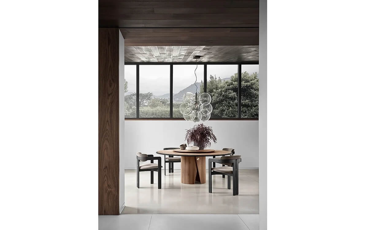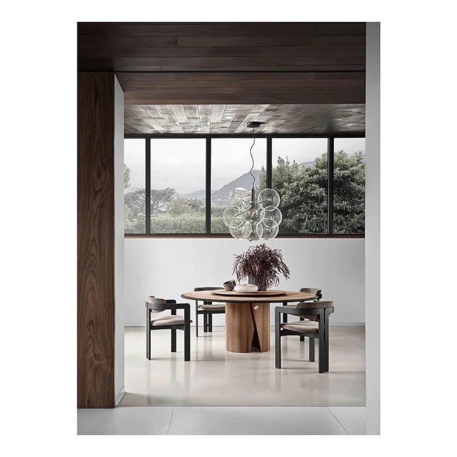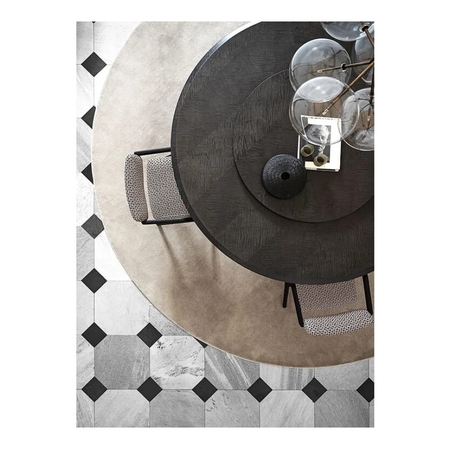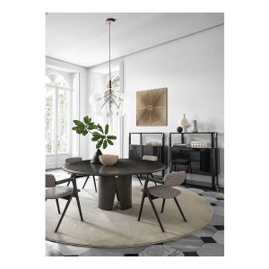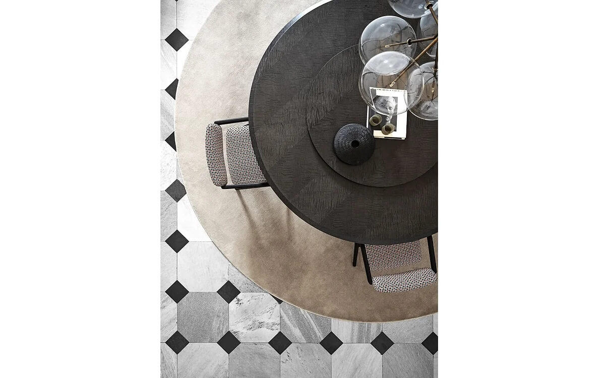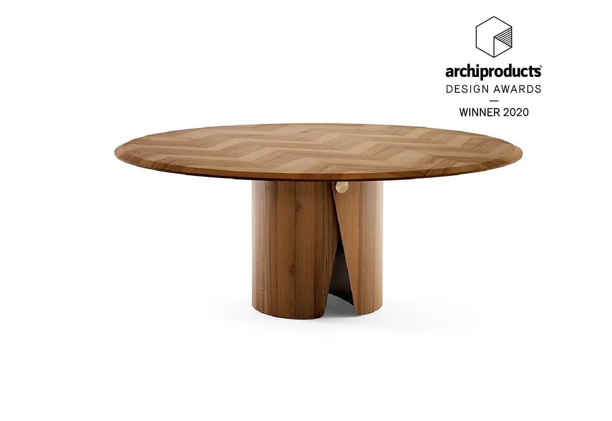 Table with top in “Colore” Frisè Walnut herringbone wood inlay and black bevelled edge. Also available in “Colore” Frisè Walnut, dark grey Frisé Maple or white Frisè Tanganika with bevelled edge in the same finish. Curved base with satin brass button. Resting lazy susan on request, available in the same finishes as the table top.