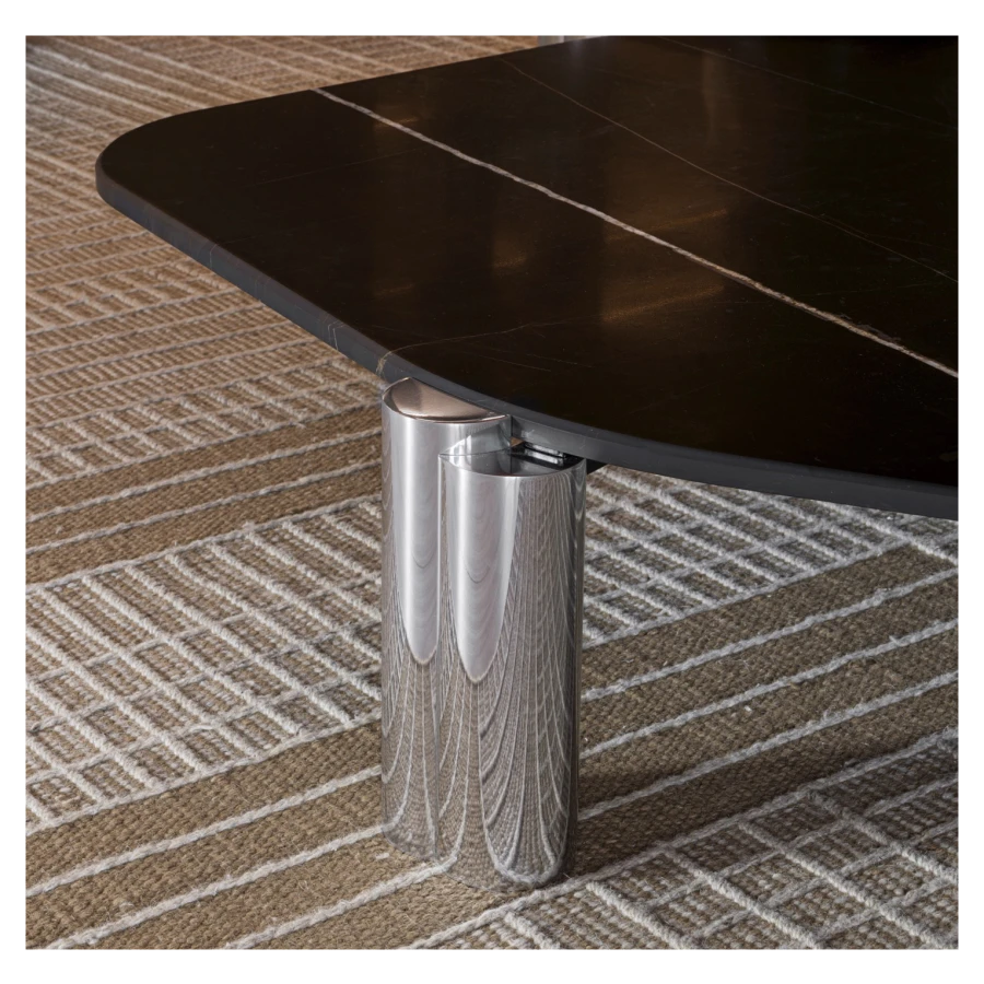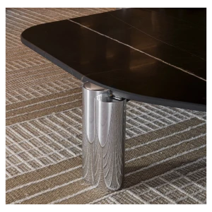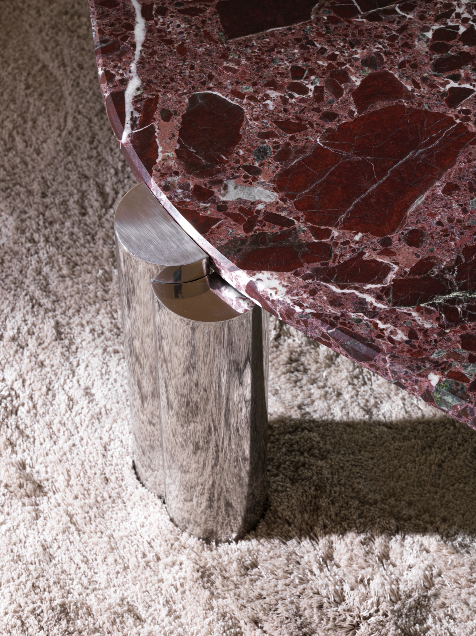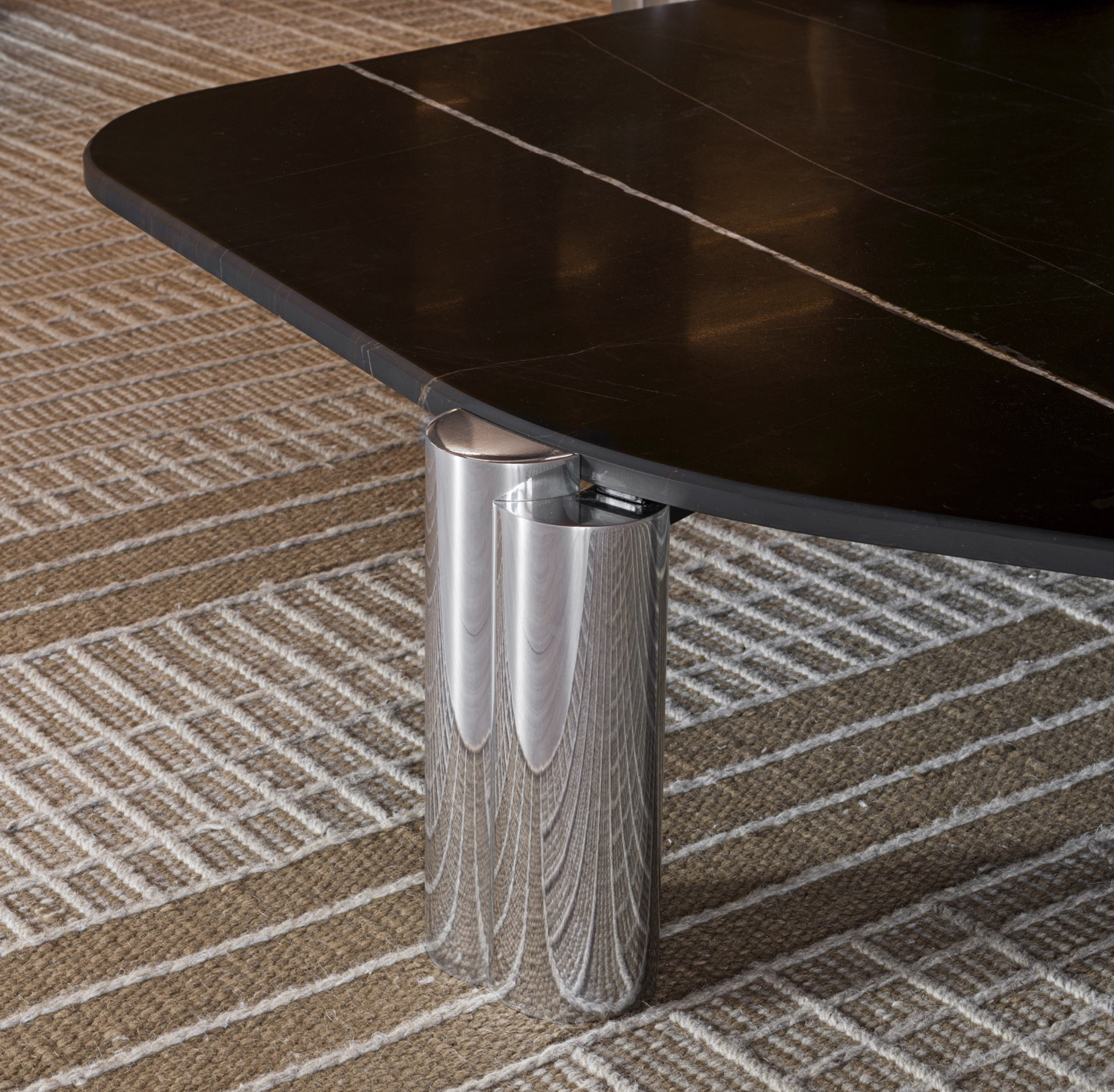 The interplay of materials defines Maylis—the smooth, polished surface meets the striking architectural base, composed of three pairs of half-moon aluminum legs arranged at varying heights. This dynamic structure creates an ever-changing visual effect, where light and shadow accentuate the depth of its design from every angle.