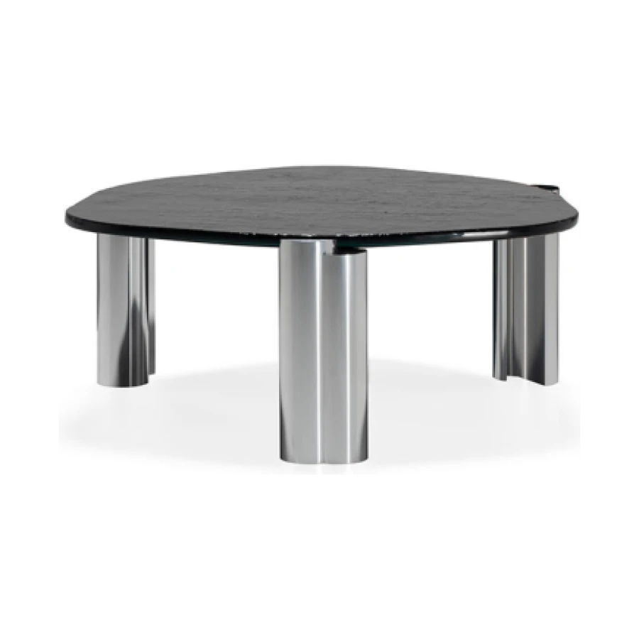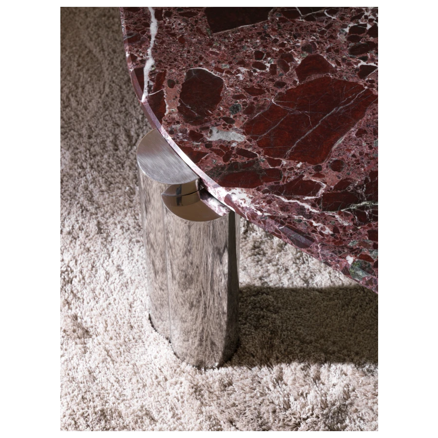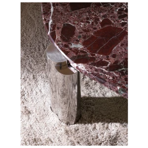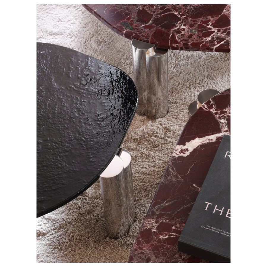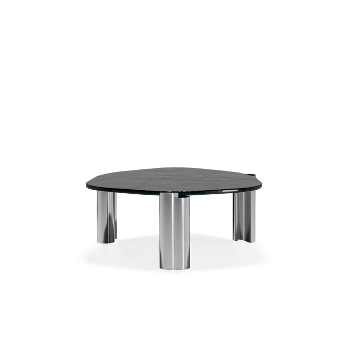 The interplay of materials defines Maylis—the smooth, polished surface meets the striking architectural base, composed of three pairs of half-moon aluminum legs arranged at varying heights. This dynamic structure creates an ever-changing visual effect, where light and shadow accentuate the depth of its design from every angle.