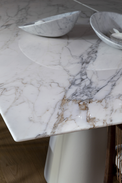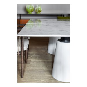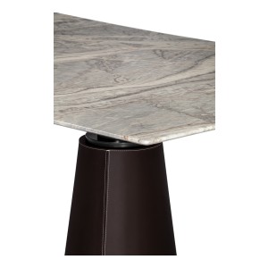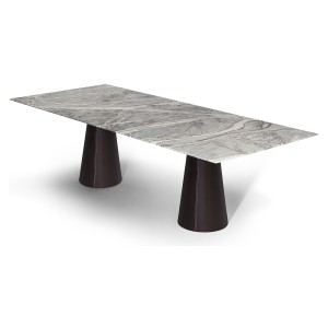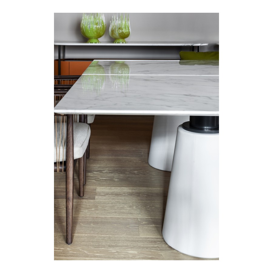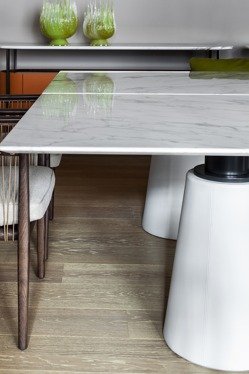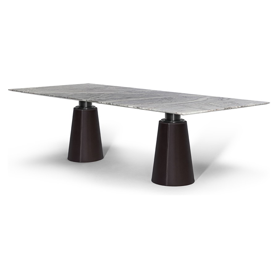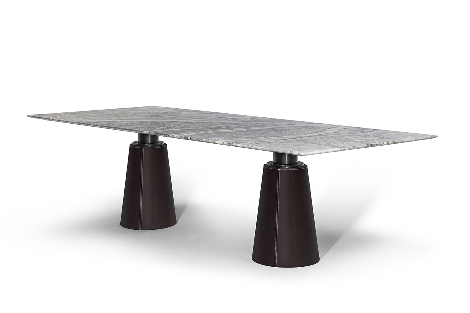 The base of the Mesa Due table can be in grey pietra serena or in steel with upholstery in Cuoio Saddle Extra leather with contrast stitching or Pelle Frau® ColorSphere® with tone-on-tone stitching. The steel base maintains its stability through a special system of internal counterweights and has a plastic shaped tip at the bottom to protect the floor. The joint between the top and the column is made of black painted tubular steel to which a three-bracket joint plate is attached with adjustable supports to keep the surface level. In the rectangular table there are two supporting columns and the joint plates have 3 brackets. Only in the round 150 and 180 cm tables with marble top is there a larger support with five-bracket joint plate.