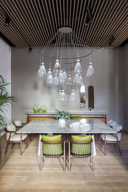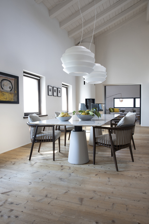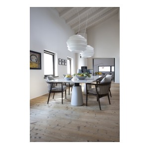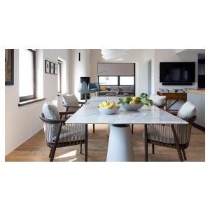 The Mesa table model with slate top and load bearing column in pietra serena is joined by new sizes that offer a greater variety of possible uses: the Mesa Due model comes as a bistro table with diameter of 120 cm, a dining table with diameter of 150 or 180 cm, and a rectangular table measuring 260 x 110.