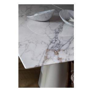The top is available in numerous versions ranging from wood to leather and through to marble. The wood versions are veneered in cut ash wood with moka or wenge stain finish. The 120 and 150 cm round tables can also be upholstered with Pelle Frau® SC leather. In this case the top is made from double panelling with tapered edge. The bottom part is finished with texturised black paint, the top part upholstered in leather. With the exception of the bistro table, all of the other models can be fitted with a Calacatta gold or Fior di Pesco marble top with polished or semi-polished finish.
