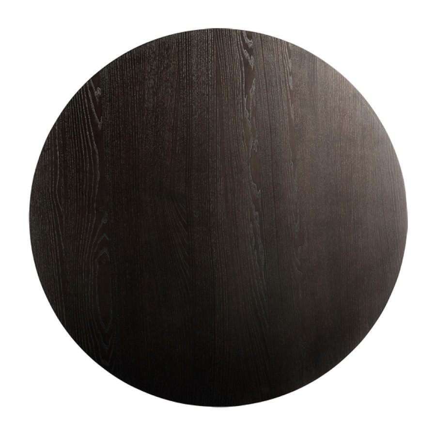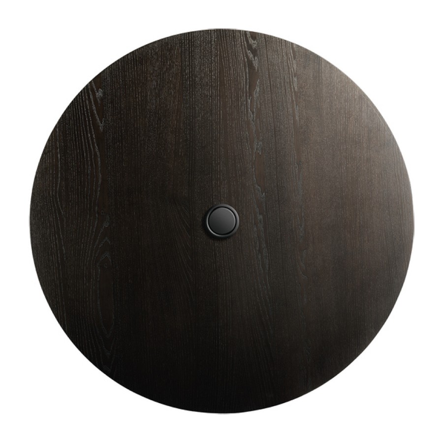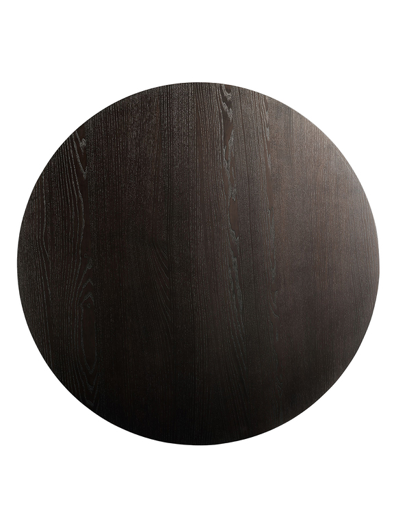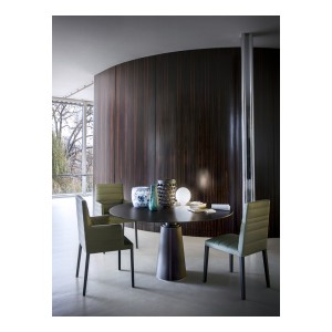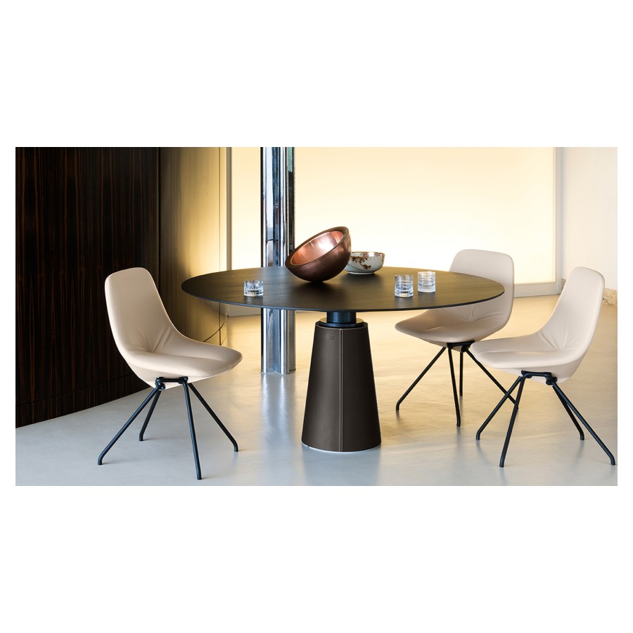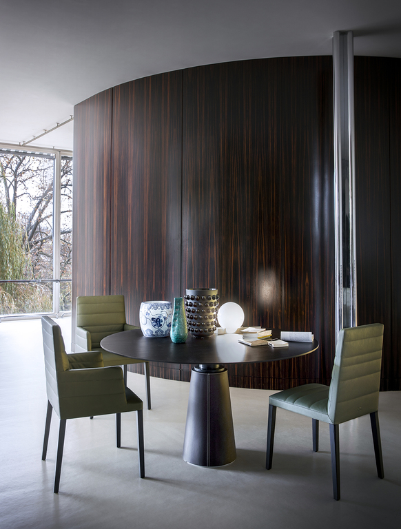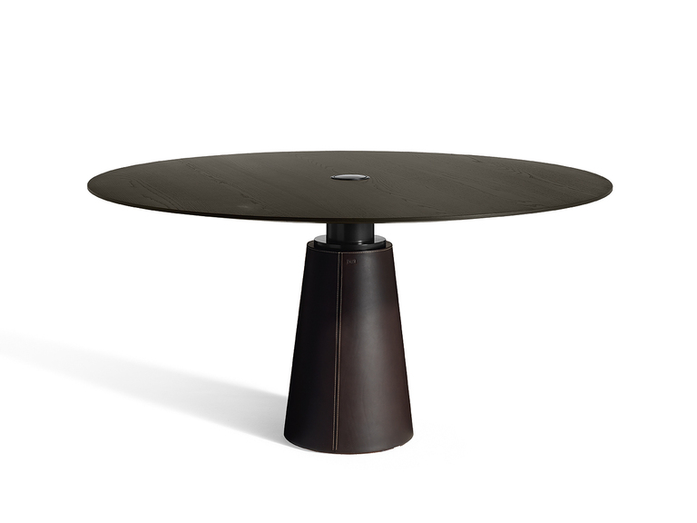 The top is available in numerous versions ranging from wood to leather and through to marble. The wood versions are veneered in cut ash wood with moka or wenge stain finish. The 120 and 150 cm round tables can also be upholstered with Pelle Frau® SC leather. In this case the top is made from double panelling with tapered edge. The bottom part is finished with texturised black paint, the top part upholstered in leather. With the exception of the bistro table, all of the other models can be fitted with a Calacatta gold or Fior di Pesco marble top with polished or semi-polished finish.