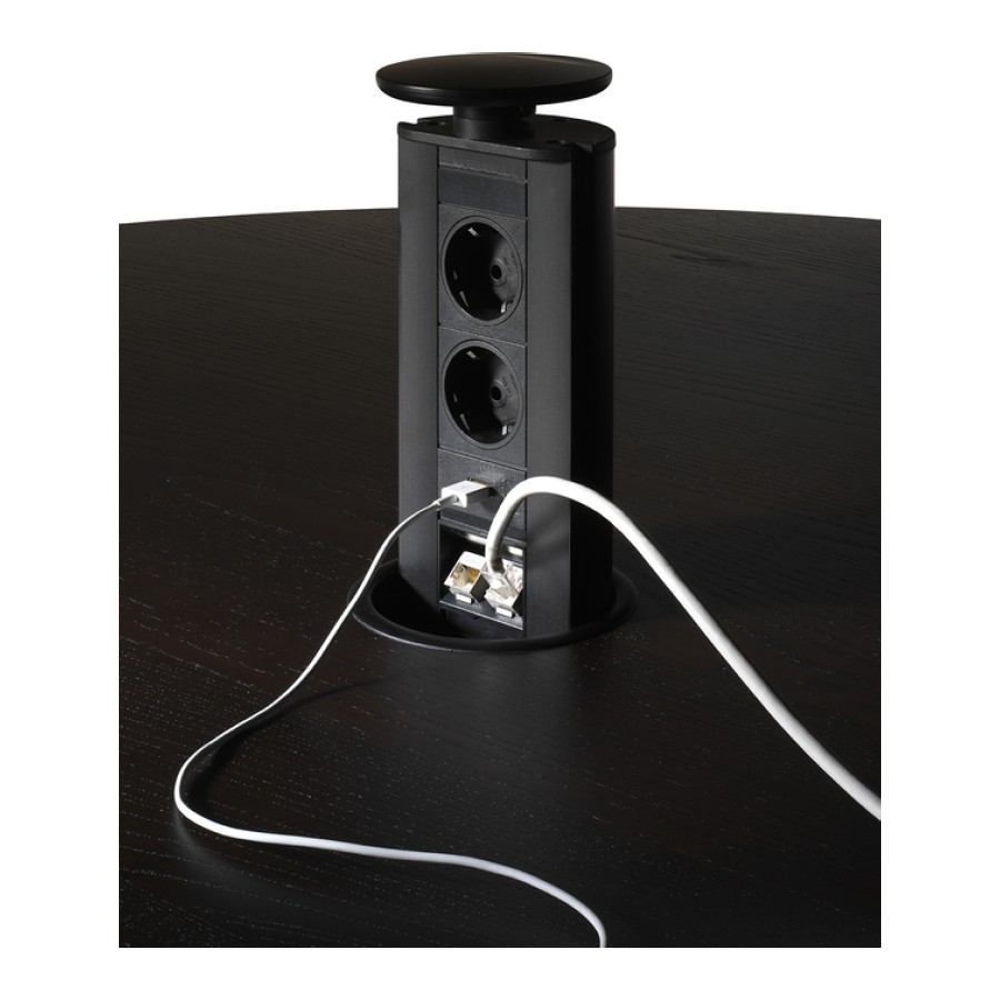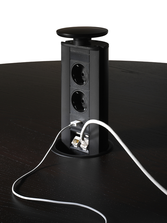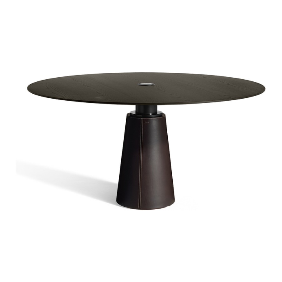 The Mesa Due tables with leather or saddle leather column and top in wood or upholstered in Pelle Frau® leather can come with a hideaway electric socket tower, chosen and requested by the customer upon purchase.