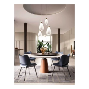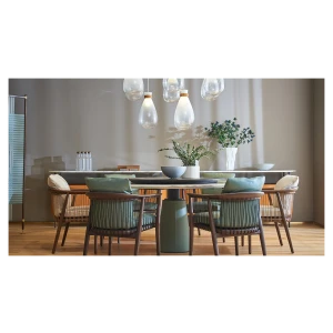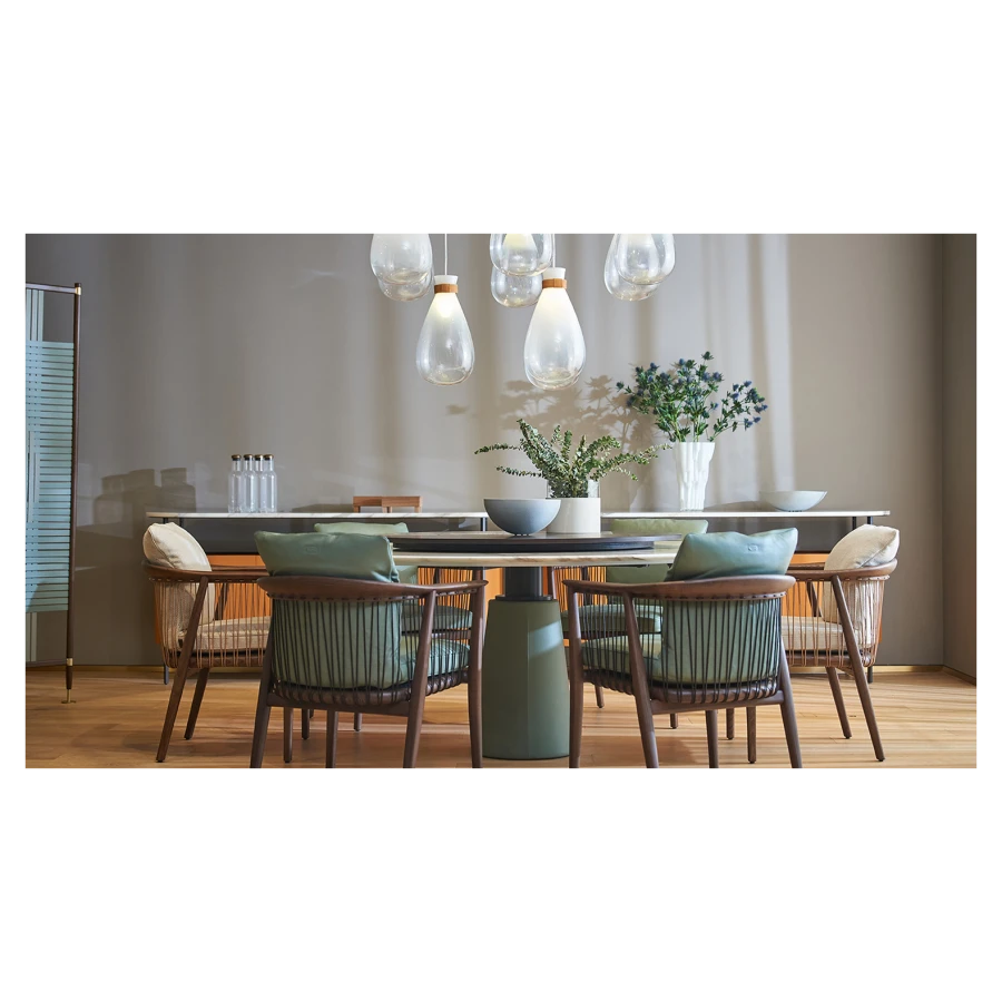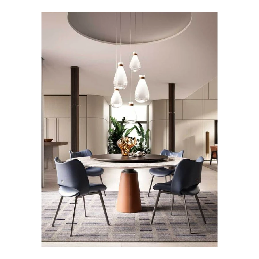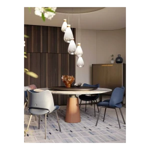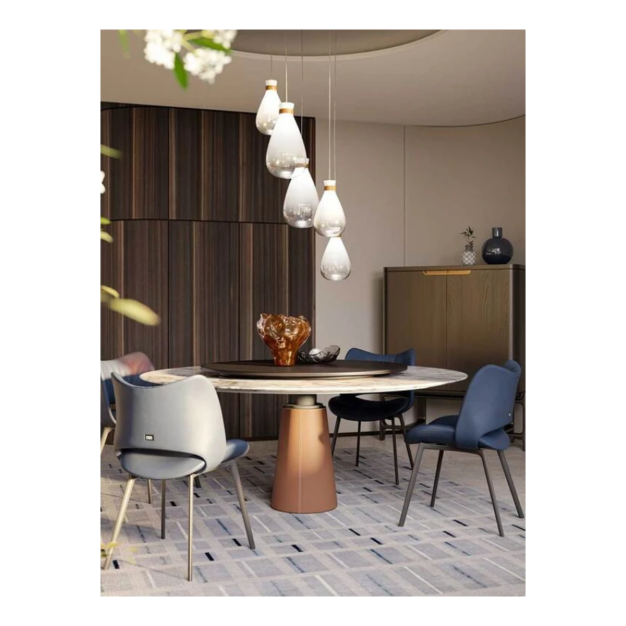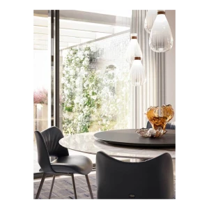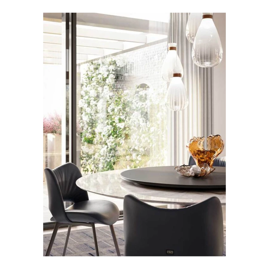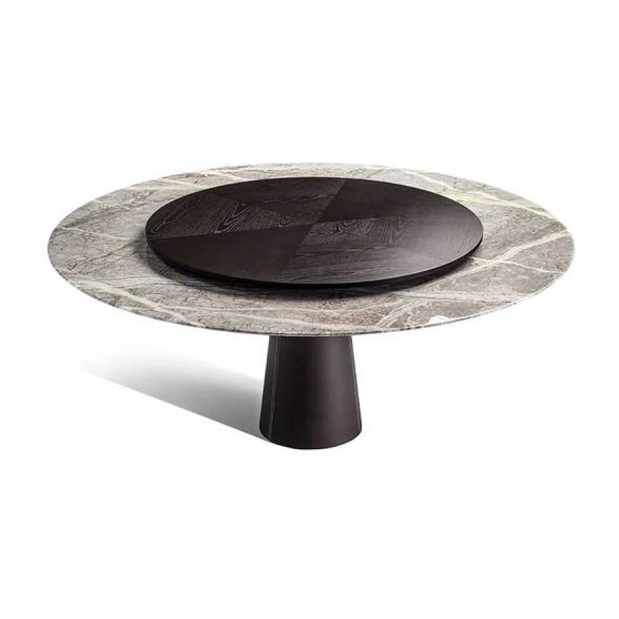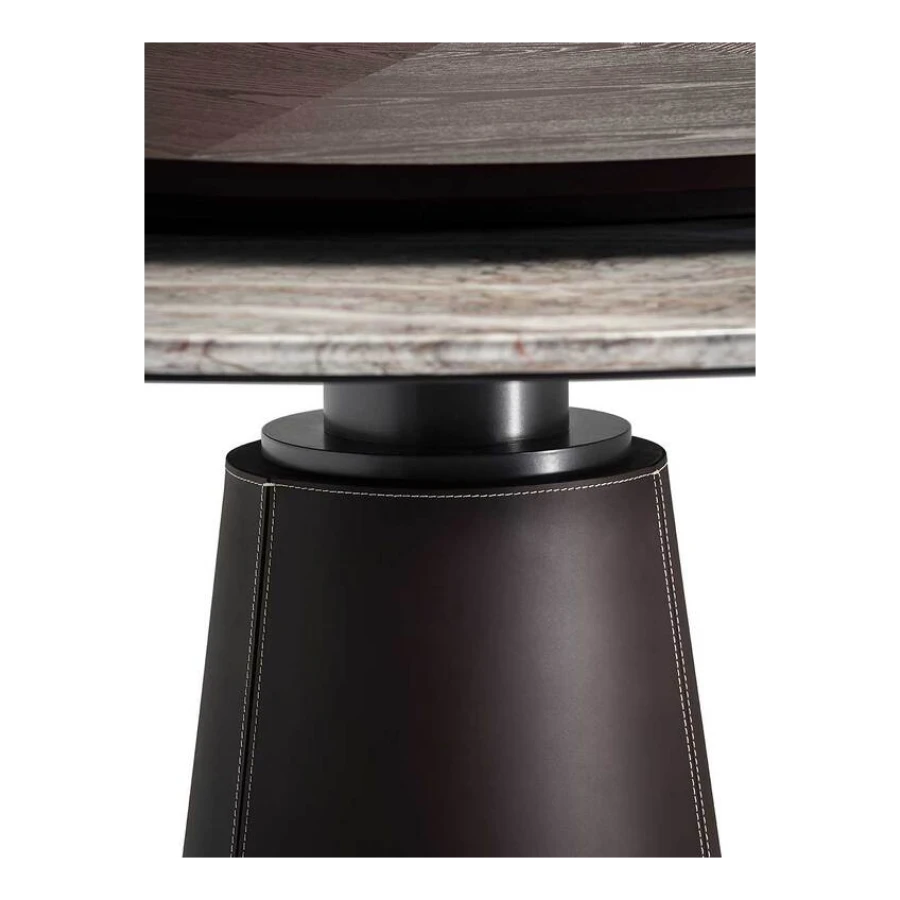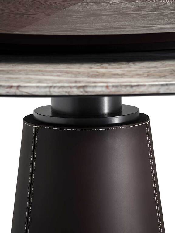 The base of the Mesa Due table can be in grey pietra serena or in steel with upholstery in Cuoio Saddle Extra leather with contrast stitching or Pelle Frau® ColorSphere® with tone-on-tone stitching. The steel base maintains its stability through a special system of internal counterweights and has a plastic shaped tip at the bottom to protect the floor. The joint between the top and the column is made of black painted tubular steel to which a three-bracket joint plate is attached with adjustable supports to keep the surface level. In the rectangular table there are two supporting columns and the joint plates have 3 brackets. Only in the round 150 and 180 cm tables with marble top is there a larger support with five-bracket joint plate.