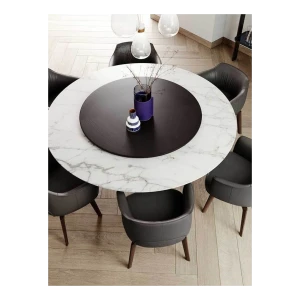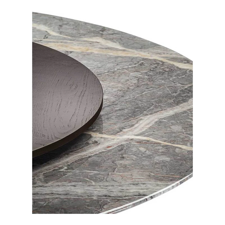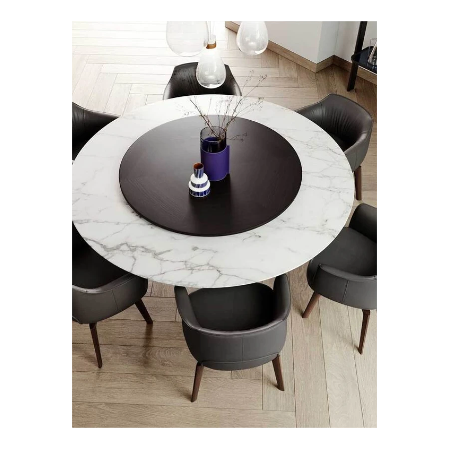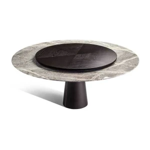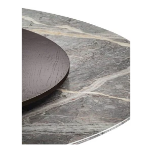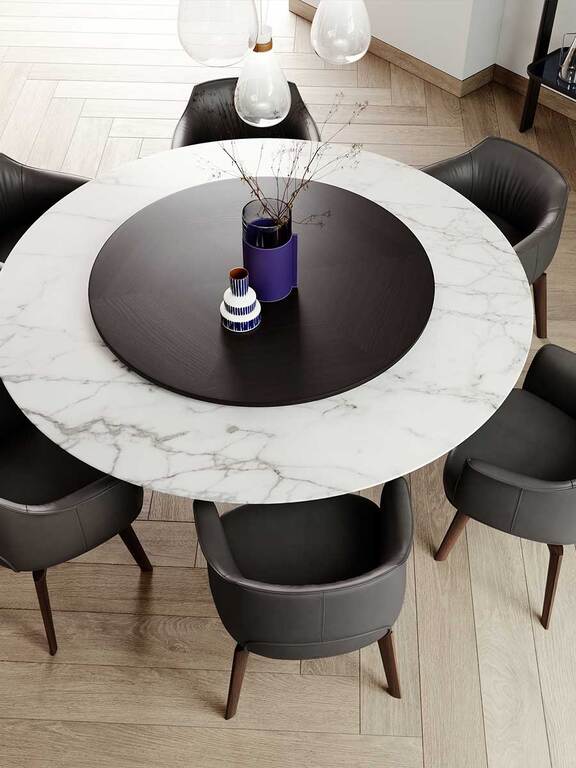 The 180 cm round table can be assembled with a Lazy Susan consisting of two round tops of different diameters. In this case an aluminium swivel mechanism on steel spheres is fitted between the two surfaces.