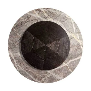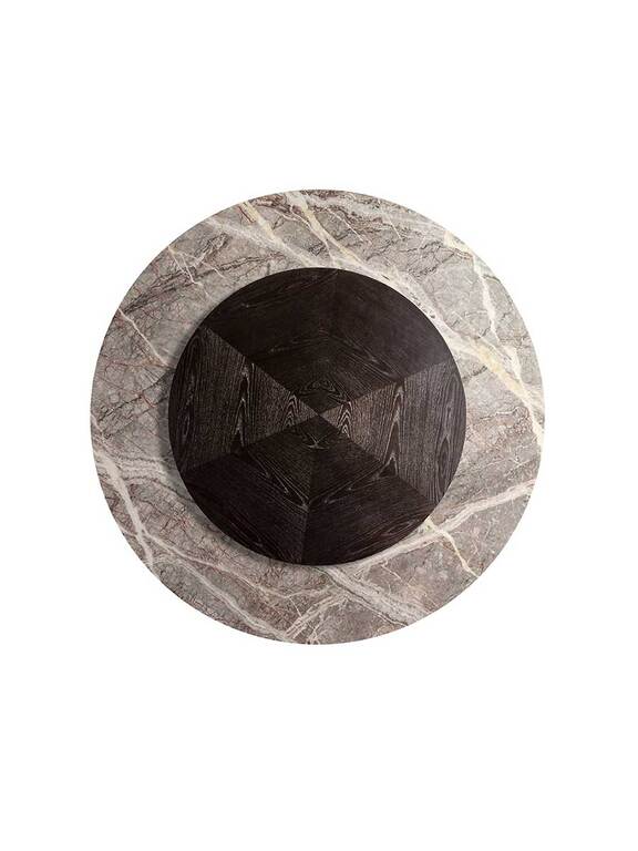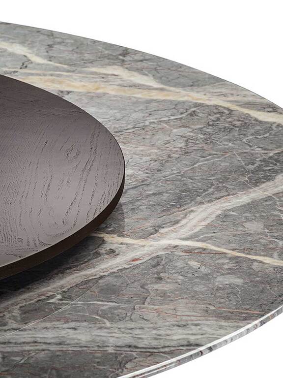 The top is available in numerous versions ranging from wood to leather and through to marble. The wood versions are veneered in cut ash wood with moka or wenge stain finish. The 120 and 150 cm round tables can also be upholstered with Pelle Frau® SC leather. In this case the top is made from double panelling with tapered edge. The bottom part is finished with texturised black paint, the top part upholstered in leather. With the exception of the bistro table, all of the other models can be fitted with a Calacatta gold or Fior di Pesco marble top with polished or semi-polished finish.