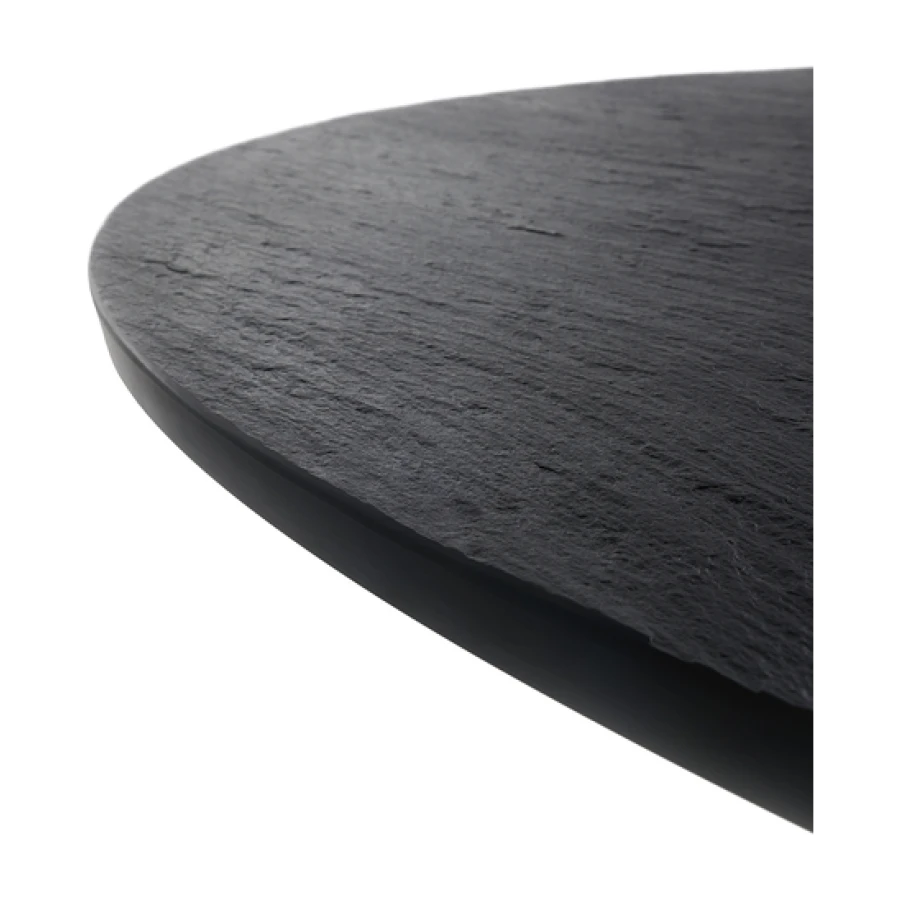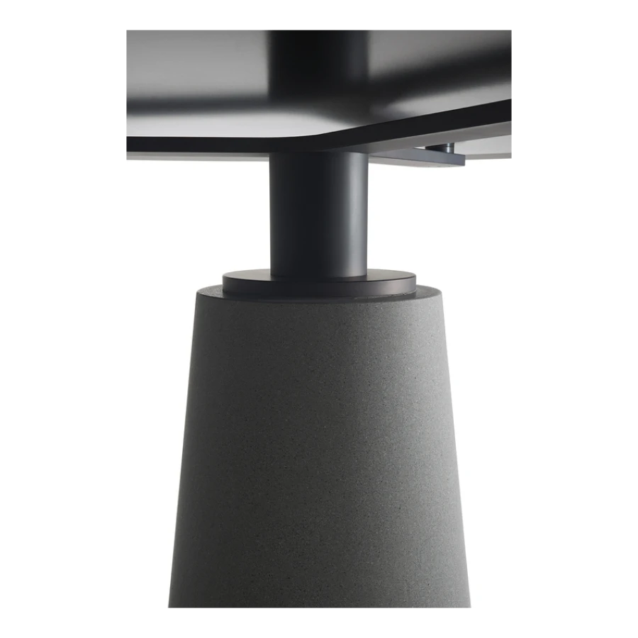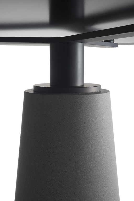 The Mesa table has a Ligurian slate top which, thanks to the traditional splitting technique, maintains the rock’s natural grooves and lines on the surface. A lower shelf in burnished steel sheet metal provides further stability and resistance. The load bearing column is in grey pietra serena with a plastic shaped tip inserted in the base. The joint between the top and the column is made of tubular burnished steel to which a three-bracket joint plate is attached so it is possible to alter the position of the top.